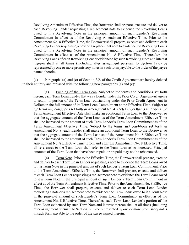 Revolving Amendment Effective Time, the Borrower shall prepare, execute and deliver to each Revolving Lender requesting a replacement note to evidence the Revolving Loans owed to it a Revolving Note in the principal amount of such Lender’s Revolving Commitment in effect as of the Revolving Amendment Effective Time. Prior to the Amendment No. 8 Effective Time, the Borrower shall prepare, execute and deliver to each Revolving Lender requesting a note or a replacement note to evidence the Revolving Loans owed to it a Revolving Note in the principal amount of such Lender’s Revolving Commitment in effect as of the Amendment No. 8 Effective Time. Thereafter, the Revolving Loans of each Revolving Lender evidenced by such Revolving Note and interest thereon shall at all times (including after assignment pursuant to Section 12.6) be represented by one or more promissory notes in such form payable to the order of the payee named therein. (e) Paragraphs (a) and (e) of Section 2.2. of the Credit Agreement are hereby deleted in their entirety and replaced with the following new paragraphs (a) and (e): (a) Funding of the Term Loan. Subject to the terms and conditions set forth herein, each Term Loan Lender that was a Lender under the Prior Credit Agreement agrees to retain its portion of the Term Loan outstanding under the Prior Credit Agreement in Dollars in the full amount of its Term Loan Commitment at the Effective Time. Subject to the terms and conditions set forth in Amendment No. 4, each Lender that is a Lender a the Term Amendment Effective Date shall make an additional Term Loan to the Borrower so that the aggregate amount of the Term Loan as of the Term Amendment Effective Time shall be increased to the amount of such Term Lender’s Term Loan Commitment as of the Term Amendment Effective Time. Subject to the terms and conditions set forth in Amendment No. 8, each Lender shall make an additional Term Loan to the Borrower so that the aggregate amount of the Term Loan as of the Amendment No. 8 Effective Time shall be increased to the amount of such Term Lender’s Term Loan Commitment as of the Amendment No. 8 Effective Time. From and after the Amendment No. 8 Effective Time, all references to the Term Loan shall refer to the Term Loan as so increased. Principal amounts of the Term Loan that have been repaid or prepaid may not be reborrowed. (e) Term Note. Prior to the Effective Time, the Borrower shall prepare, execute and deliver to each Term Loan Lender requesting a note to evidence the Term Loans owed to it a Term Note in the principal amount of such Lender’s Term Loan Commitment. Prior to the Term Amendment Effective Time, the Borrower shall prepare, execute and deliver to each Term Loan Lender requesting a replacement note to evidence the Term Loans owed to it a Term Note in the principal amount of such Lender’s Term Loan Commitment in effect as of the Term Amendment Effective Time. Prior to the Amendment No. 8 Effective Time, the Borrower shall prepare, execute and deliver to each Term Loan Lender requesting a note or a replacement note to evidence the Term Loans owed to it a Term Note in the principal amount of such Lender’s Term Loan Commitment in effect as of the Amendment No. 8 Effective Time. Thereafter, such Term Loan Lender’s portion of the Term Loan evidenced by such Term Note and interest thereon shall at all times (including after assignment pursuant to Section 12.6) be represented by one or more promissory notes in such form payable to the order of the payee named therein. 5