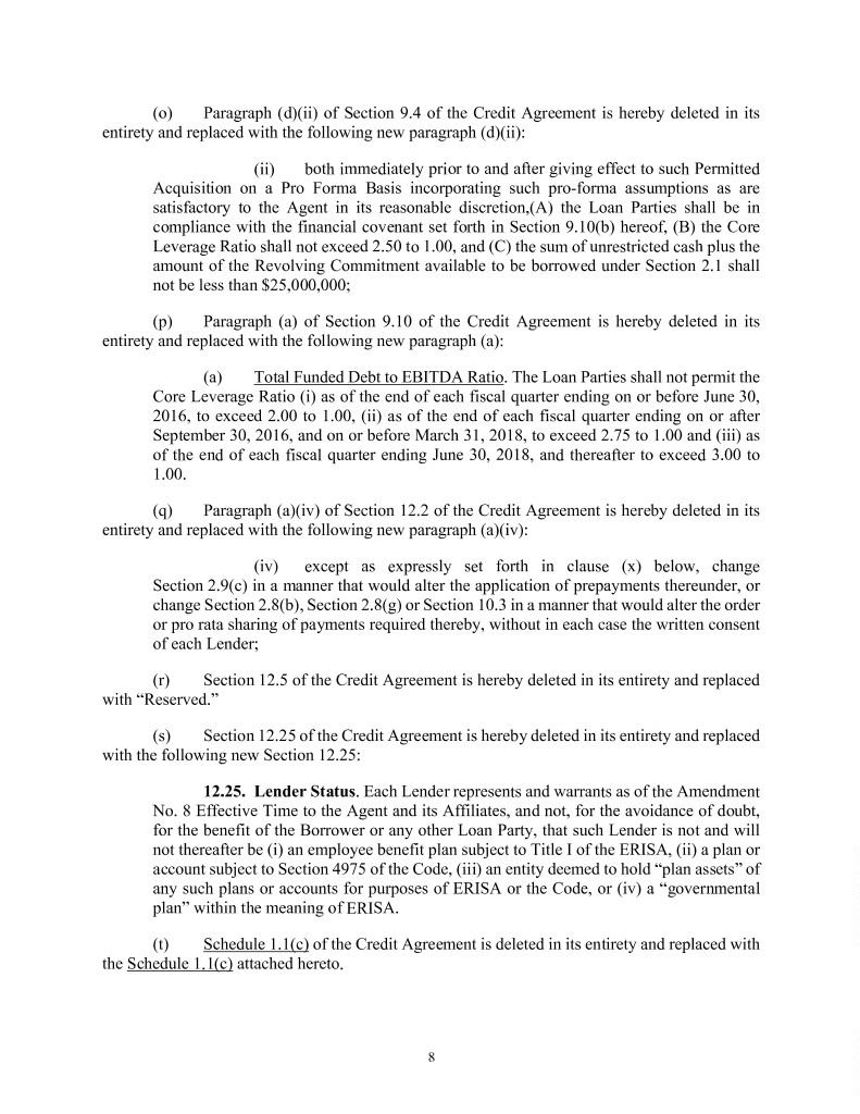 (o) Paragraph (d)(ii) of Section 9.4 of the Credit Agreement is hereby deleted in its entirety and replaced with the following new paragraph (d)(ii): (ii) both immediately prior to and after giving effect to such Permitted Acquisition on a Pro Forma Basis incorporating such pro-forma assumptions as are satisfactory to the Agent in its reasonable discretion,(A) the Loan Parties shall be in compliance with the financial covenant set forth in Section 9.10(b) hereof, (B) the Core Leverage Ratio shall not exceed 2.50 to 1.00, and (C) the sum of unrestricted cash plus the amount of the Revolving Commitment available to be borrowed under Section 2.1 shall not be less than $25,000,000; (p) Paragraph (a) of Section 9.10 of the Credit Agreement is hereby deleted in its entirety and replaced with the following new paragraph (a): (a) Total Funded Debt to EBITDA Ratio. The Loan Parties shall not permit the Core Leverage Ratio (i) as of the end of each fiscal quarter ending on or before June 30, 2016, to exceed 2.00 to 1.00, (ii) as of the end of each fiscal quarter ending on or after September 30, 2016, and on or before March 31, 2018, to exceed 2.75 to 1.00 and (iii) as of the end of each fiscal quarter ending June 30, 2018, and thereafter to exceed 3.00 to 1.00. (q) Paragraph (a)(iv) of Section 12.2 of the Credit Agreement is hereby deleted in its entirety and replaced with the following new paragraph (a)(iv): (iv) except as expressly set forth in clause (x) below, change Section 2.9(c) in a manner that would alter the application of prepayments thereunder, or change Section 2.8(b), Section 2.8(g) or Section 10.3 in a manner that would alter the order or pro rata sharing of payments required thereby, without in each case the written consent of each Lender; (r) Section 12.5 of the Credit Agreement is hereby deleted in its entirety and replaced with “Reserved.” (s) Section 12.25 of the Credit Agreement is hereby deleted in its entirety and replaced with the following new Section 12.25: 12.25. Lender Status. Each Lender represents and warrants as of the Amendment No. 8 Effective Time to the Agent and its Affiliates, and not, for the avoidance of doubt, for the benefit of the Borrower or any other Loan Party, that such Lender is not and will not thereafter be (i) an employee benefit plan subject to Title I of the ERISA, (ii) a plan or account subject to Section 4975 of the Code, (iii) an entity deemed to hold “plan assets” of any such plans or accounts for purposes of ERISA or the Code, or (iv) a “governmental plan” within the meaning of ERISA. (t) Schedule 1.1(c) of the Credit Agreement is deleted in its entirety and replaced with the Schedule 1.1(c) attached hereto. 8