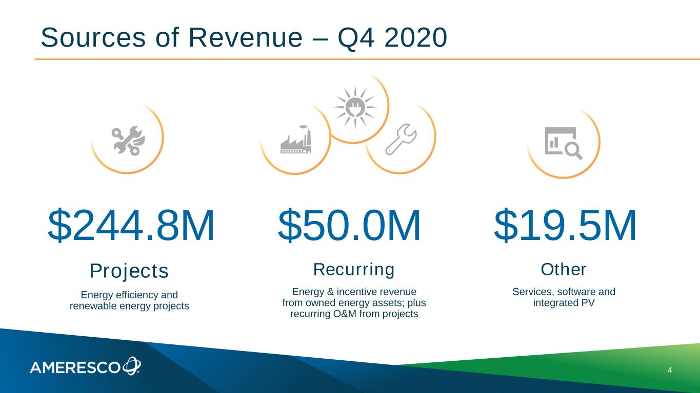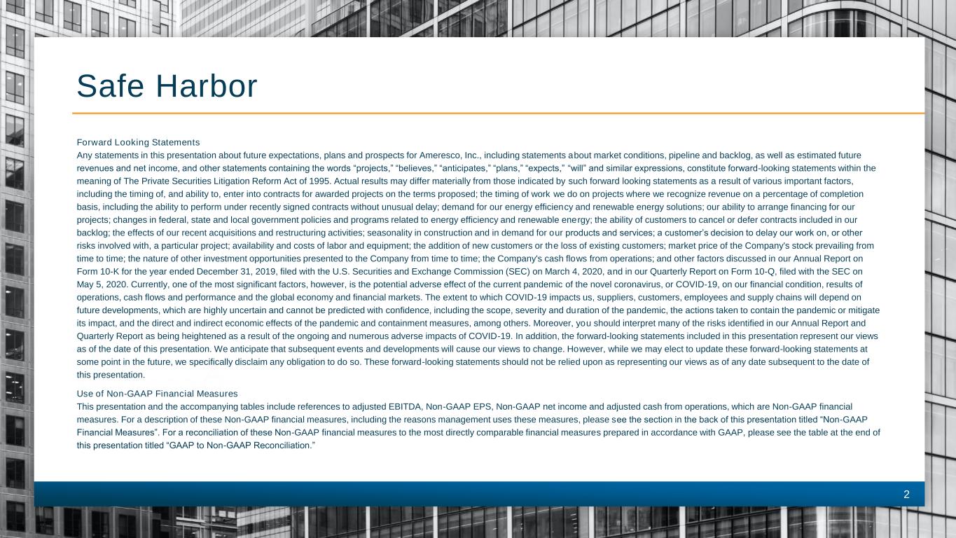 2 Safe Harbor Forward Looking Statements Any statements in this presentation about future expectations, plans and prospects for Ameresco, Inc., including statements about market conditions, pipeline and backlog, as well as estimated future revenues and net income, and other statements containing the words “projects,” “believes,” “anticipates,” “plans,” “expects,” “will” and similar expressions, constitute forward-looking statements within the meaning of The Private Securities Litigation Reform Act of 1995. Actual results may differ materially from those indicated by such forward looking statements as a result of various important factors, including the timing of, and ability to, enter into contracts for awarded projects on the terms proposed; the timing of work we do on projects where we recognize revenue on a percentage of completion basis, including the ability to perform under recently signed contracts without unusual delay; demand for our energy efficiency and renewable energy solutions; our ability to arrange financing for our projects; changes in federal, state and local government policies and programs related to energy efficiency and renewable energy; the ability of customers to cancel or defer contracts included in our backlog; the effects of our recent acquisitions and restructuring activities; seasonality in construction and in demand for our products and services; a customer’s decision to delay our work on, or other risks involved with, a particular project; availability and costs of labor and equipment; the addition of new customers or the loss of existing customers; market price of the Company's stock prevailing from time to time; the nature of other investment opportunities presented to the Company from time to time; the Company's cash flows from operations; and other factors discussed in our Annual Report on Form 10-K for the year ended December 31, 2019, filed with the U.S. Securities and Exchange Commission (SEC) on March 4, 2020, and in our Quarterly Report on Form 10-Q, filed with the SEC on May 5, 2020. Currently, one of the most significant factors, however, is the potential adverse effect of the current pandemic of the novel coronavirus, or COVID-19, on our financial condition, results of operations, cash flows and performance and the global economy and financial markets. The extent to which COVID-19 impacts us, suppliers, customers, employees and supply chains will depend on future developments, which are highly uncertain and cannot be predicted with confidence, including the scope, severity and duration of the pandemic, the actions taken to contain the pandemic or mitigate its impact, and the direct and indirect economic effects of the pandemic and containment measures, among others. Moreover, you should interpret many of the risks identified in our Annual Report and Quarterly Report as being heightened as a result of the ongoing and numerous adverse impacts of COVID-19. In addition, the forward-looking statements included in this presentation represent our views as of the date of this presentation. We anticipate that subsequent events and developments will cause our views to change. However, while we may elect to update these forward-looking statements at some point in the future, we specifically disclaim any obligation to do so. These forward-looking statements should not be relied upon as representing our views as of any date subsequent to the date of this presentation. Use of Non-GAAP Financial Measures This presentation and the accompanying tables include references to adjusted EBITDA, Non-GAAP EPS, Non-GAAP net income and adjusted cash from operations, which are Non-GAAP financial measures. For a description of these Non-GAAP financial measures, including the reasons management uses these measures, please see the section in the back of this presentation titled “Non-GAAP Financial Measures”. For a reconciliation of these Non-GAAP financial measures to the most directly comparable financial measures prepared in accordance with GAAP, please see the table at the end of this presentation titled “GAAP to Non-GAAP Reconciliation.”