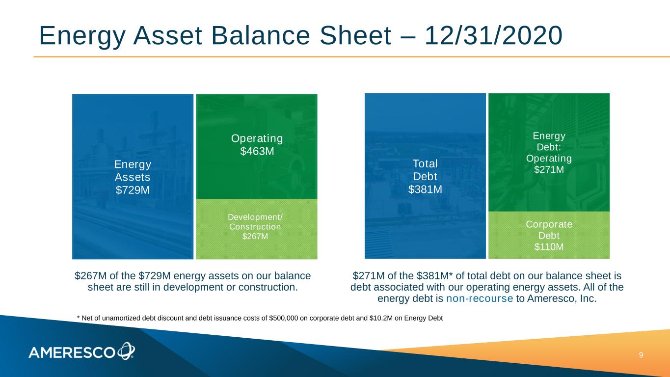 Energy Asset Portfolio – 12/31/2020 8 282 MWe of Energy Assets. Renewable Gas is 129 MWe, Solar is 147 MW, Other is 6 MW* 351 MWe in development & construction. Renewable Gas is 114 MWe, Solar is 217 MW, Energy as a Service is 21 MW* Operating Energy Assets 282 MWe Other: 2% Solar: 52% RNG: 9% LFG Direct Use: 9% LFG to Electricity: 28% Energy Assets in Development & Construction 351 MWe EAAS: 6% Solar: 62% RNG: 32% * Numbers may not sum due to rounding
