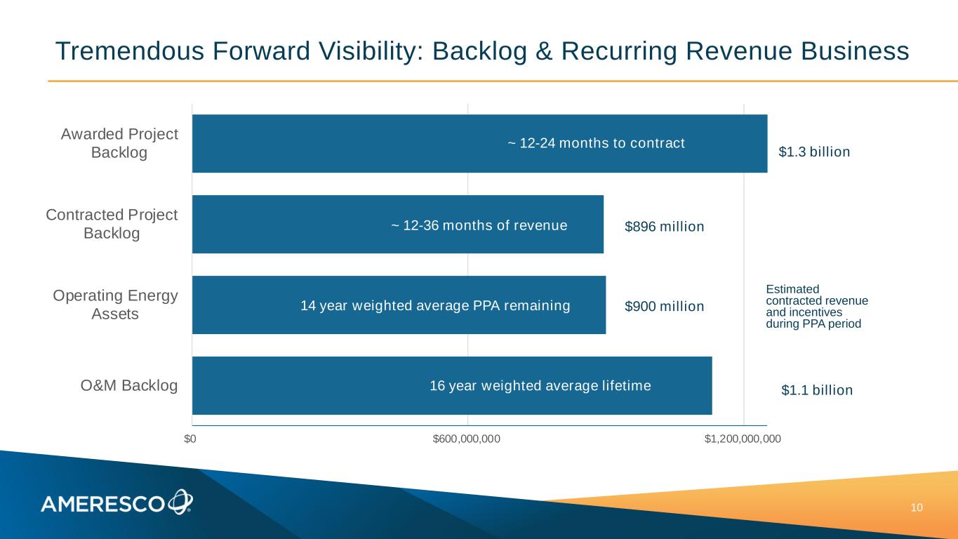 $0 $600,000,000 $1,200,000,000 Awarded Project Backlog Contracted Project Backlog Operating Energy Assets O&M Backlog Tremendous Forward Visibility: Backlog & Recurring Revenue Business 10 ~ 12-24 months to contract ~ 12-36 months of revenue 14 year weighted average PPA remaining 16 year weighted average lifetime Estimated contracted revenue and incentives during PPA period $1.3 billion $896 million $900 million $1.1 billion