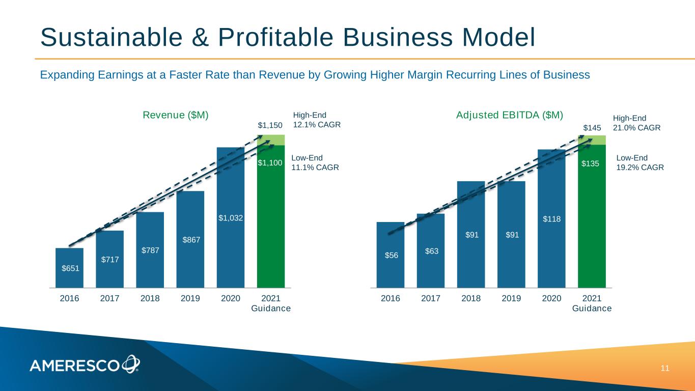 Enabling a Low Carbon Future Since 2010, Ameresco’s renewable energy assets & customer projects delivered a Carbon Offset equivalent to: Greenhouse gas emissions from… 31.4 billion miles driven by an average passenger vehicle Carbon sequestered by… 16.5 million acres of U.S. forests in one year or Data estimated based on assets owned and operating as of 12/31/2020 and customer projects as of 12/31/2019 to represent carbon impact through 2020. 60+ Million Metric Tons of CO2 Ameresco’s 2020 Carbon Offset of approximately 12.6M Metric Tons of CO2 is equal to one of… 2.1M 2.8M 3.8M 4.9M 5.9M 7.1M 8.3M 9.7M 11.2M 12.6M 0 2,000,000 4,000,000 6,000,000 8,000,000 10,000,000 12,000,000 14,000,000 2011 2012 2013 2014 2015 2016 2017 2018 2019 2020 Aggregate Metric Tons of CO2 Avoided Per Year 12