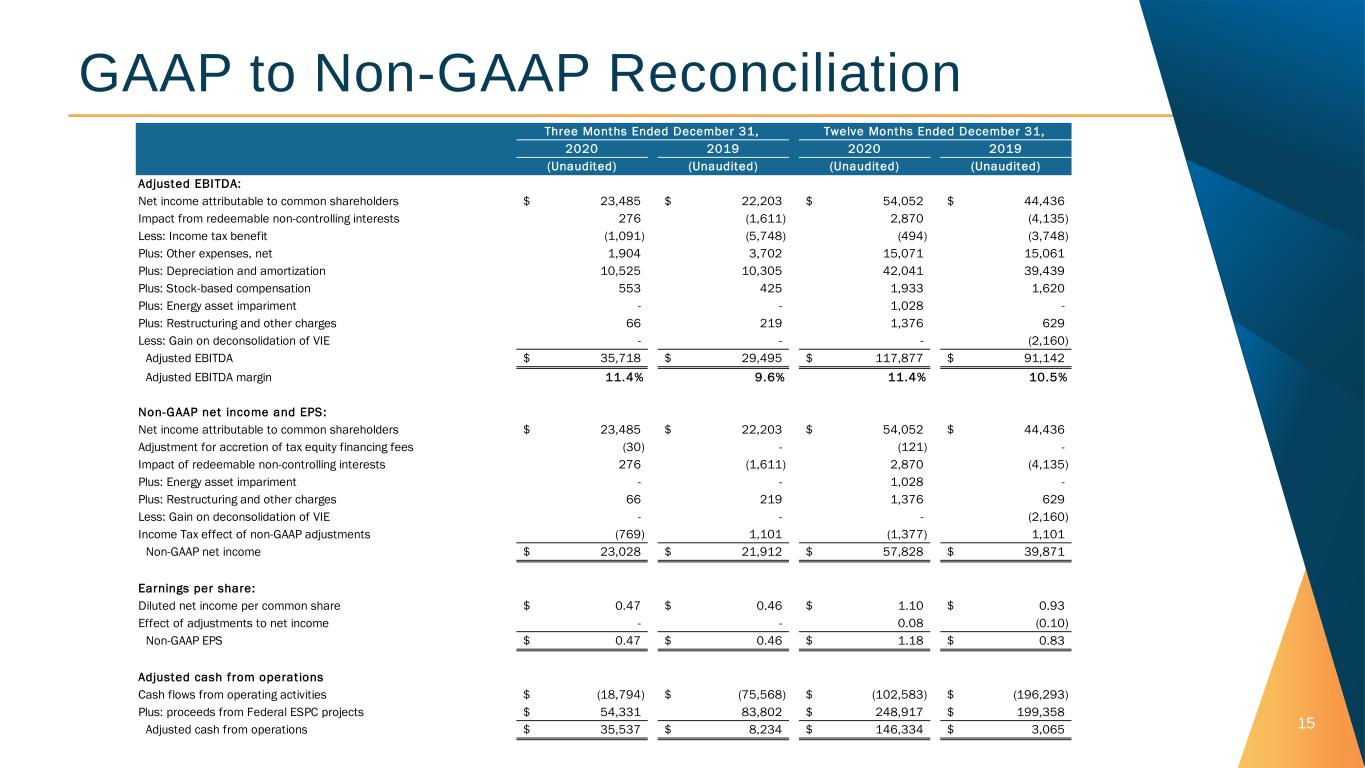 GAAP to Non-GAAP Reconciliation 15 (Unaudited) (Unaudited) (Unaudited) (Unaudited) Adjusted EBITDA: Net income attributable to common shareholders 23,485$ 22,203$ 54,052$ 44,436$ Impact from redeemable non-controlling interests 276 (1,611) 2,870 (4,135) Less: Income tax benefit (1,091) (5,748) (494) (3,748) Plus: Other expenses, net 1,904 3,702 15,071 15,061 Plus: Depreciation and amortization 10,525 10,305 42,041 39,439 Plus: Stock-based compensation 553 425 1,933 1,620 Plus: Energy asset impariment - - 1,028 - Plus: Restructuring and other charges 66 219 1,376 629 Less: Gain on deconsolidation of VIE - - - (2,160) Adjusted EBITDA 35,718$ 29,495$ 117,877$ 91,142$ Adjusted EBITDA margin 11.4% 9.6% 11.4% 10.5% Revenue 314,319 306,612 1,032,275 866,933 Non-GAAP net income and EPS: Net income attributable to common shareholders 23,485$ 22,203$ 54,052$ 44,436$ Adjustment for accretion of tax equity financing fees (30) - (121) - Impact of redeemable non-controlling interests 276 (1,611) 2,870 (4,135) Plus: Energy asset impariment - - 1,028 - Plus: Restructuring and other charges 66 219 1,376 629 Less: Gain on deconsolidation of VIE - - - (2,160) Income Tax effect of non-GAAP adjustments (769) 1,101 (1,377) 1,101 Non-GAAP net income 23,028$ 21,912$ 57,828$ 39,871$ Earnings per share: Diluted net income per common share 0.47$ 0.46$ 1.10$ 0.93$ Effect of adjustments to net income - - 0.08 (0.10) Non-GAAP EPS 0.47$ 0.46$ 1.18$ 0.83$ Adjusted cash from operations Cash flows from operating activities (18,794)$ (75,568)$ (102,583)$ (196,293)$ Plus: proceeds from Federal ESPC projects 54,331$ 83,802 248,917$ 199,358$ Adjusted cash from operations 35,537$ 8,234$ 146,334$ 3,065$ 2020 2019 2020 2019 Twelve Months Ended December 31,Three Months Ended December 31,