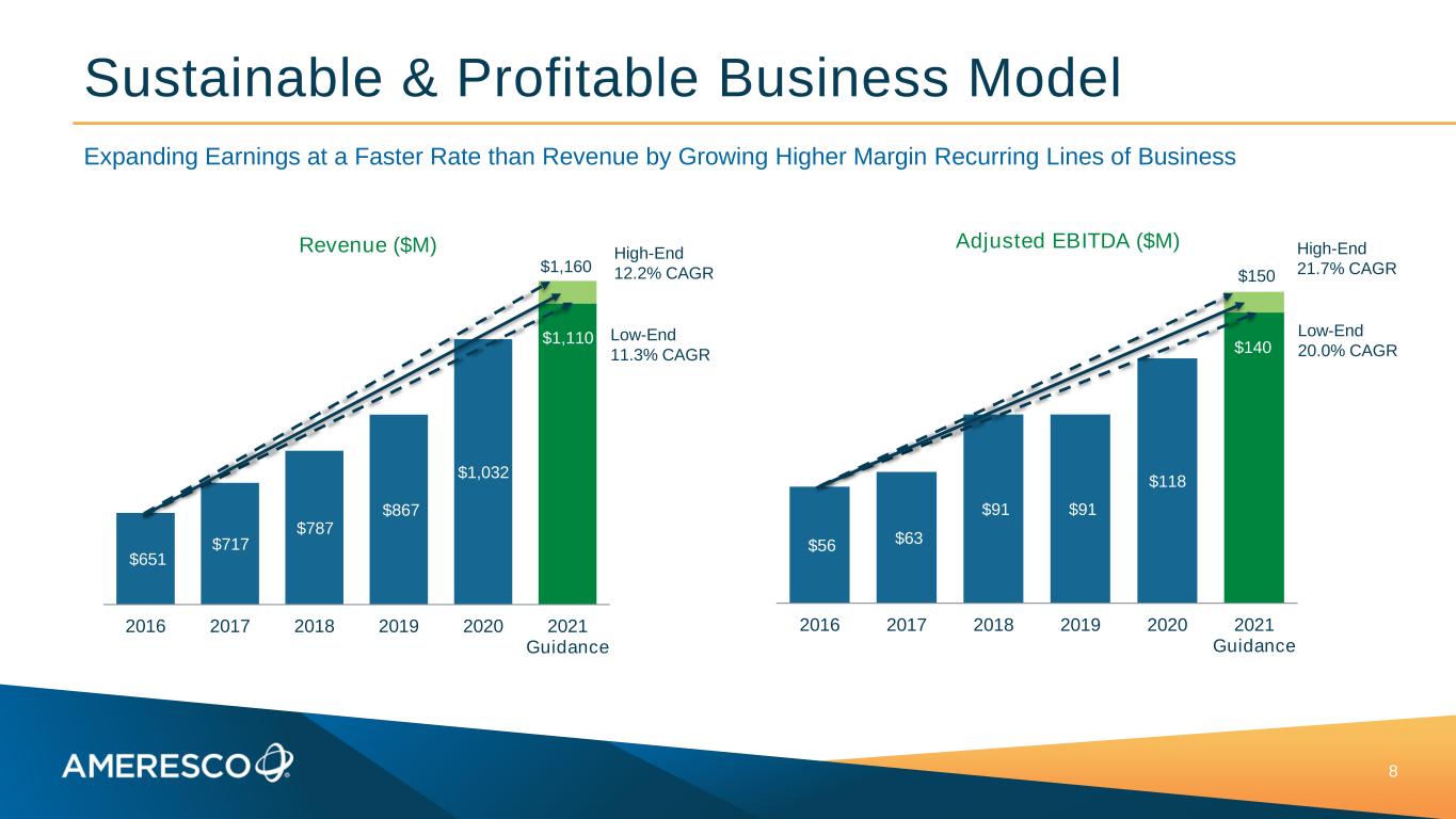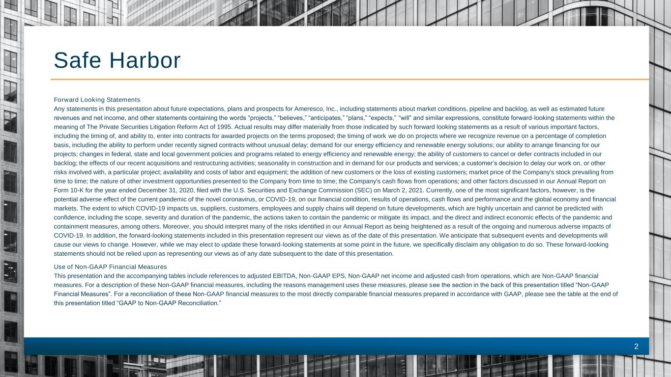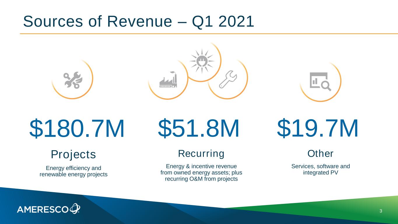 2 Safe Harbor Forward Looking Statements Any statements in this presentation about future expectations, plans and prospects for Ameresco, Inc., including statements about market conditions, pipeline and backlog, as well as estimated future revenues and net income, and other statements containing the words “projects,” “believes,” “anticipates,” “plans,” “expects,” “will” and similar expressions, constitute forward-looking statements within the meaning of The Private Securities Litigation Reform Act of 1995. Actual results may differ materially from those indicated by such forward looking statements as a result of various important factors, including the timing of, and ability to, enter into contracts for awarded projects on the terms proposed; the timing of work we do on projects where we recognize revenue on a percentage of completion basis, including the ability to perform under recently signed contracts without unusual delay; demand for our energy efficiency and renewable energy solutions; our ability to arrange financing for our projects; changes in federal, state and local government policies and programs related to energy efficiency and renewable energy; the ability of customers to cancel or defer contracts included in our backlog; the effects of our recent acquisitions and restructuring activities; seasonality in construction and in demand for our products and services; a customer’s decision to delay our work on, or other risks involved with, a particular project; availability and costs of labor and equipment; the addition of new customers or the loss of existing customers; market price of the Company's stock prevailing from time to time; the nature of other investment opportunities presented to the Company from time to time; the Company's cash flows from operations; and other factors discussed in our Annual Report on Form 10-K for the year ended December 31, 2020, filed with the U.S. Securities and Exchange Commission (SEC) on March 2, 2021. Currently, one of the most significant factors, however, is the potential adverse effect of the current pandemic of the novel coronavirus, or COVID-19, on our financial condition, results of operations, cash flows and performance and the global economy and financial markets. The extent to which COVID-19 impacts us, suppliers, customers, employees and supply chains will depend on future developments, which are highly uncertain and cannot be predicted with confidence, including the scope, severity and duration of the pandemic, the actions taken to contain the pandemic or mitigate its impact, and the direct and indirect economic effects of the pandemic and containment measures, among others. Moreover, you should interpret many of the risks identified in our Annual Report as being heightened as a result of the ongoing and numerous adverse impacts of COVID-19. In addition, the forward-looking statements included in this presentation represent our views as of the date of this presentation. We anticipate that subsequent events and developments will cause our views to change. However, while we may elect to update these forward-looking statements at some point in the future, we specifically disclaim any obligation to do so. These forward-looking statements should not be relied upon as representing our views as of any date subsequent to the date of this presentation. Use of Non-GAAP Financial Measures This presentation and the accompanying tables include references to adjusted EBITDA, Non-GAAP EPS, Non-GAAP net income and adjusted cash from operations, which are Non-GAAP financial measures. For a description of these Non-GAAP financial measures, including the reasons management uses these measures, please see the section in the back of this presentation titled “Non-GAAP Financial Measures”. For a reconciliation of these Non-GAAP financial measures to the most directly comparable financial measures prepared in accordance with GAAP, please see the table at the end of this presentation titled “GAAP to Non-GAAP Reconciliation.”