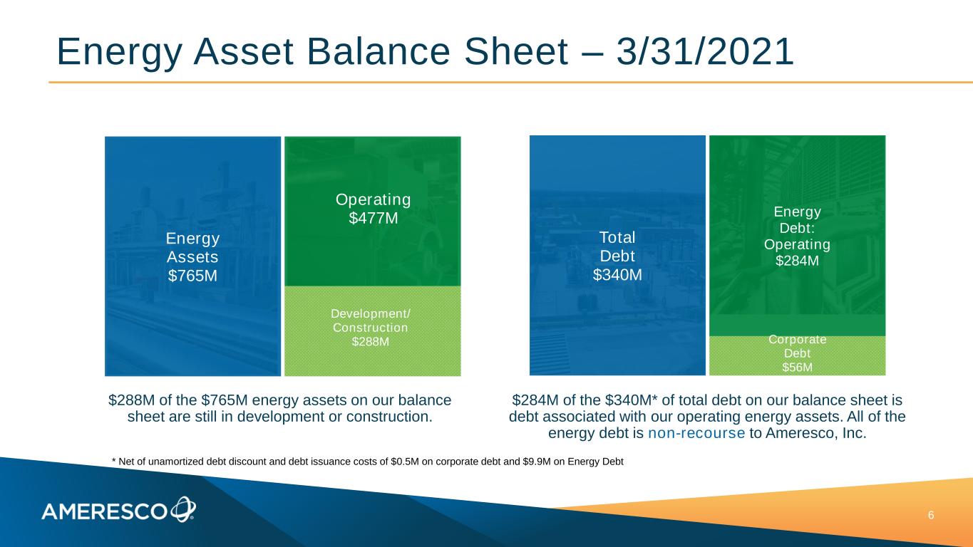 Energy Asset Portfolio – 3/31/2021 5 287 MWe of Energy Assets. 102MW of non-RNG biogas, 27 MW of RNG, Solar is 152 MW, Other is 6 MW* 386 MWe in development & construction. Renewable Gas is 114 MWe, Solar is 251 MW, Energy as a Service is 20 MW* Operating Energy Assets 287 MWe Other: 2% Solar: 53% Biogas: RNG 9% Biogas: Non-RNG 36% Energy Assets in Development & Construction 386 MWe EAAS: 5% Solar: 65% RNG: 30% * Numbers may not sum due to rounding