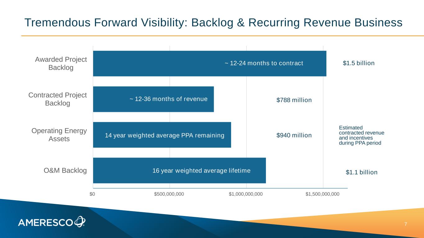 $0 $500,000,000 $1,000,000,000 $1,500,000,000 Awarded Project Backlog Contracted Project Backlog Operating Energy Assets O&M Backlog Tremendous Forward Visibility: Backlog & Recurring Revenue Business 7 ~ 12-24 months to contract ~ 12-36 months of revenue 14 year weighted average PPA remaining 16 year weighted average lifetime Estimated contracted revenue and incentives during PPA period $1.5 billion $788 million $940 million $1.1 billion