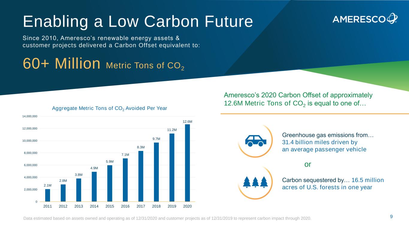 Enabling a Low Carbon Future Since 2010, Ameresco’s renewable energy assets & customer projects delivered a Carbon Offset equivalent to: Greenhouse gas emissions from… 31.4 billion miles driven by an average passenger vehicle Carbon sequestered by… 16.5 million acres of U.S. forests in one year or Data estimated based on assets owned and operating as of 12/31/2020 and customer projects as of 12/31/2019 to represent carbon impact through 2020. 60+ Million Metric Tons of CO2 Ameresco’s 2020 Carbon Offset of approximately 12.6M Metric Tons of CO2 is equal to one of… 2.1M 2.8M 3.8M 4.9M 5.9M 7.1M 8.3M 9.7M 11.2M 12.6M 0 2,000,000 4,000,000 6,000,000 8,000,000 10,000,000 12,000,000 14,000,000 2011 2012 2013 2014 2015 2016 2017 2018 2019 2020 Aggregate Metric Tons of CO2 Avoided Per Year 9