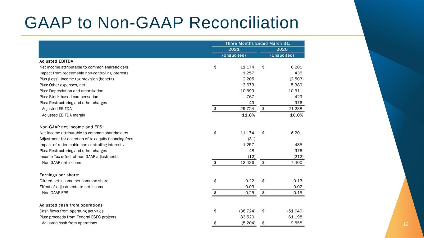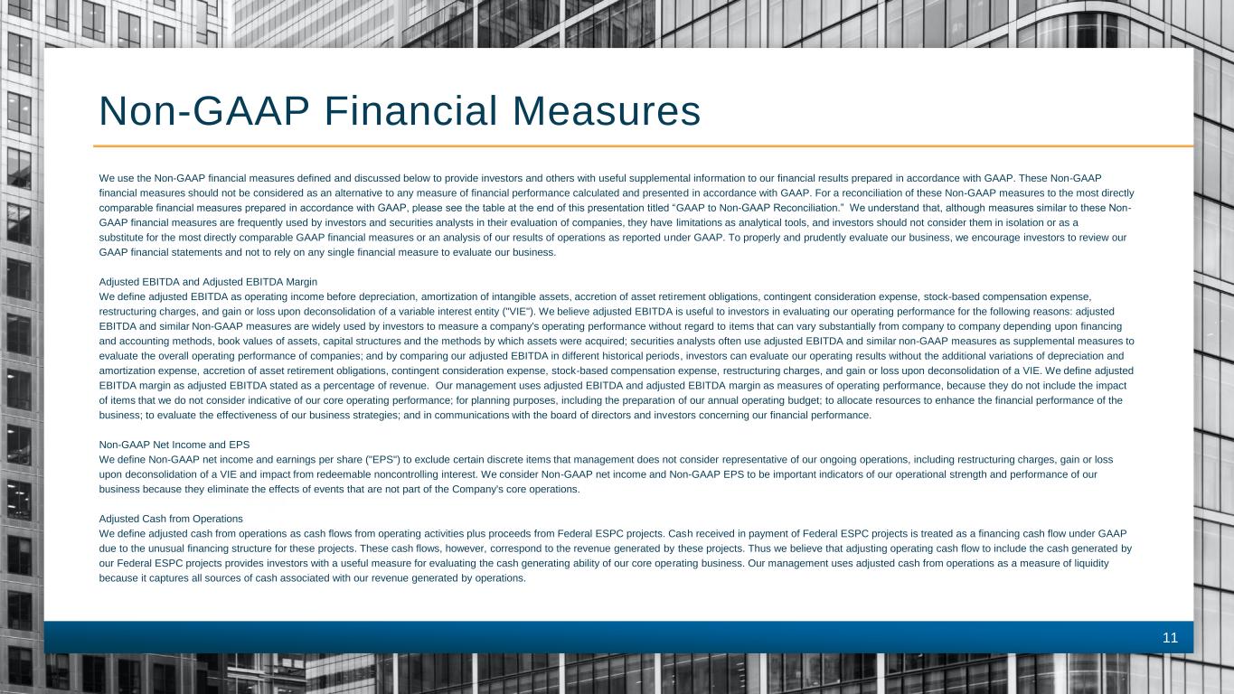 11 Non-GAAP Financial Measures We use the Non-GAAP financial measures defined and discussed below to provide investors and others with useful supplemental information to our financial results prepared in accordance with GAAP. These Non-GAAP financial measures should not be considered as an alternative to any measure of financial performance calculated and presented in accordance with GAAP. For a reconciliation of these Non-GAAP measures to the most directly comparable financial measures prepared in accordance with GAAP, please see the table at the end of this presentation titled “GAAP to Non-GAAP Reconciliation.” We understand that, although measures similar to these Non- GAAP financial measures are frequently used by investors and securities analysts in their evaluation of companies, they have limitations as analytical tools, and investors should not consider them in isolation or as a substitute for the most directly comparable GAAP financial measures or an analysis of our results of operations as reported under GAAP. To properly and prudently evaluate our business, we encourage investors to review our GAAP financial statements and not to rely on any single financial measure to evaluate our business. Adjusted EBITDA and Adjusted EBITDA Margin We define adjusted EBITDA as operating income before depreciation, amortization of intangible assets, accretion of asset retirement obligations, contingent consideration expense, stock-based compensation expense, restructuring charges, and gain or loss upon deconsolidation of a variable interest entity ("VIE"). We believe adjusted EBITDA is useful to investors in evaluating our operating performance for the following reasons: adjusted EBITDA and similar Non-GAAP measures are widely used by investors to measure a company's operating performance without regard to items that can vary substantially from company to company depending upon financing and accounting methods, book values of assets, capital structures and the methods by which assets were acquired; securities analysts often use adjusted EBITDA and similar non-GAAP measures as supplemental measures to evaluate the overall operating performance of companies; and by comparing our adjusted EBITDA in different historical periods, investors can evaluate our operating results without the additional variations of depreciation and amortization expense, accretion of asset retirement obligations, contingent consideration expense, stock-based compensation expense, restructuring charges, and gain or loss upon deconsolidation of a VIE. We define adjusted EBITDA margin as adjusted EBITDA stated as a percentage of revenue. Our management uses adjusted EBITDA and adjusted EBITDA margin as measures of operating performance, because they do not include the impact of items that we do not consider indicative of our core operating performance; for planning purposes, including the preparation of our annual operating budget; to allocate resources to enhance the financial performance of the business; to evaluate the effectiveness of our business strategies; and in communications with the board of directors and investors concerning our financial performance. Non-GAAP Net Income and EPS We define Non-GAAP net income and earnings per share ("EPS") to exclude certain discrete items that management does not consider representative of our ongoing operations, including restructuring charges, gain or loss upon deconsolidation of a VIE and impact from redeemable noncontrolling interest. We consider Non-GAAP net income and Non-GAAP EPS to be important indicators of our operational strength and performance of our business because they eliminate the effects of events that are not part of the Company's core operations. Adjusted Cash from Operations We define adjusted cash from operations as cash flows from operating activities plus proceeds from Federal ESPC projects. Cash received in payment of Federal ESPC projects is treated as a financing cash flow under GAAP due to the unusual financing structure for these projects. These cash flows, however, correspond to the revenue generated by these projects. Thus we believe that adjusting operating cash flow to include the cash generated by our Federal ESPC projects provides investors with a useful measure for evaluating the cash generating ability of our core operating business. Our management uses adjusted cash from operations as a measure of liquidity because it captures all sources of cash associated with our revenue generated by operations.