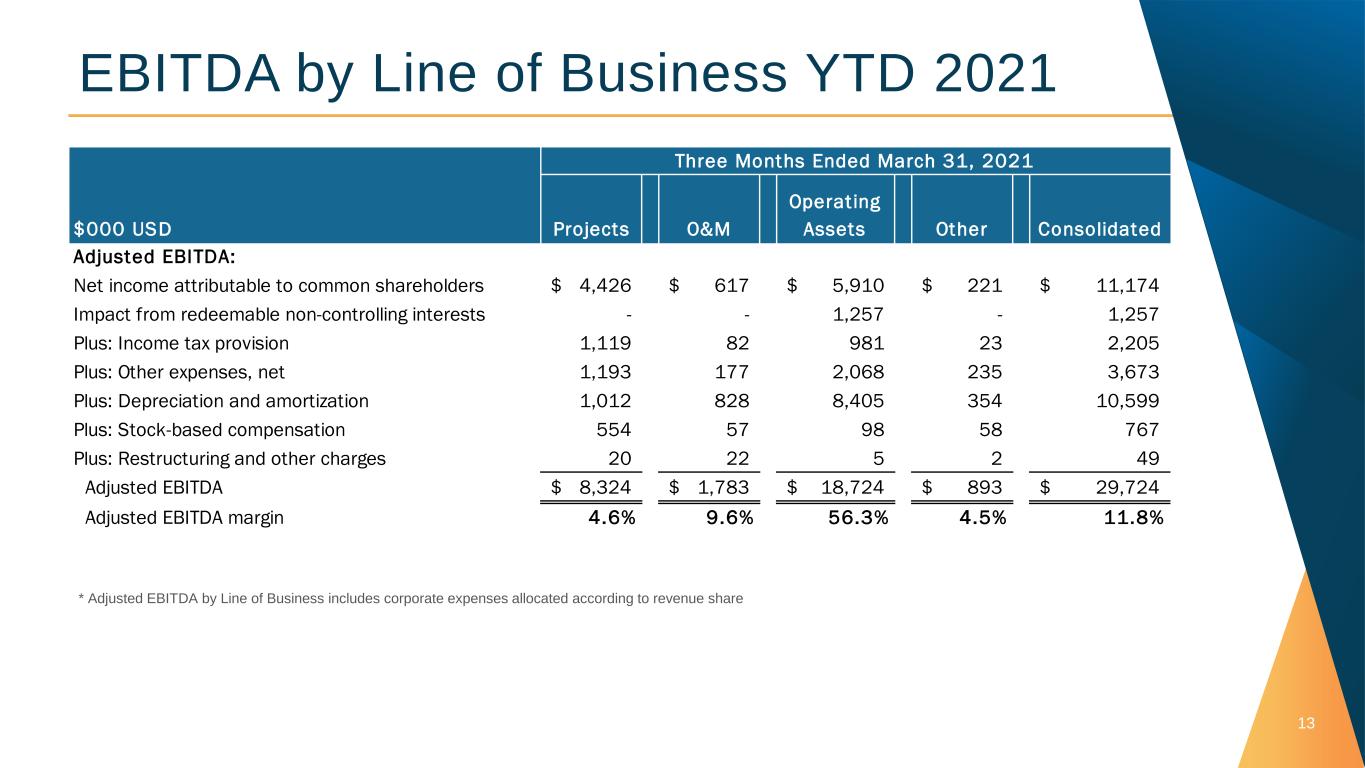 GAAP to Non-GAAP Reconciliation 12 (Unaudited) (Unaudited) Adjusted EBITDA: Net income attributable to common shareholders 11,174$ 6,201$ Impact from redeemable non-controlling interests 1,257 435 Plus (Less): Income tax provision (benefit) 2,205 (2,503) Plus: Other expenses, net 3,673 5,389 Plus: Depreciation and amortization 10,599 10,311 Plus: Stock-based compensation 767 429 Plus: Restructuring and other charges 49 976 Adjusted EBITDA 29,724$ 21,238$ Adjusted EBITDA margin 11.8% 10.0% Revenue 252,203 212,413 Non-GAAP net income and EPS: Net income attributable to common shareholders 11,174$ 6,201$ Adjustment for accretion of tax equity financing fees (31) - Impact of redeemable non-controlling interests 1,257 435 Plus: Restructuring and other charges 48 976 Income Tax effect of non-GAAP adjustments (12) (212) Non-GAAP net income 12,436$ 7,400$ Earnings per share: Diluted net income per common share 0.22$ 0.13$ Effect of adjustments to net income 0.03 0.02 Non-GAAP EPS 0.25$ 0.15$ Adjusted cash from operations Cash flows from operating activities (38,724)$ (51,640)$ Plus: proceeds from Federal ESPC projects 33,520 61,198 Adjusted cash from operations (5,204)$ 9,558$ 2021 2020 Three Months Ended March 31,
