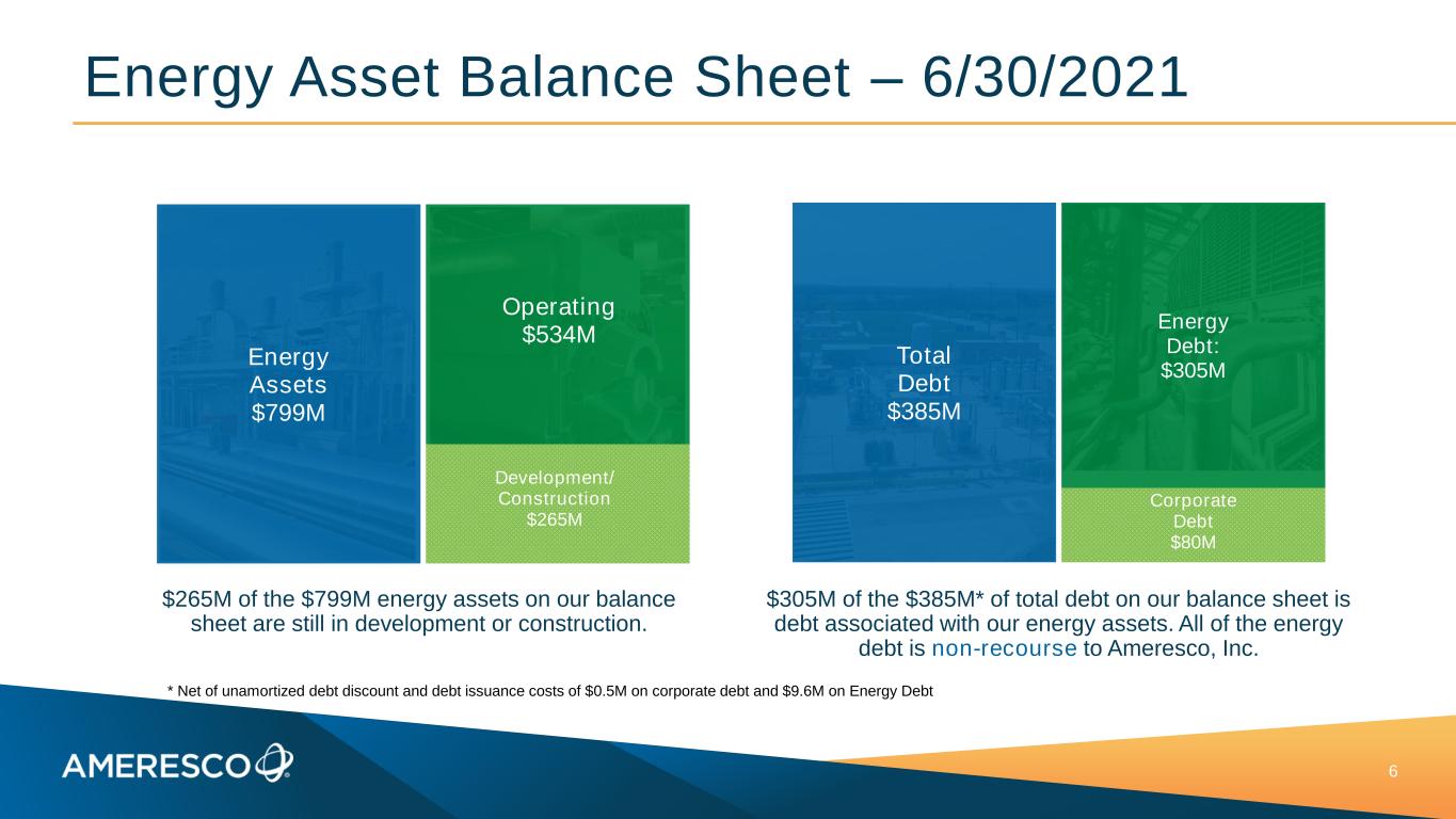 Energy Asset Portfolio – 6/30/2021 5 315 MWe of Energy Assets. 97 MWe of non-RNG biogas, 38 MWe of RNG, Solar is 172 MW, Other is 8 MW* 376 MWe in development & construction. Renewable Gas is 113 MWe, Solar is 243 MW, Energy as a Service is 20 MW* Operating Energy Assets 315 MWe Other: 3% Solar: 55% Biogas: RNG 12% Biogas: Non-RNG 31% Energy Assets in Development & Construction 376 MWe EAAS: 5% Solar: 65% RNG: 30% * Numbers may not sum due to rounding