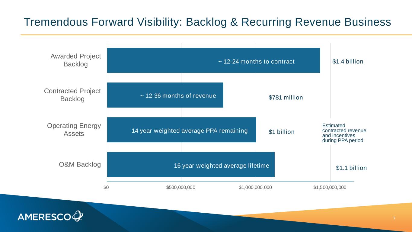 $0 $500,000,000 $1,000,000,000 $1,500,000,000 Awarded Project Backlog Contracted Project Backlog Operating Energy Assets O&M Backlog Tremendous Forward Visibility: Backlog & Recurring Revenue Business 7 ~ 12-24 months to contract ~ 12-36 months of revenue 14 year weighted average PPA remaining 16 year weighted average lifetime Estimated contracted revenue and incentives during PPA period $1.4 billion $781 million $1 billion $1.1 billion