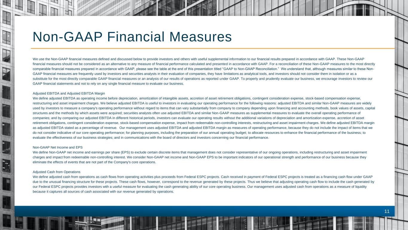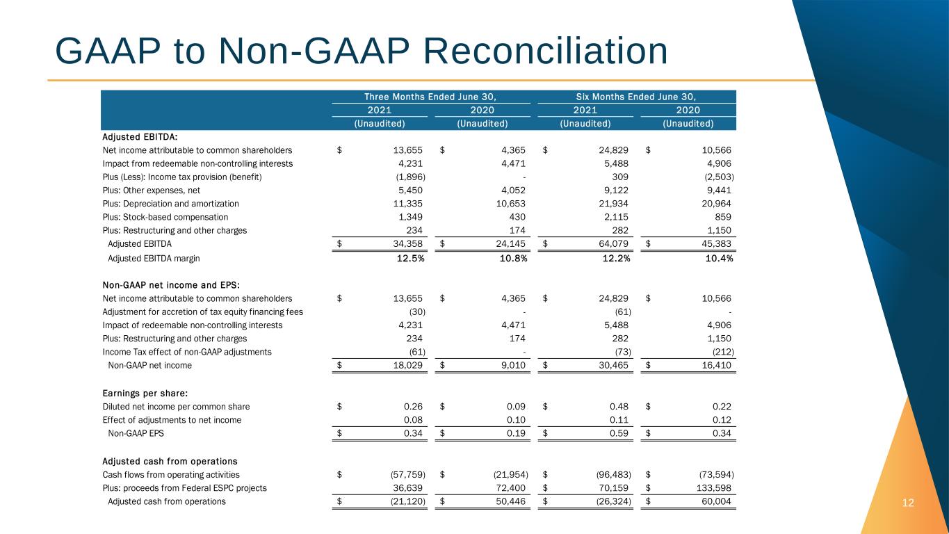 11 Non-GAAP Financial Measures We use the Non-GAAP financial measures defined and discussed below to provide investors and others with useful supplemental information to our financial results prepared in accordance with GAAP. These Non-GAAP financial measures should not be considered as an alternative to any measure of financial performance calculated and presented in accordance with GAAP. For a reconciliation of these Non-GAAP measures to the most directly comparable financial measures prepared in accordance with GAAP, please see the table at the end of this presentation titled “GAAP to Non-GAAP Reconciliation.” We understand that, although measures similar to these Non- GAAP financial measures are frequently used by investors and securities analysts in their evaluation of companies, they have limitations as analytical tools, and investors should not consider them in isolation or as a substitute for the most directly comparable GAAP financial measures or an analysis of our results of operations as reported under GAAP. To properly and prudently evaluate our business, we encourage investors to review our GAAP financial statements and not to rely on any single financial measure to evaluate our business. Adjusted EBITDA and Adjusted EBITDA Margin We define adjusted EBITDA as operating income before depreciation, amortization of intangible assets, accretion of asset retirement obligations, contingent consideration expense, stock-based compensation expense, restructuring and asset impairment charges. We believe adjusted EBITDA is useful to investors in evaluating our operating performance for the following reasons: adjusted EBITDA and similar Non-GAAP measures are widely used by investors to measure a company's operating performance without regard to items that can vary substantially from company to company depending upon financing and accounting methods, book values of assets, capital structures and the methods by which assets were acquired; securities analysts often use adjusted EBITDA and similar Non-GAAP measures as supplemental measures to evaluate the overall operating performance of companies; and by comparing our adjusted EBITDA in different historical periods, investors can evaluate our operating results without the additional variations of depreciation and amortization expense, accretion of asset retirement obligations, contingent consideration expense, stock-based compensation expense, impact from redeemable non-controlling interests, restructuring and asset impairment charges. We define adjusted EBITDA margin as adjusted EBITDA stated as a percentage of revenue. Our management uses adjusted EBITDA and adjusted EBITDA margin as measures of operating performance, because they do not include the impact of items that we do not consider indicative of our core operating performance; for planning purposes, including the preparation of our annual operating budget; to allocate resources to enhance the financial performance of the business; to evaluate the effectiveness of our business strategies; and in communications with the board of directors and investors concerning our financial performance. Non-GAAP Net Income and EPS We define Non-GAAP net income and earnings per share (EPS) to exclude certain discrete items that management does not consider representative of our ongoing operations, including restructuring and asset impairment charges and impact from redeemable non-controlling interest. We consider Non-GAAP net income and Non-GAAP EPS to be important indicators of our operational strength and performance of our business because they eliminate the effects of events that are not part of the Company's core operations. Adjusted Cash from Operations We define adjusted cash from operations as cash flows from operating activities plus proceeds from Federal ESPC projects. Cash received in payment of Federal ESPC projects is treated as a financing cash flow under GAAP due to the unusual financing structure for these projects. These cash flows, however, correspond to the revenue generated by these projects. Thus we believe that adjusting operating cash flow to include the cash generated by our Federal ESPC projects provides investors with a useful measure for evaluating the cash generating ability of our core operating business. Our management uses adjusted cash from operations as a measure of liquidity because it captures all sources of cash associated with our revenue generated by operations.
