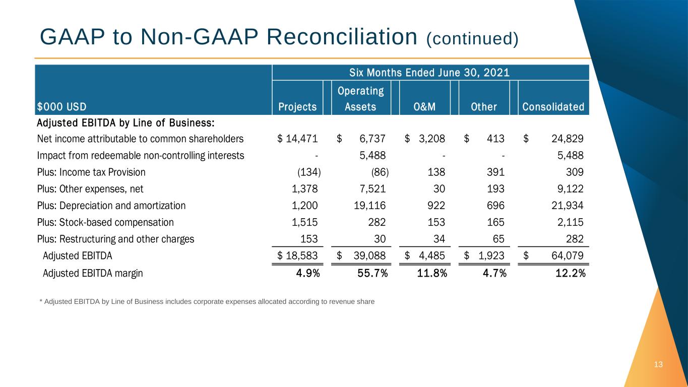 GAAP to Non-GAAP Reconciliation 12 (Unaudited) (Unaudited) (Unaudited) (Unaudited) Adjusted EBITDA: Net income attributable to common shareholders 13,655$ 4,365$ 24,829$ 10,566$ Impact from redeemable non-controlling interests 4,231 4,471 5,488 4,906 Plus (Less): Income tax provision (benefit) (1,896) - 309 (2,503) Plus: Other expenses, net 5,450 4,052 9,122 9,441 Plus: Depreciation and amortization 11,335 10,653 21,934 20,964 Plus: Stock-based compensation 1,349 430 2,115 859 Plus: Restructuring and other charges 234 174 282 1,150 Adjusted EBITDA 34,358$ 24,145$ 64,079$ 45,383$ Adjusted EBITDA margin 12.5% 10.8% 12.2% 10.4% Revenue 273,920 223,036 526,123 435,449 Non-GAAP net income and EPS: Net income attributable to common shareholders 13,655$ 4,365$ 24,829$ 10,566$ Adjustment for accretion of tax equity financing fees (30) - (61) - Impact of redeemable non-controlling interests 4,231 4,471 5,488 4,906 Plus: Restructuring and other charges 234 174 282 1,150 Income Tax effect of non-GAAP adjustments (61) - (73) (212) Non-GAAP net income 18,029$ 9,010$ 30,465$ 16,410$ Earnings per share: Diluted net income per common share 0.26$ 0.09$ 0.48$ 0.22$ Effect of adjustments to net income 0.08 0.10 0.11 0.12 Non-GAAP EPS 0.34$ 0.19$ 0.59$ 0.34$ Adjusted cash from operations Cash flows from operating activities (57,759)$ (21,954)$ (96,483)$ (73,594)$ Plus: proceeds from Federal ESPC projects 36,639 72,400 70,159$ 133,598$ Adjusted cash from operations (21,120)$ 50,446$ (26,324)$ 60,004$ 2021 2020 2021 2020 Six Months Ended June 30,Three Months Ended June 30,