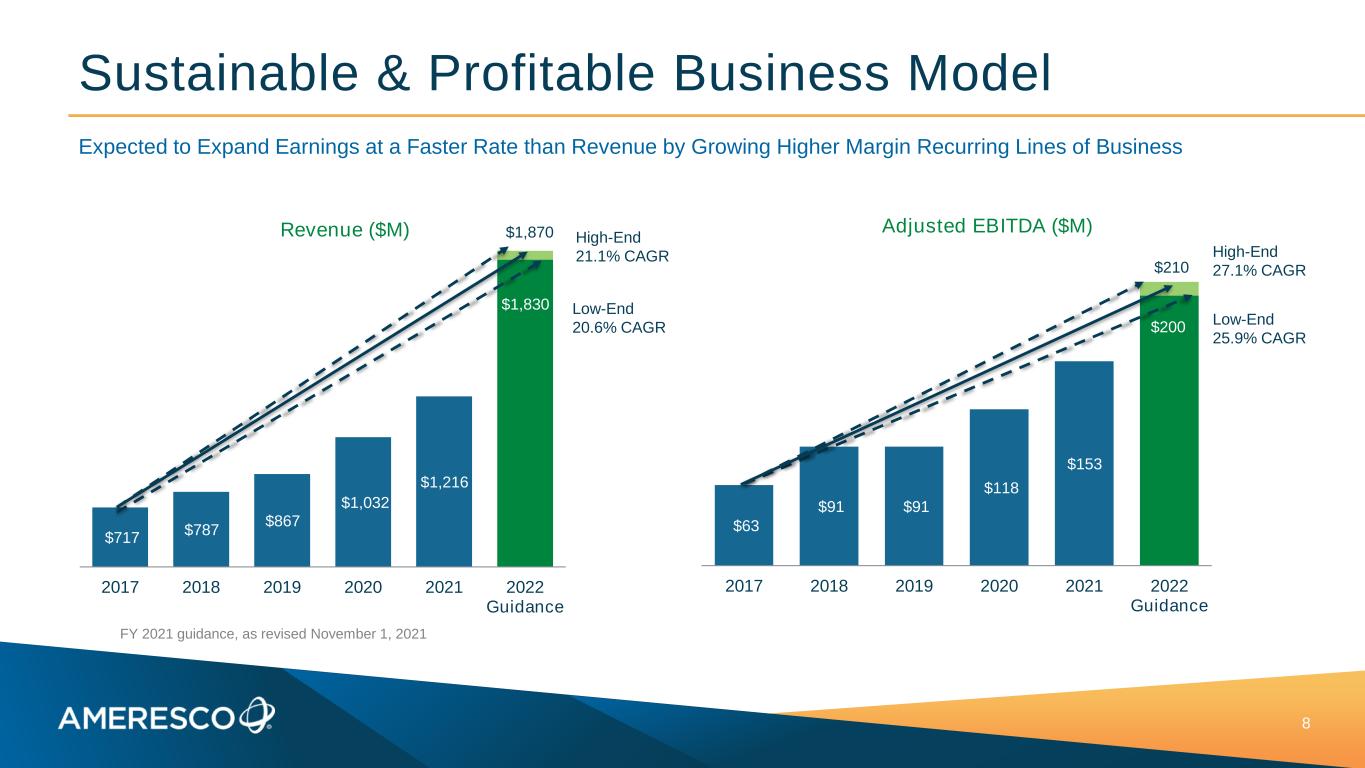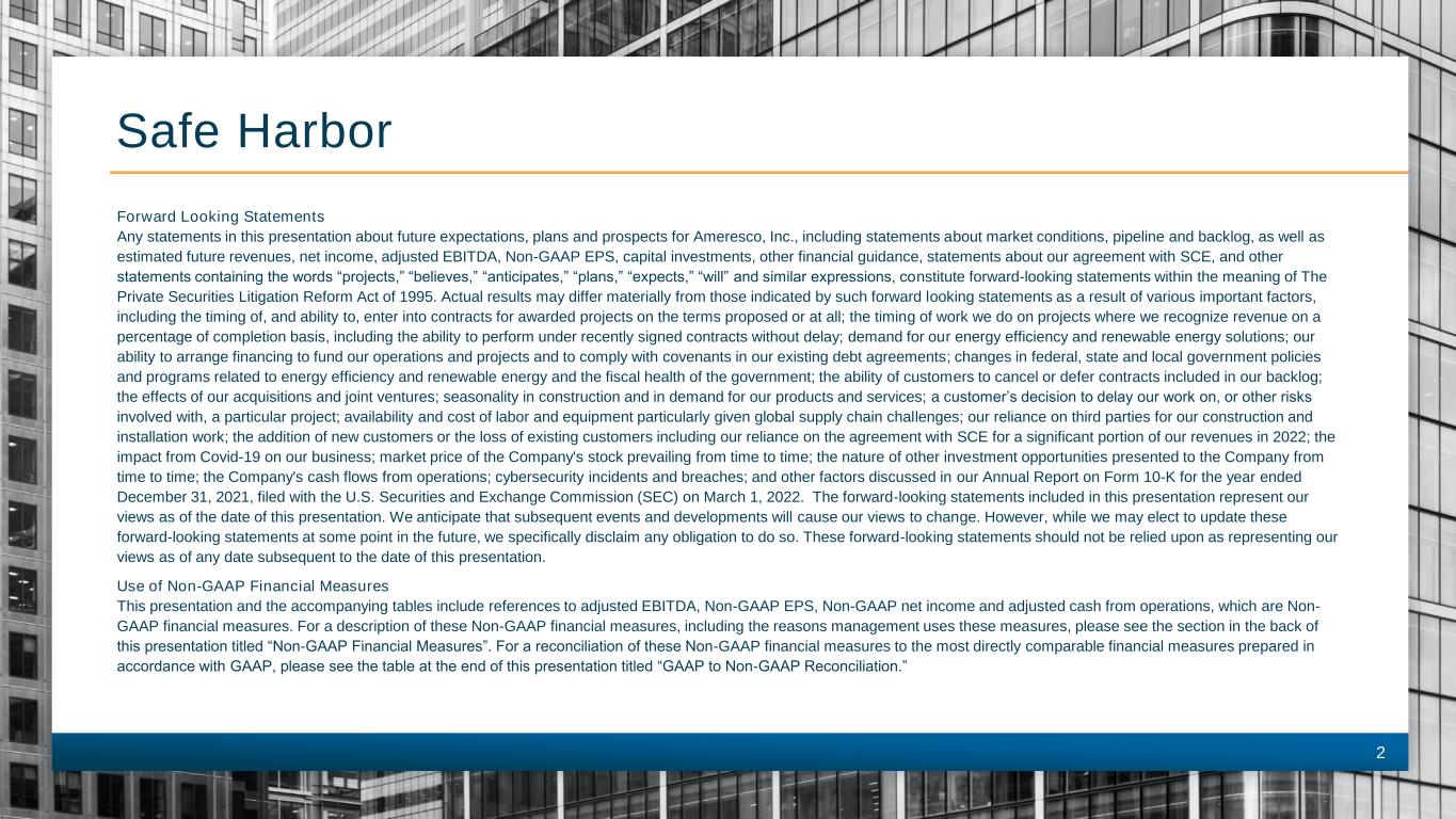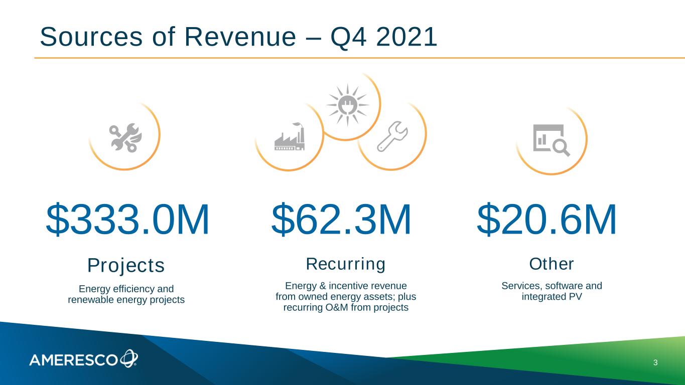 2 Safe Harbor Forward Looking Statements Any statements in this presentation about future expectations, plans and prospects for Ameresco, Inc., including statements about market conditions, pipeline and backlog, as well as estimated future revenues, net income, adjusted EBITDA, Non-GAAP EPS, capital investments, other financial guidance, statements about our agreement with SCE, and other statements containing the words “projects,” “believes,” “anticipates,” “plans,” “expects,” “will” and similar expressions, constitute forward-looking statements within the meaning of The Private Securities Litigation Reform Act of 1995. Actual results may differ materially from those indicated by such forward looking statements as a result of various important factors, including the timing of, and ability to, enter into contracts for awarded projects on the terms proposed or at all; the timing of work we do on projects where we recognize revenue on a percentage of completion basis, including the ability to perform under recently signed contracts without delay; demand for our energy efficiency and renewable energy solutions; our ability to arrange financing to fund our operations and projects and to comply with covenants in our existing debt agreements; changes in federal, state and local government policies and programs related to energy efficiency and renewable energy and the fiscal health of the government; the ability of customers to cancel or defer contracts included in our backlog; the effects of our acquisitions and joint ventures; seasonality in construction and in demand for our products and services; a customer’s decision to delay our work on, or other risks involved with, a particular project; availability and cost of labor and equipment particularly given global supply chain challenges; our reliance on third parties for our construction and installation work; the addition of new customers or the loss of existing customers including our reliance on the agreement with SCE for a significant portion of our revenues in 2022; the impact from Covid-19 on our business; market price of the Company's stock prevailing from time to time; the nature of other investment opportunities presented to the Company from time to time; the Company's cash flows from operations; cybersecurity incidents and breaches; and other factors discussed in our Annual Report on Form 10-K for the year ended December 31, 2021, filed with the U.S. Securities and Exchange Commission (SEC) on March 1, 2022. The forward-looking statements included in this presentation represent our views as of the date of this presentation. We anticipate that subsequent events and developments will cause our views to change. However, while we may elect to update these forward-looking statements at some point in the future, we specifically disclaim any obligation to do so. These forward-looking statements should not be relied upon as representing our views as of any date subsequent to the date of this presentation. Use of Non-GAAP Financial Measures This presentation and the accompanying tables include references to adjusted EBITDA, Non-GAAP EPS, Non-GAAP net income and adjusted cash from operations, which are Non- GAAP financial measures. For a description of these Non-GAAP financial measures, including the reasons management uses these measures, please see the section in the back of this presentation titled “Non-GAAP Financial Measures”. For a reconciliation of these Non-GAAP financial measures to the most directly comparable financial measures prepared in accordance with GAAP, please see the table at the end of this presentation titled “GAAP to Non-GAAP Reconciliation.”