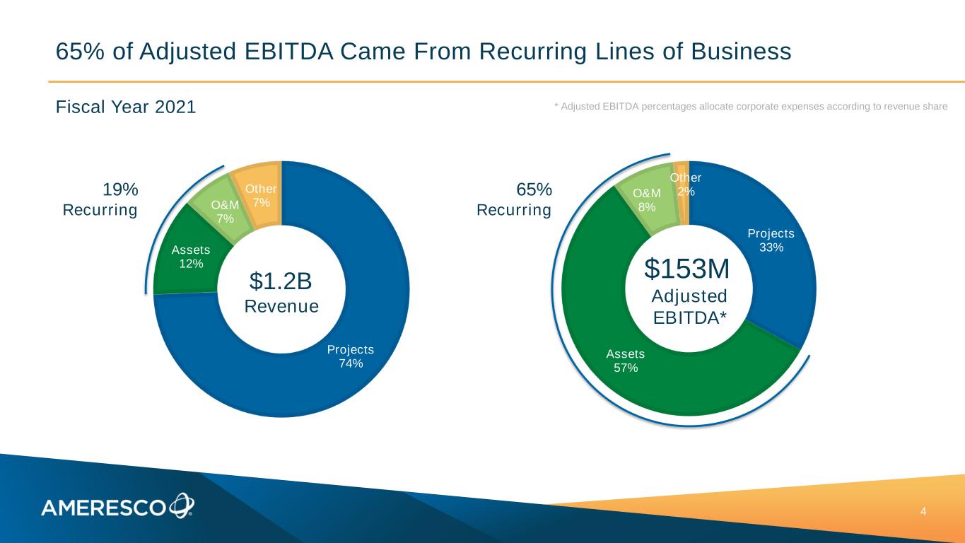 Projects 33% Assets 57% O&M 8% Other 2% $153M Adjusted EBITDA* 65% of Adjusted EBITDA Came From Recurring Lines of Business 4 Projects 74% Assets 12% O&M 7% Other 7% 19% Recurring $1.2B Revenue * Adjusted EBITDA percentages allocate corporate expenses according to revenue shareFiscal Year 2021 65% Recurring
