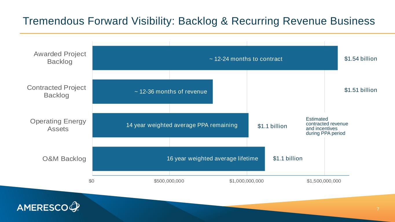 Energy Asset Balance Sheet – 12/31/2021 6 * Net of unamortized debt discount and debt issuance costs of $0.4M on corporate debt and $15.0M on Energy Debt $247M of the $857M energy assets on our balance sheet are still in development or construction. $359M of the $456M* of total debt on our balance sheet is debt associated with our energy assets. All of the energy debt is non-recourse to Ameresco, Inc. Total Debt $456M Corporate Debt $97M Energy Debt: $359M Energy Assets $857M Development/ Construction $247M Operating $610M