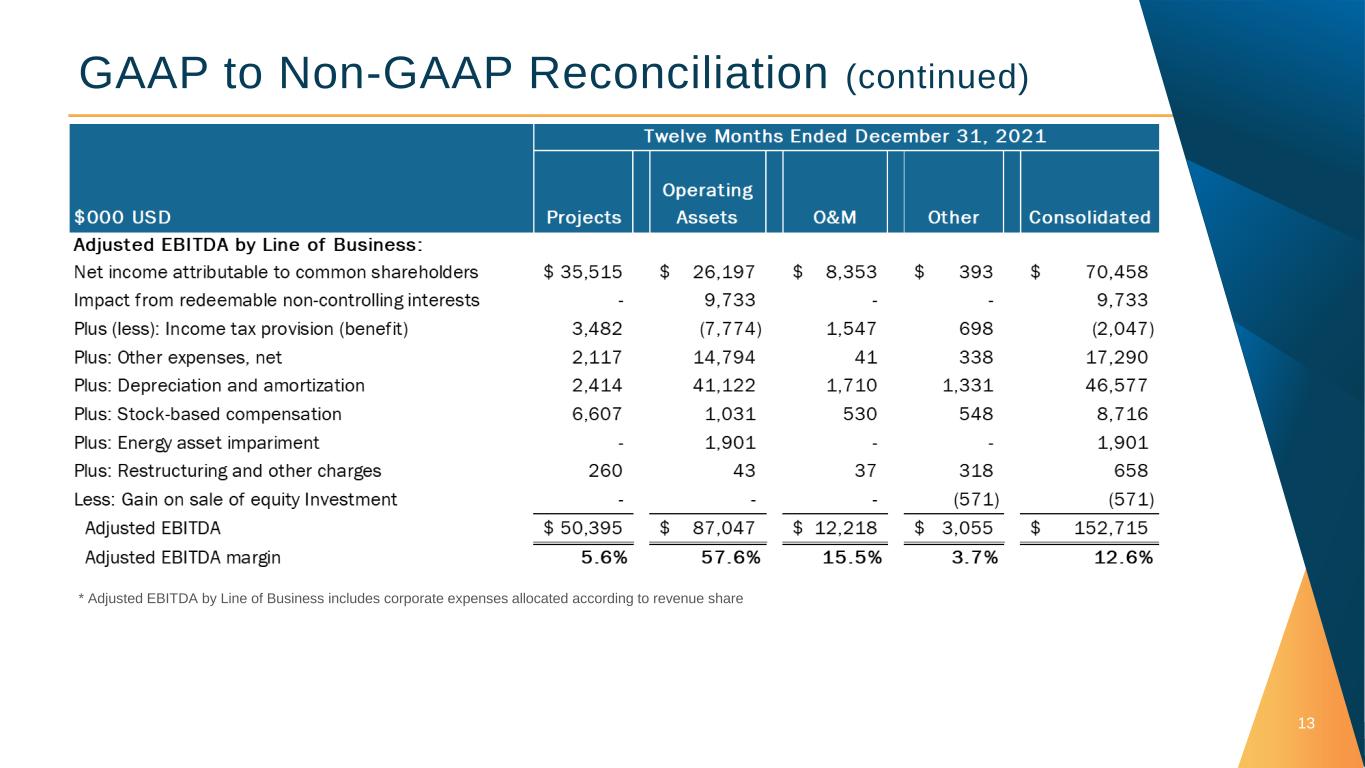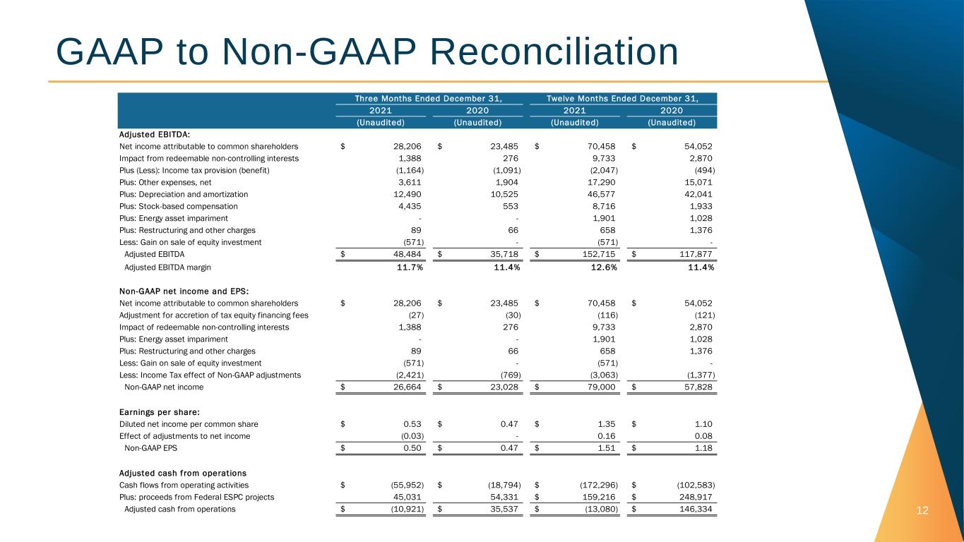 GAAP to Non-GAAP Reconciliation 12 (Unaudited) (Unaudited) (Unaudited) (Unaudited) Adjusted EBITDA: Net income attributable to common shareholders 28,206$ 23,485$ 70,458$ 54,052$ Impact from redeemable non-controlling interests 1,388 276 9,733 2,870 Plus (Less): Income tax provision (benefit) (1,164) (1,091) (2,047) (494) Plus: Other expenses, net 3,611 1,904 17,290 15,071 Plus: Depreciation and amortization 12,490 10,525 46,577 42,041 Plus: Stock-based compensation 4,435 553 8,716 1,933 Plus: Energy asset impariment - - 1,901 1,028 Plus: Restructuring and other charges 89 66 658 1,376 Less: Gain on sale of equity investment (571) - (571) - Adjusted EBITDA 48,484$ 35,718$ 152,715$ 117,877$ Adjusted EBITDA margin 11.7% 11.4% 12.6% 11.4% Revenue 415,893 314,319 1,215,698 1,032,275 Non-GAAP net income and EPS: Net income attributable to common shareholders 28,206$ 23,485$ 70,458$ 54,052$ Adjustment for accretion of tax equity financing fees (27) (30) (116) (121) Impact of redeemable non-controlling interests 1,388 276 9,733 2,870 Plus: Energy asset impariment - - 1,901 1,028 Plus: Restructuring and other charges 89 66 658 1,376 Less: Gain on sale of equity investment (571) - (571) - Less: Income Tax effect of Non-GAAP adjustments (2,421) (769) (3,063) (1,377) Non-GAAP net income 26,664$ 23,028$ 79,000$ 57,828$ Earnings per share: Diluted net income per common share 0.53$ 0.47$ 1.35$ 1.10$ Effect of adjustments to net income (0.03) - 0.16 0.08 Non-GAAP EPS 0.50$ 0.47$ 1.51$ 1.18$ Adjusted cash from operations Cash flows from operating activities (55,952)$ (18,794)$ (172,296)$ (102,583)$ Plus: proceeds from Federal ESPC projects 45,031 54,331 159,216$ 248,917$ Adjusted cash from operations (10,921)$ 35,537$ (13,080)$ 146,334$ 2021 2020 2021 2020 Twelve Months Ended December 31,Three Months Ended December 31,