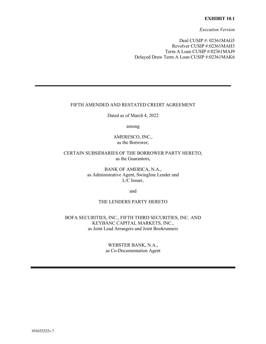 EXHIBIT 10.1 Execution Version 101652522v.7 Deal CUSIP #: 02361MAG5 Revolver CUSIP #:02361MAH3 Term A Loan CUSIP #:02361MAJ9 Delayed Draw Term A Loan CUSIP #:02361MAK6 __________________________________________________________________________________ FIFTH AMENDED AND RESTATED CREDIT AGREEMENT Dated as of March 4, 2022 among AMERESCO, INC., as the Borrower, CERTAIN SUBSIDIARIES OF THE BORROWER PARTY HERETO, as the Guarantors, BANK OF AMERICA, N.A., as Administrative Agent, Swingline Lender and L/C Issuer, and THE LENDERS PARTY HERETO BOFA SECURITIES, INC., FIFTH THIRD SECURITIES, INC. AND KEYBANC CAPITAL MARKETS, INC., as Joint Lead Arrangers and Joint Bookrunners WEBSTER BANK, N.A., as Co-Documentation Agent