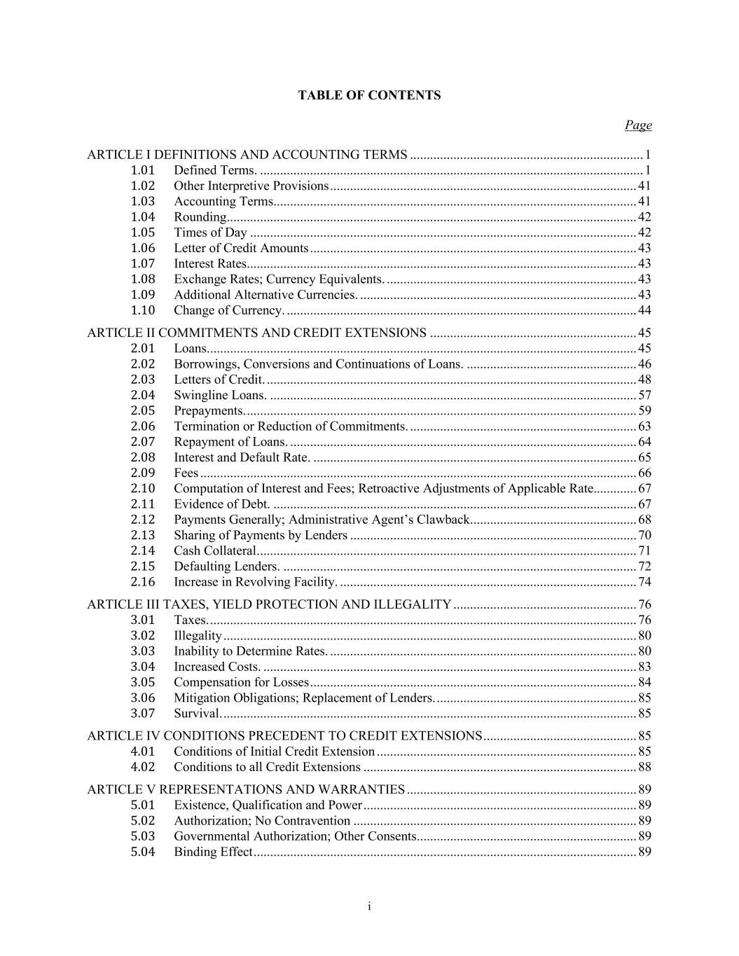 i TABLE OF CONTENTS Page ARTICLE I DEFINITIONS AND ACCOUNTING TERMS ...................................................................... 1 1.01 Defined Terms. ................................................................................................................... 1 1.02 Other Interpretive Provisions ............................................................................................ 41 1.03 Accounting Terms. ............................................................................................................ 41 1.04 Rounding ........................................................................................................................... 42 1.05 Times of Day .................................................................................................................... 42 1.06 Letter of Credit Amounts .................................................................................................. 43 1.07 Interest Rates ..................................................................................................................... 43 1.08 Exchange Rates; Currency Equivalents. ........................................................................... 43 1.09 Additional Alternative Currencies. ................................................................................... 43 1.10 Change of Currency. ......................................................................................................... 44 ARTICLE II COMMITMENTS AND CREDIT EXTENSIONS .............................................................. 45 2.01 Loans. ................................................................................................................................ 45 2.02 Borrowings, Conversions and Continuations of Loans. ................................................... 46 2.03 Letters of Credit. ............................................................................................................... 48 2.04 Swingline Loans. .............................................................................................................. 57 2.05 Prepayments. ..................................................................................................................... 59 2.06 Termination or Reduction of Commitments. .................................................................... 63 2.07 Repayment of Loans. ........................................................................................................ 64 2.08 Interest and Default Rate. ................................................................................................. 65 2.09 Fees ................................................................................................................................... 66 2.10 Computation of Interest and Fees; Retroactive Adjustments of Applicable Rate............. 67 2.11 Evidence of Debt. ............................................................................................................. 67 2.12 Payments Generally; Administrative Agent’s Clawback. ................................................. 68 2.13 Sharing of Payments by Lenders ...................................................................................... 70 2.14 Cash Collateral. ................................................................................................................. 71 2.15 Defaulting Lenders. .......................................................................................................... 72 2.16 Increase in Revolving Facility. ......................................................................................... 74 ARTICLE III TAXES, YIELD PROTECTION AND ILLEGALITY ....................................................... 76 3.01 Taxes. ................................................................................................................................ 76 3.02 Illegality ............................................................................................................................ 80 3.03 Inability to Determine Rates. ............................................................................................ 80 3.04 Increased Costs. ................................................................................................................ 83 3.05 Compensation for Losses .................................................................................................. 84 3.06 Mitigation Obligations; Replacement of Lenders. ............................................................ 85 3.07 Survival. ............................................................................................................................ 85 ARTICLE IV CONDITIONS PRECEDENT TO CREDIT EXTENSIONS .............................................. 85 4.01 Conditions of Initial Credit Extension .............................................................................. 85 4.02 Conditions to all Credit Extensions .................................................................................. 88 ARTICLE V REPRESENTATIONS AND WARRANTIES ..................................................................... 89 5.01 Existence, Qualification and Power .................................................................................. 89 5.02 Authorization; No Contravention ..................................................................................... 89 5.03 Governmental Authorization; Other Consents .................................................................. 89 5.04 Binding Effect ................................................................................................................... 89