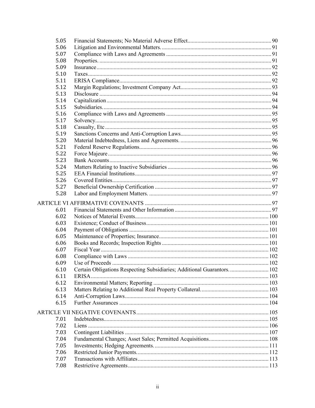 ii 5.05 Financial Statements; No Material Adverse Effect........................................................... 90 5.06 Litigation and Environmental Matters. ............................................................................. 91 5.07 Compliance with Laws and Agreements .......................................................................... 91 5.08 Properties. ......................................................................................................................... 91 5.09 Insurance ........................................................................................................................... 92 5.10 Taxes ................................................................................................................................. 92 5.11 ERISA Compliance. .......................................................................................................... 92 5.12 Margin Regulations; Investment Company Act................................................................ 93 5.13 Disclosure ......................................................................................................................... 94 5.14 Capitalization .................................................................................................................... 94 5.15 Subsidiaries. ...................................................................................................................... 94 5.16 Compliance with Laws and Agreements .......................................................................... 95 5.17 Solvency............................................................................................................................ 95 5.18 Casualty, Etc ..................................................................................................................... 95 5.19 Sanctions Concerns and Anti-Corruption Laws................................................................ 95 5.20 Material Indebtedness, Liens and Agreements. ................................................................ 96 5.21 Federal Reserve Regulations............................................................................................. 96 5.22 Force Majeure ................................................................................................................... 96 5.23 Bank Accounts .................................................................................................................. 96 5.24 Matters Relating to Inactive Subsidiaries ......................................................................... 96 5.25 EEA Financial Institutions ................................................................................................ 97 5.26 Covered Entities ................................................................................................................ 97 5.27 Beneficial Ownership Certification .................................................................................. 97 5.28 Labor and Employment Matters. ...................................................................................... 97 ARTICLE VI AFFIRMATIVE COVENANTS ......................................................................................... 97 6.01 Financial Statements and Other Information .................................................................... 97 6.02 Notices of Material Events.............................................................................................. 100 6.03 Existence; Conduct of Business ...................................................................................... 101 6.04 Payment of Obligations .................................................................................................. 101 6.05 Maintenance of Properties; Insurance ............................................................................. 101 6.06 Books and Records; Inspection Rights ........................................................................... 101 6.07 Fiscal Year ...................................................................................................................... 102 6.08 Compliance with Laws ................................................................................................... 102 6.09 Use of Proceeds .............................................................................................................. 102 6.10 Certain Obligations Respecting Subsidiaries; Additional Guarantors. ........................... 102 6.11 ERISA ............................................................................................................................. 103 6.12 Environmental Matters; Reporting ................................................................................. 103 6.13 Matters Relating to Additional Real Property Collateral. ............................................... 103 6.14 Anti-Corruption Laws ..................................................................................................... 104 6.15 Further Assurances ......................................................................................................... 104 ARTICLE VII NEGATIVE COVENANTS ............................................................................................. 105 7.01 Indebtedness.................................................................................................................... 105 7.02 Liens ............................................................................................................................... 106 7.03 Contingent Liabilities ..................................................................................................... 107 7.04 Fundamental Changes; Asset Sales; Permitted Acquisitions. ......................................... 108 7.05 Investments; Hedging Agreements. ................................................................................ 111 7.06 Restricted Junior Payments. ............