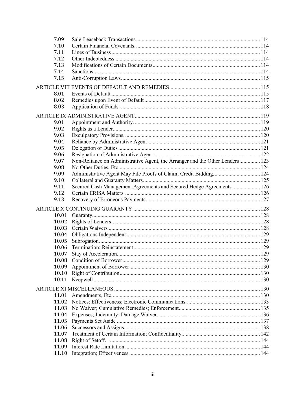 iii 7.09 Sale-Leaseback Transactions .......................................................................................... 114 7.10 Certain Financial Covenants. .......................................................................................... 114 7.11 Lines of Business ............................................................................................................ 114 7.12 Other Indebtedness ......................................................................................................... 114 7.13 Modifications of Certain Documents .............................................................................. 114 7.14 Sanctions. ........................................................................................................................ 114 7.15 Anti-Corruption Laws ..................................................................................................... 115 ARTICLE VIII EVENTS OF DEFAULT AND REMEDIES .................................................................. 115 8.01 Events of Default ............................................................................................................ 115 8.02 Remedies upon Event of Default .................................................................................... 117 8.03 Application of Funds. ..................................................................................................... 118 ARTICLE IX ADMINISTRATIVE AGENT ........................................................................................... 119 9.01 Appointment and Authority. ........................................................................................... 119 9.02 Rights as a Lender. .......................................................................................................... 120 9.03 Exculpatory Provisions. .................................................................................................. 120 9.04 Reliance by Administrative Agent .................................................................................. 121 9.05 Delegation of Duties ....................................................................................................... 121 9.06 Resignation of Administrative Agent. ............................................................................ 122 9.07 Non-Reliance on Administrative Agent, the Arranger and the Other Lenders ............... 123 9.08 No Other Duties, Etc ....................................................................................................... 124 9.09 Administrative Agent May File Proofs of Claim; Credit Bidding. ................................. 124 9.10 Collateral and Guaranty Matters. .................................................................................... 125 9.11 Secured Cash Management Agreements and Secured Hedge Agreements .................... 126 9.12 Certain ERISA Matters. .................................................................................................. 126 9.13 Recovery of Erroneous Payments ................................................................................... 127 ARTICLE X CONTINUING GUARANTY ............................................................................................ 128 10.01 Guaranty.......................................................................................................................... 128 10.02 Rights of Lenders ............................................................................................................ 128 10.03 Certain Waivers .............................................................................................................. 128 10.04 Obligations Independent ................................................................................................. 129 10.05 Subrogation ..................................................................................................................... 129 10.06 Termination; Reinstatement ............................................................................................ 129 10.07 Stay of Acceleration ........................................................................................................ 129 10.08 Condition of Borrower .................................................................................................... 129 10.09 Appointment of Borrower ............................................................................................... 130 10.10 Right of Contribution ...................................................................................................... 130 10.11 Keepwell ......................................................................................................................... 130 ARTICLE XI MISCELLANEOUS .......................................................................................................... 130 11.01 Amendments, Etc. ........................................................................................................... 130 11.02 Notices; Effectiveness; Electronic Communications. ..................................................... 133 11.03 No Waiver; Cumulative Remedies; Enforcement. .......................................................... 135 11.04 Expenses; Indemnity; Damage Waiver. .......................................................................... 136 11.05 Payments Set Aside ........................................................................................................ 137 11.06 Successors and Assigns. ................................................................................................. 138 11.07 Treatment of Certain Information; Confidentiality. ........................................................ 142 11.08 Right of Setoff. ............................................................................................................. 144 11.09 Interest Rate Limitation ....................................................