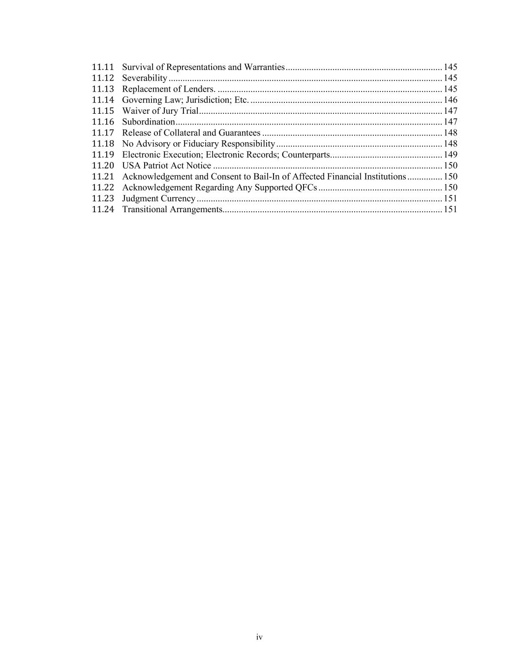 iv 11.11 Survival of Representations and Warranties ................................................................... 145 11.12 Severability ..................................................................................................................... 145 11.13 Replacement of Lenders. ................................................................................................ 145 11.14 Governing Law; Jurisdiction; Etc. .................................................................................. 146 11.15 Waiver of Jury Trial ........................................................................................................ 147 11.16 Subordination .................................................................................................................. 147 11.17 Release of Collateral and Guarantees ............................................................................. 148 11.18 No Advisory or Fiduciary Responsibility ....................................................................... 148 11.19 Electronic Execution; Electronic Records; Counterparts. ............................................... 149 11.20 USA Patriot Act Notice .................................................................................................. 150 11.21 Acknowledgement and Consent to Bail-In of Affected Financial Institutions ............... 150 11.22 Acknowledgement Regarding Any Supported QFCs ..................................................... 150 11.23 Judgment Currency ......................................................................................................... 151 11.24 Transitional Arrangements.............................................................................................. 151