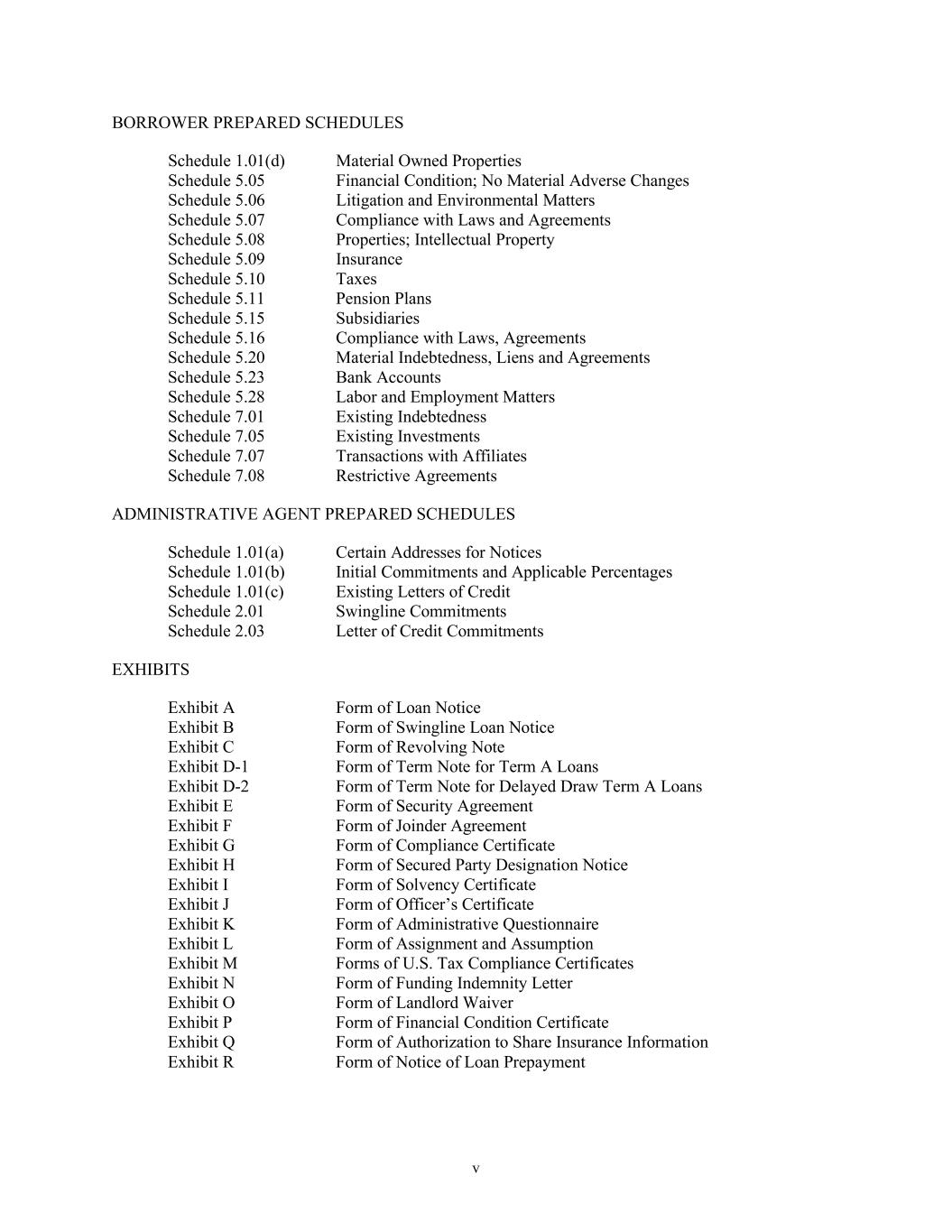 v BORROWER PREPARED SCHEDULES Schedule 1.01(d) Material Owned Properties Schedule 5.05 Financial Condition; No Material Adverse Changes Schedule 5.06 Litigation and Environmental Matters Schedule 5.07 Compliance with Laws and Agreements Schedule 5.08 Properties; Intellectual Property Schedule 5.09 Insurance Schedule 5.10 Taxes Schedule 5.11 Pension Plans Schedule 5.15 Subsidiaries Schedule 5.16 Compliance with Laws, Agreements Schedule 5.20 Material Indebtedness, Liens and Agreements Schedule 5.23 Bank Accounts Schedule 5.28 Labor and Employment Matters Schedule 7.01 Existing Indebtedness Schedule 7.05 Existing Investments Schedule 7.07 Transactions with Affiliates Schedule 7.08 Restrictive Agreements ADMINISTRATIVE AGENT PREPARED SCHEDULES Schedule 1.01(a) Certain Addresses for Notices Schedule 1.01(b) Initial Commitments and Applicable Percentages Schedule 1.01(c) Existing Letters of Credit Schedule 2.01 Swingline Commitments Schedule 2.03 Letter of Credit Commitments EXHIBITS Exhibit A Form of Loan Notice Exhibit B Form of Swingline Loan Notice Exhibit C Form of Revolving Note Exhibit D-1 Form of Term Note for Term A Loans Exhibit D-2 Form of Term Note for Delayed Draw Term A Loans Exhibit E Form of Security Agreement Exhibit F Form of Joinder Agreement Exhibit G Form of Compliance Certificate Exhibit H Form of Secured Party Designation Notice Exhibit I Form of Solvency Certificate Exhibit J Form of Officer’s Certificate Exhibit K Form of Administrative Questionnaire Exhibit L Form of Assignment and Assumption Exhibit M Forms of U.S. Tax Compliance Certificates Exhibit N Form of Funding Indemnity Letter Exhibit O Form of Landlord Waiver Exhibit P Form of Financial Condition Certificate Exhibit Q Form of Authorization to Share Insurance Information Exhibit R Form of Notice of Loan Prepayment