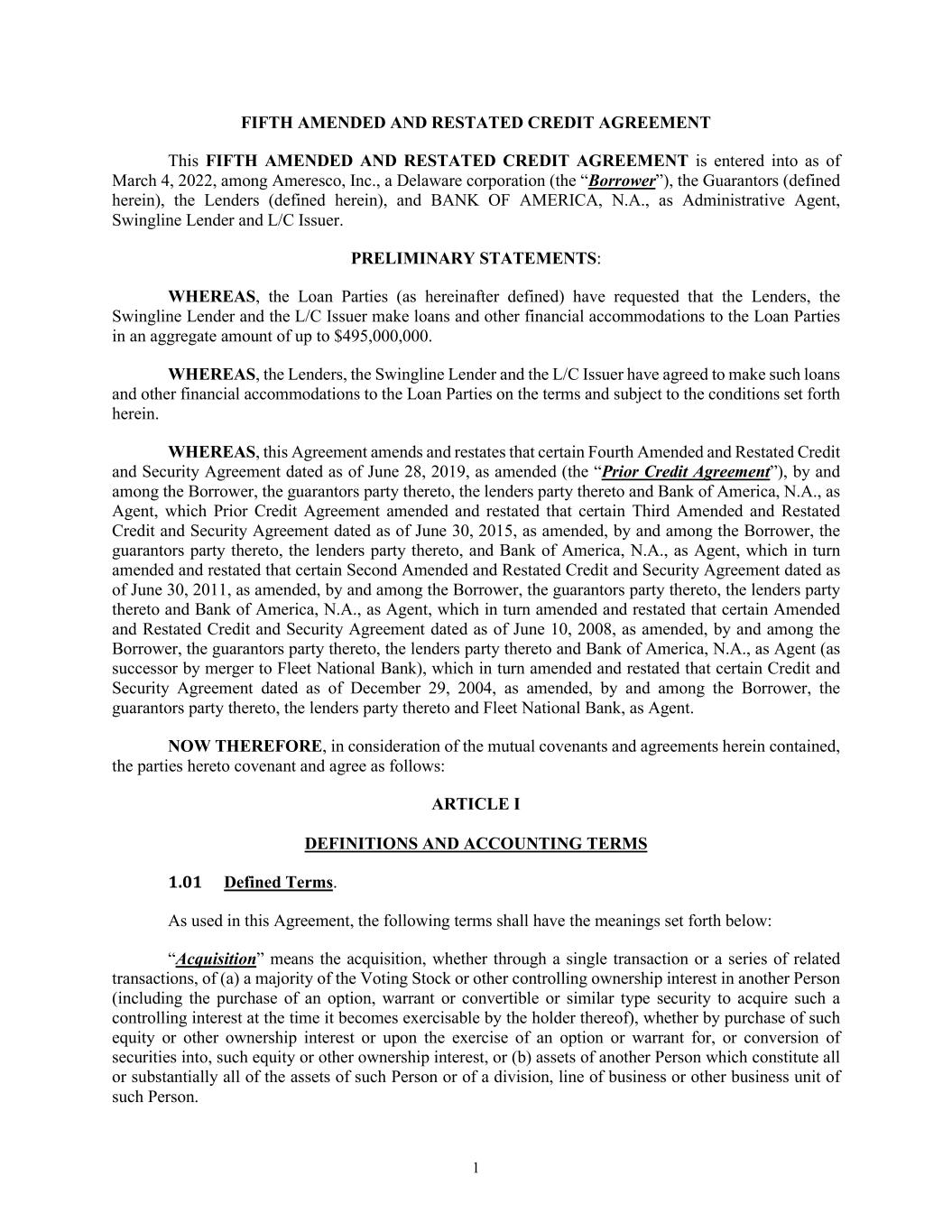 1 FIFTH AMENDED AND RESTATED CREDIT AGREEMENT This FIFTH AMENDED AND RESTATED CREDIT AGREEMENT is entered into as of March 4, 2022, among Ameresco, Inc., a Delaware corporation (the “Borrower”), the Guarantors (defined herein), the Lenders (defined herein), and BANK OF AMERICA, N.A., as Administrative Agent, Swingline Lender and L/C Issuer. PRELIMINARY STATEMENTS: WHEREAS, the Loan Parties (as hereinafter defined) have requested that the Lenders, the Swingline Lender and the L/C Issuer make loans and other financial accommodations to the Loan Parties in an aggregate amount of up to $495,000,000. WHEREAS, the Lenders, the Swingline Lender and the L/C Issuer have agreed to make such loans and other financial accommodations to the Loan Parties on the terms and subject to the conditions set forth herein. WHEREAS, this Agreement amends and restates that certain Fourth Amended and Restated Credit and Security Agreement dated as of June 28, 2019, as amended (the “Prior Credit Agreement”), by and among the Borrower, the guarantors party thereto, the lenders party thereto and Bank of America, N.A., as Agent, which Prior Credit Agreement amended and restated that certain Third Amended and Restated Credit and Security Agreement dated as of June 30, 2015, as amended, by and among the Borrower, the guarantors party thereto, the lenders party thereto, and Bank of America, N.A., as Agent, which in turn amended and restated that certain Second Amended and Restated Credit and Security Agreement dated as of June 30, 2011, as amended, by and among the Borrower, the guarantors party thereto, the lenders party thereto and Bank of America, N.A., as Agent, which in turn amended and restated that certain Amended and Restated Credit and Security Agreement dated as of June 10, 2008, as amended, by and among the Borrower, the guarantors party thereto, the lenders party thereto and Bank of America, N.A., as Agent (as successor by merger to Fleet National Bank), which in turn amended and restated that certain Credit and Security Agreement dated as of December 29, 2004, as amended, by and among the Borrower, the guarantors party thereto, the lenders party thereto and Fleet National Bank, as Agent. NOW THEREFORE, in consideration of the mutual covenants and agreements herein contained, the parties hereto covenant and agree as follows: ARTICLE I DEFINITIONS AND ACCOUNTING TERMS 1.01 Defined Terms. As used in this Agreement, the following terms shall have the meanings set forth below: “Acquisition” means the acquisition, whether through a single transaction or a series of related transactions, of (a) a majority of the Voting Stock or other controlling ownership interest in another Person (including the purchase of an option, warrant or convertible or similar type security to acquire such a controlling interest at the time it becomes exercisable by the holder thereof), whether by purchase of such equity or other ownership interest or upon the exercise of an option or warrant for, or conversion of securities into, such equity or other ownership interest, or (b) assets of another Person which constitute all or substantially all of the assets of such Person or of a division, line of business or other business unit of such Person.