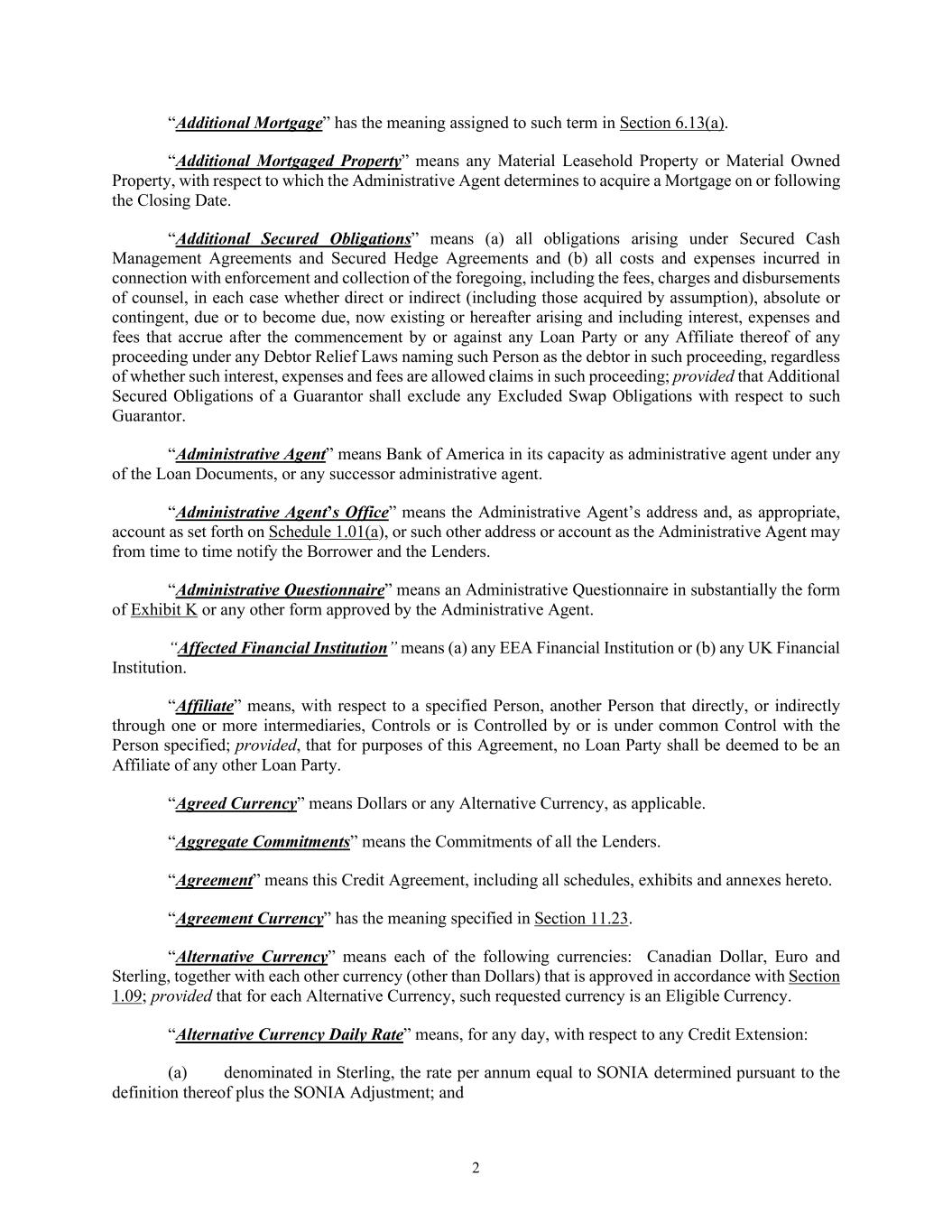 2 “Additional Mortgage” has the meaning assigned to such term in Section 6.13(a). “Additional Mortgaged Property” means any Material Leasehold Property or Material Owned Property, with respect to which the Administrative Agent determines to acquire a Mortgage on or following the Closing Date. “Additional Secured Obligations” means (a) all obligations arising under Secured Cash Management Agreements and Secured Hedge Agreements and (b) all costs and expenses incurred in connection with enforcement and collection of the foregoing, including the fees, charges and disbursements of counsel, in each case whether direct or indirect (including those acquired by assumption), absolute or contingent, due or to become due, now existing or hereafter arising and including interest, expenses and fees that accrue after the commencement by or against any Loan Party or any Affiliate thereof of any proceeding under any Debtor Relief Laws naming such Person as the debtor in such proceeding, regardless of whether such interest, expenses and fees are allowed claims in such proceeding; provided that Additional Secured Obligations of a Guarantor shall exclude any Excluded Swap Obligations with respect to such Guarantor. “Administrative Agent” means Bank of America in its capacity as administrative agent under any of the Loan Documents, or any successor administrative agent. “Administrative Agent’s Office” means the Administrative Agent’s address and, as appropriate, account as set forth on Schedule 1.01(a), or such other address or account as the Administrative Agent may from time to time notify the Borrower and the Lenders. “Administrative Questionnaire” means an Administrative Questionnaire in substantially the form of Exhibit K or any other form approved by the Administrative Agent. “Affected Financial Institution” means (a) any EEA Financial Institution or (b) any UK Financial Institution. “Affiliate” means, with respect to a specified Person, another Person that directly, or indirectly through one or more intermediaries, Controls or is Controlled by or is under common Control with the Person specified; provided, that for purposes of this Agreement, no Loan Party shall be deemed to be an Affiliate of any other Loan Party. “Agreed Currency” means Dollars or any Alternative Currency, as applicable. “Aggregate Commitments” means the Commitments of all the Lenders. “Agreement” means this Credit Agreement, including all schedules, exhibits and annexes hereto. “Agreement Currency” has the meaning specified in Section 11.23. “Alternative Currency” means each of the following currencies: Canadian Dollar, Euro and Sterling, together with each other currency (other than Dollars) that is approved in accordance with Section 1.09; provided that for each Alternative Currency, such requested currency is an Eligible Currency. “Alternative Currency Daily Rate” means, for any day, with respect to any Credit Extension: (a) denominated in Sterling, the rate per annum equal to SONIA determined pursuant to the definition thereof plus the SONIA Adjustment; and