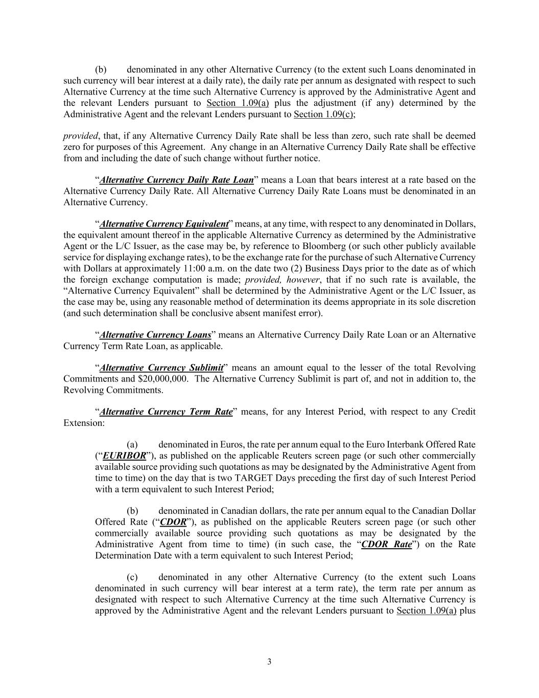 3 (b) denominated in any other Alternative Currency (to the extent such Loans denominated in such currency will bear interest at a daily rate), the daily rate per annum as designated with respect to such Alternative Currency at the time such Alternative Currency is approved by the Administrative Agent and the relevant Lenders pursuant to Section 1.09(a) plus the adjustment (if any) determined by the Administrative Agent and the relevant Lenders pursuant to Section 1.09(c); provided, that, if any Alternative Currency Daily Rate shall be less than zero, such rate shall be deemed zero for purposes of this Agreement. Any change in an Alternative Currency Daily Rate shall be effective from and including the date of such change without further notice. “Alternative Currency Daily Rate Loan” means a Loan that bears interest at a rate based on the Alternative Currency Daily Rate. All Alternative Currency Daily Rate Loans must be denominated in an Alternative Currency. “Alternative Currency Equivalent” means, at any time, with respect to any denominated in Dollars, the equivalent amount thereof in the applicable Alternative Currency as determined by the Administrative Agent or the L/C Issuer, as the case may be, by reference to Bloomberg (or such other publicly available service for displaying exchange rates), to be the exchange rate for the purchase of such Alternative Currency with Dollars at approximately 11:00 a.m. on the date two (2) Business Days prior to the date as of which the foreign exchange computation is made; provided, however, that if no such rate is available, the “Alternative Currency Equivalent” shall be determined by the Administrative Agent or the L/C Issuer, as the case may be, using any reasonable method of determination its deems appropriate in its sole discretion (and such determination shall be conclusive absent manifest error). “Alternative Currency Loans” means an Alternative Currency Daily Rate Loan or an Alternative Currency Term Rate Loan, as applicable. “Alternative Currency Sublimit” means an amount equal to the lesser of the total Revolving Commitments and $20,000,000. The Alternative Currency Sublimit is part of, and not in addition to, the Revolving Commitments. “Alternative Currency Term Rate” means, for any Interest Period, with respect to any Credit Extension: (a) denominated in Euros, the rate per annum equal to the Euro Interbank Offered Rate (“EURIBOR”), as published on the applicable Reuters screen page (or such other commercially available source providing such quotations as may be designated by the Administrative Agent from time to time) on the day that is two TARGET Days preceding the first day of such Interest Period with a term equivalent to such Interest Period; (b) denominated in Canadian dollars, the rate per annum equal to the Canadian Dollar Offered Rate (“CDOR”), as published on the applicable Reuters screen page (or such other commercially available source providing such quotations as may be designated by the Administrative Agent from time to time) (in such case, the “CDOR Rate”) on the Rate Determination Date with a term equivalent to such Interest Period; (c) denominated in any other Alternative Currency (to the extent such Loans denominated in such currency will bear interest at a term rate), the term rate per annum as designated with respect to such Alternative Currency at the time such Alternative Currency is approved by the Administrative Agent and the relevant Lenders pursuant to Section 1.09(a) plus
