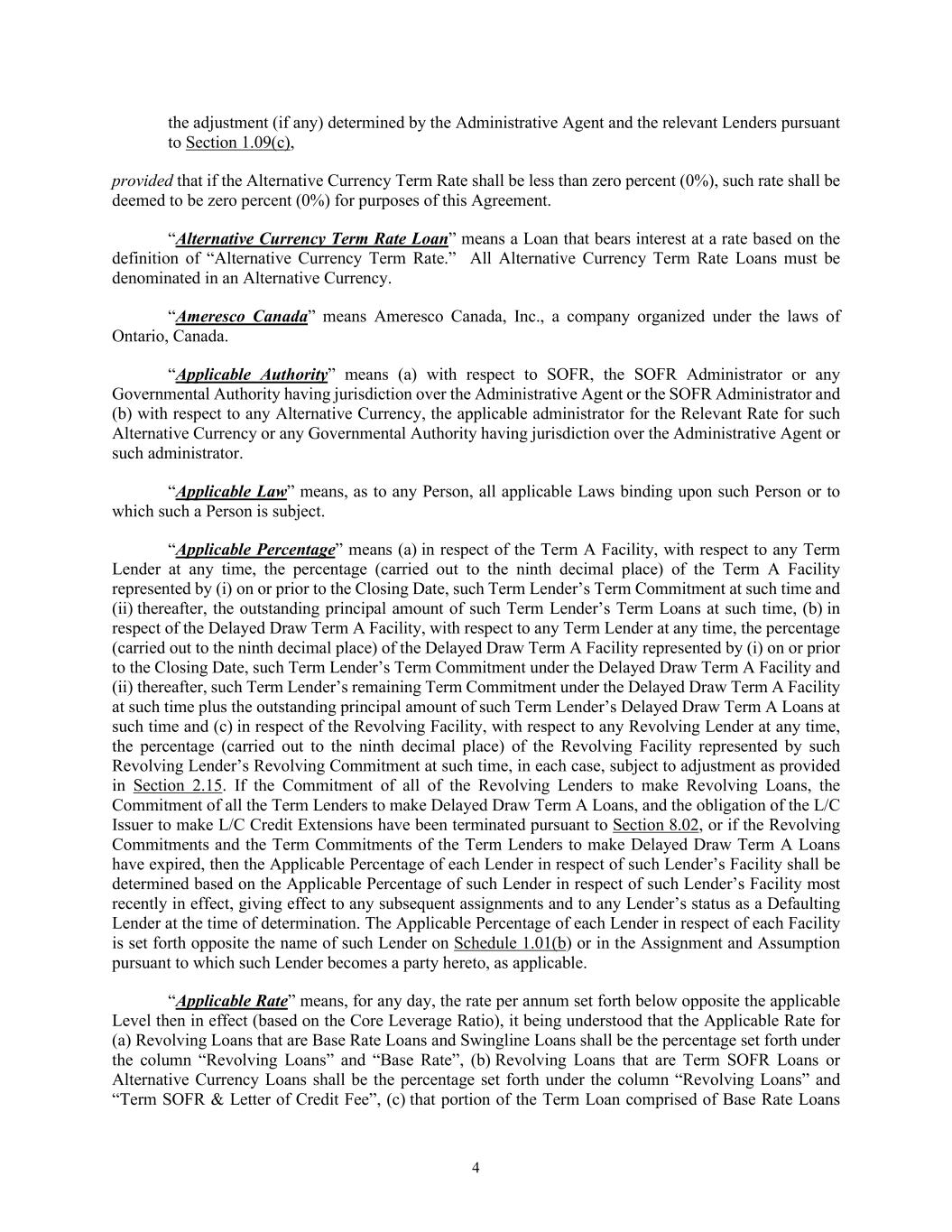 4 the adjustment (if any) determined by the Administrative Agent and the relevant Lenders pursuant to Section 1.09(c), provided that if the Alternative Currency Term Rate shall be less than zero percent (0%), such rate shall be deemed to be zero percent (0%) for purposes of this Agreement. “Alternative Currency Term Rate Loan” means a Loan that bears interest at a rate based on the definition of “Alternative Currency Term Rate.” All Alternative Currency Term Rate Loans must be denominated in an Alternative Currency. “Ameresco Canada” means Ameresco Canada, Inc., a company organized under the laws of Ontario, Canada. “Applicable Authority” means (a) with respect to SOFR, the SOFR Administrator or any Governmental Authority having jurisdiction over the Administrative Agent or the SOFR Administrator and (b) with respect to any Alternative Currency, the applicable administrator for the Relevant Rate for such Alternative Currency or any Governmental Authority having jurisdiction over the Administrative Agent or such administrator. “Applicable Law” means, as to any Person, all applicable Laws binding upon such Person or to which such a Person is subject. “Applicable Percentage” means (a) in respect of the Term A Facility, with respect to any Term Lender at any time, the percentage (carried out to the ninth decimal place) of the Term A Facility represented by (i) on or prior to the Closing Date, such Term Lender’s Term Commitment at such time and (ii) thereafter, the outstanding principal amount of such Term Lender’s Term Loans at such time, (b) in respect of the Delayed Draw Term A Facility, with respect to any Term Lender at any time, the percentage (carried out to the ninth decimal place) of the Delayed Draw Term A Facility represented by (i) on or prior to the Closing Date, such Term Lender’s Term Commitment under the Delayed Draw Term A Facility and (ii) thereafter, such Term Lender’s remaining Term Commitment under the Delayed Draw Term A Facility at such time plus the outstanding principal amount of such Term Lender’s Delayed Draw Term A Loans at such time and (c) in respect of the Revolving Facility, with respect to any Revolving Lender at any time, the percentage (carried out to the ninth decimal place) of the Revolving Facility represented by such Revolving Lender’s Revolving Commitment at such time, in each case, subject to adjustment as provided in Section 2.15. If the Commitment of all of the Revolving Lenders to make Revolving Loans, the Commitment of all the Term Lenders to make Delayed Draw Term A Loans, and the obligation of the L/C Issuer to make L/C Credit Extensions have been terminated pursuant to Section 8.02, or if the Revolving Commitments and the Term Commitments of the Term Lenders to make Delayed Draw Term A Loans have expired, then the Applicable Percentage of each Lender in respect of such Lender’s Facility shall be determined based on the Applicable Percentage of such Lender in respect of such Lender’s Facility most recently in effect, giving effect to any subsequent assignments and to any Lender’s status as a Defaulting Lender at the time of determination. The Applicable Percentage of each Lender in respect of each Facility is set forth opposite the name of such Lender on Schedule 1.01(b) or in the Assignment and Assumption pursuant to which such Lender becomes a party hereto, as applicable. “Applicable Rate” means, for any day, the rate per annum set forth below opposite the applicable Level then in effect (based on the Core Leverage Ratio), it being understood that the Applicable Rate for (a) Revolving Loans that are Base Rate Loans and Swingline Loans shall be the percentage set forth under the column “Revolving Loans” and “Base Rate”, (b) Revolving Loans that are Term SOFR Loans or Alternative Currency Loans shall be the percentage set forth under the column “Revolving Loans” and “Term SOFR & Letter of Credit Fee”, (c) that portion of the Term Loan comprised of Base Rate Loans