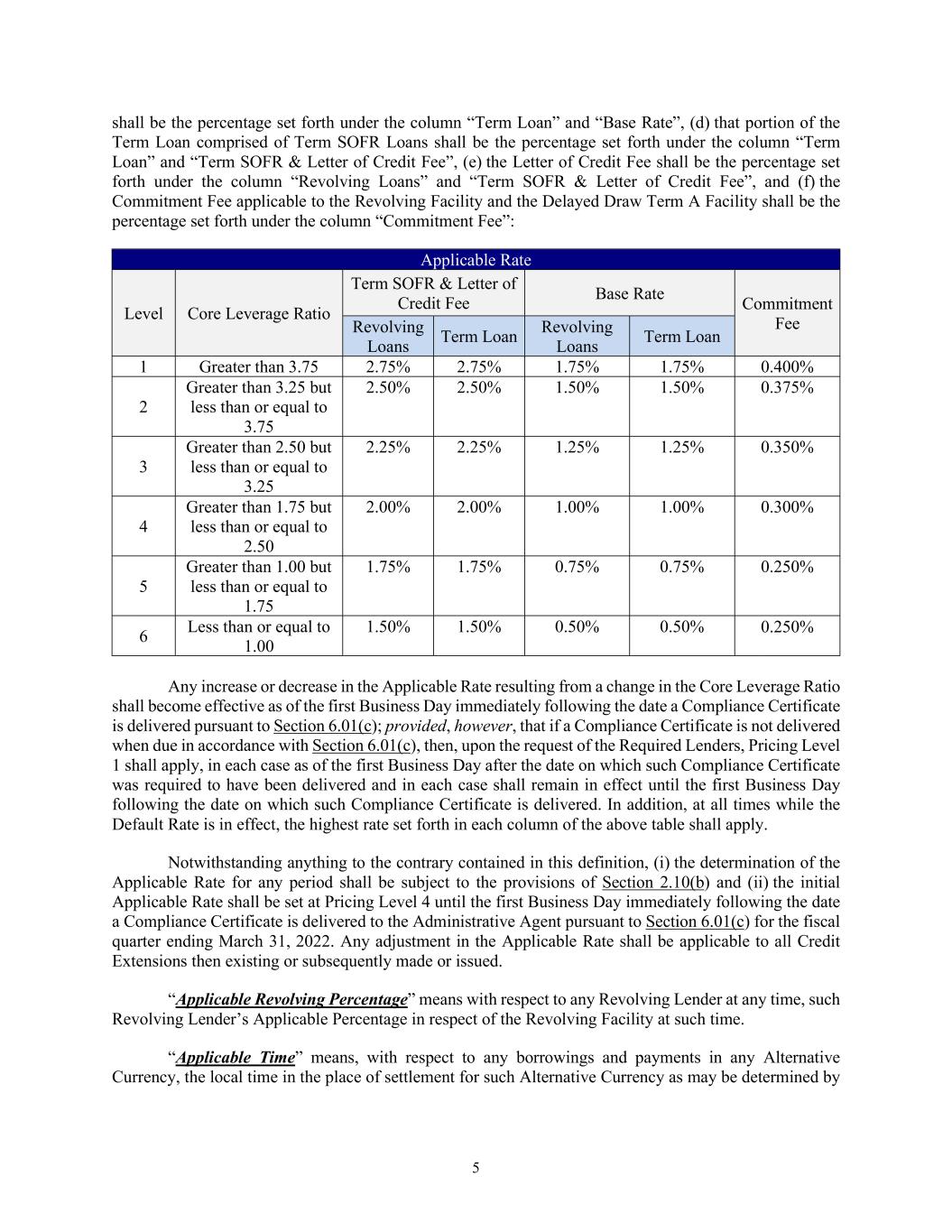 5 shall be the percentage set forth under the column “Term Loan” and “Base Rate”, (d) that portion of the Term Loan comprised of Term SOFR Loans shall be the percentage set forth under the column “Term Loan” and “Term SOFR & Letter of Credit Fee”, (e) the Letter of Credit Fee shall be the percentage set forth under the column “Revolving Loans” and “Term SOFR & Letter of Credit Fee”, and (f) the Commitment Fee applicable to the Revolving Facility and the Delayed Draw Term A Facility shall be the percentage set forth under the column “Commitment Fee”: Applicable Rate Level Core Leverage Ratio Term SOFR & Letter of Credit Fee Base Rate Commitment Fee Revolving Loans Term Loan Revolving Loans Term Loan 1 Greater than 3.75 2.75% 2.75% 1.75% 1.75% 0.400% 2 Greater than 3.25 but less than or equal to 3.75 2.50% 2.50% 1.50% 1.50% 0.375% 3 Greater than 2.50 but less than or equal to 3.25 2.25% 2.25% 1.25% 1.25% 0.350% 4 Greater than 1.75 but less than or equal to 2.50 2.00% 2.00% 1.00% 1.00% 0.300% 5 Greater than 1.00 but less than or equal to 1.75 1.75% 1.75% 0.75% 0.75% 0.250% 6 Less than or equal to 1.00 1.50% 1.50% 0.50% 0.50% 0.250% Any increase or decrease in the Applicable Rate resulting from a change in the Core Leverage Ratio shall become effective as of the first Business Day immediately following the date a Compliance Certificate is delivered pursuant to Section 6.01(c); provided, however, that if a Compliance Certificate is not delivered when due in accordance with Section 6.01(c), then, upon the request of the Required Lenders, Pricing Level 1 shall apply, in each case as of the first Business Day after the date on which such Compliance Certificate was required to have been delivered and in each case shall remain in effect until the first Business Day following the date on which such Compliance Certificate is delivered. In addition, at all times while the Default Rate is in effect, the highest rate set forth in each column of the above table shall apply. Notwithstanding anything to the contrary contained in this definition, (i) the determination of the Applicable Rate for any period shall be subject to the provisions of Section 2.10(b) and (ii) the initial Applicable Rate shall be set at Pricing Level 4 until the first Business Day immediately following the date a Compliance Certificate is delivered to the Administrative Agent pursuant to Section 6.01(c) for the fiscal quarter ending March 31, 2022. Any adjustment in the Applicable Rate shall be applicable to all Credit Extensions then existing or subsequently made or issued. “Applicable Revolving Percentage” means with respect to any Revolving Lender at any time, such Revolving Lender’s Applicable Percentage in respect of the Revolving Facility at such time. “Applicable Time” means, with respect to any borrowings and payments in any Alternative Currency, the local time in the place of settlement for such Alternative Currency as may be determined by