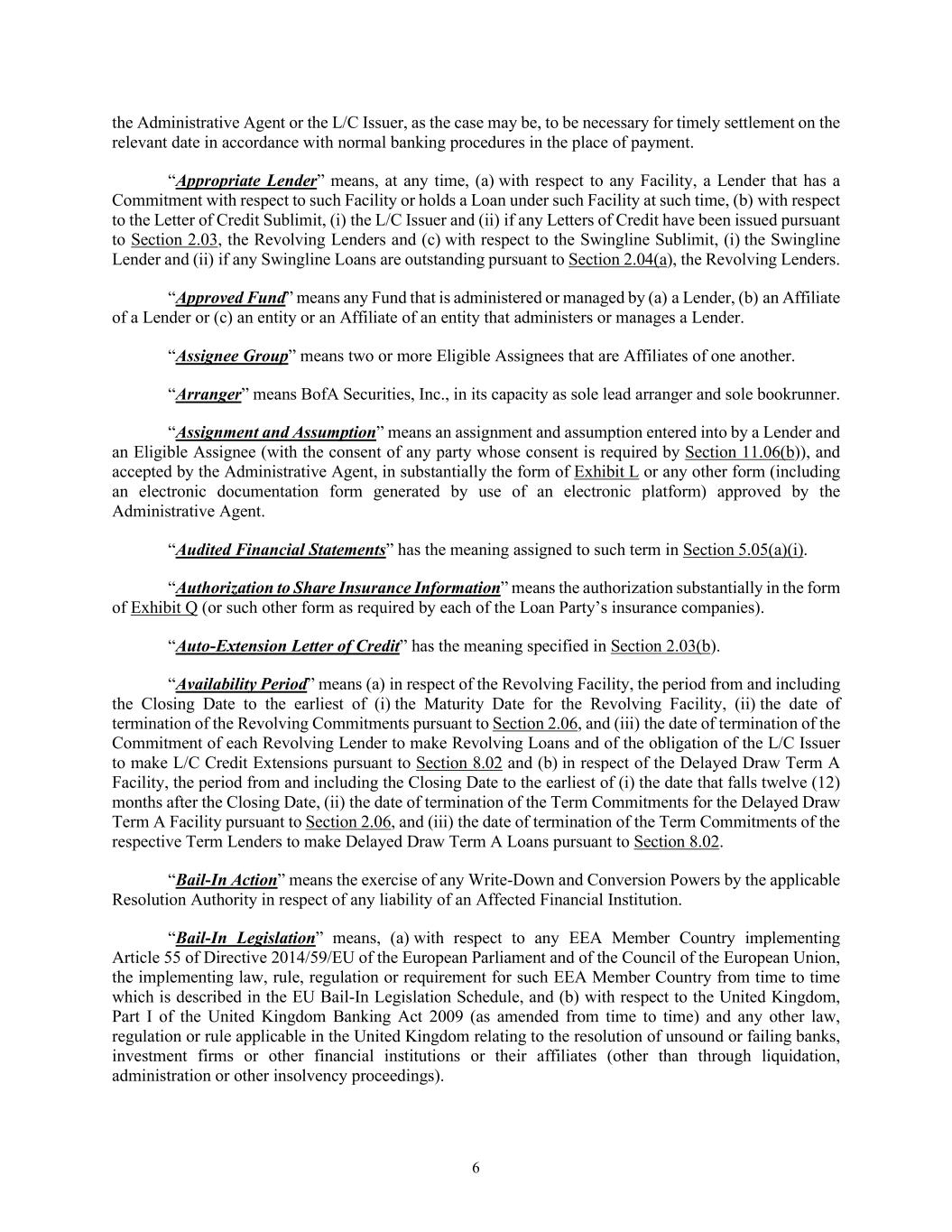 6 the Administrative Agent or the L/C Issuer, as the case may be, to be necessary for timely settlement on the relevant date in accordance with normal banking procedures in the place of payment. “Appropriate Lender” means, at any time, (a) with respect to any Facility, a Lender that has a Commitment with respect to such Facility or holds a Loan under such Facility at such time, (b) with respect to the Letter of Credit Sublimit, (i) the L/C Issuer and (ii) if any Letters of Credit have been issued pursuant to Section 2.03, the Revolving Lenders and (c) with respect to the Swingline Sublimit, (i) the Swingline Lender and (ii) if any Swingline Loans are outstanding pursuant to Section 2.04(a), the Revolving Lenders. “Approved Fund” means any Fund that is administered or managed by (a) a Lender, (b) an Affiliate of a Lender or (c) an entity or an Affiliate of an entity that administers or manages a Lender. “Assignee Group” means two or more Eligible Assignees that are Affiliates of one another. “Arranger” means BofA Securities, Inc., in its capacity as sole lead arranger and sole bookrunner. “Assignment and Assumption” means an assignment and assumption entered into by a Lender and an Eligible Assignee (with the consent of any party whose consent is required by Section 11.06(b)), and accepted by the Administrative Agent, in substantially the form of Exhibit L or any other form (including an electronic documentation form generated by use of an electronic platform) approved by the Administrative Agent. “Audited Financial Statements” has the meaning assigned to such term in Section 5.05(a)(i). “Authorization to Share Insurance Information” means the authorization substantially in the form of Exhibit Q (or such other form as required by each of the Loan Party’s insurance companies). “Auto-Extension Letter of Credit” has the meaning specified in Section 2.03(b). “Availability Period” means (a) in respect of the Revolving Facility, the period from and including the Closing Date to the earliest of (i) the Maturity Date for the Revolving Facility, (ii) the date of termination of the Revolving Commitments pursuant to Section 2.06, and (iii) the date of termination of the Commitment of each Revolving Lender to make Revolving Loans and of the obligation of the L/C Issuer to make L/C Credit Extensions pursuant to Section 8.02 and (b) in respect of the Delayed Draw Term A Facility, the period from and including the Closing Date to the earliest of (i) the date that falls twelve (12) months after the Closing Date, (ii) the date of termination of the Term Commitments for the Delayed Draw Term A Facility pursuant to Section 2.06, and (iii) the date of termination of the Term Commitments of the respective Term Lenders to make Delayed Draw Term A Loans pursuant to Section 8.02. “Bail-In Action” means the exercise of any Write-Down and Conversion Powers by the applicable Resolution Authority in respect of any liability of an Affected Financial Institution. “Bail-In Legislation” means, (a) with respect to any EEA Member Country implementing Article 55 of Directive 2014/59/EU of the European Parliament and of the Council of the European Union, the implementing law, rule, regulation or requirement for such EEA Member Country from time to time which is described in the EU Bail-In Legislation Schedule, and (b) with respect to the United Kingdom, Part I of the United Kingdom Banking Act 2009 (as amended from time to time) and any other law, regulation or rule applicable in the United Kingdom relating to the resolution of unsound or failing banks, investment firms or other financial institutions or their affiliates (other than through liquidation, administration or other insolvency proceedings).