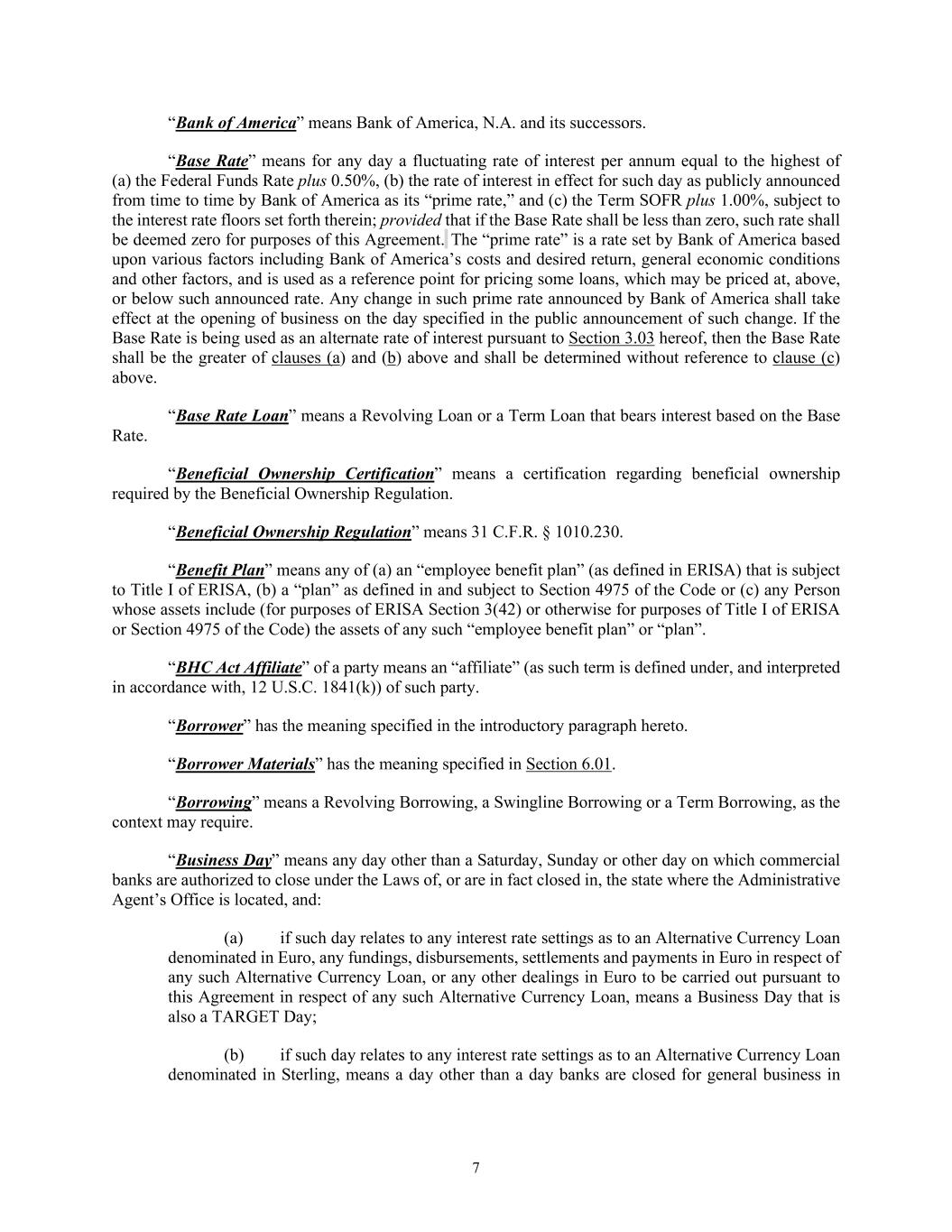 7 “Bank of America” means Bank of America, N.A. and its successors. “Base Rate” means for any day a fluctuating rate of interest per annum equal to the highest of (a) the Federal Funds Rate plus 0.50%, (b) the rate of interest in effect for such day as publicly announced from time to time by Bank of America as its “prime rate,” and (c) the Term SOFR plus 1.00%, subject to the interest rate floors set forth therein; provided that if the Base Rate shall be less than zero, such rate shall be deemed zero for purposes of this Agreement. The “prime rate” is a rate set by Bank of America based upon various factors including Bank of America’s costs and desired return, general economic conditions and other factors, and is used as a reference point for pricing some loans, which may be priced at, above, or below such announced rate. Any change in such prime rate announced by Bank of America shall take effect at the opening of business on the day specified in the public announcement of such change. If the Base Rate is being used as an alternate rate of interest pursuant to Section 3.03 hereof, then the Base Rate shall be the greater of clauses (a) and (b) above and shall be determined without reference to clause (c) above. “Base Rate Loan” means a Revolving Loan or a Term Loan that bears interest based on the Base Rate. “Beneficial Ownership Certification” means a certification regarding beneficial ownership required by the Beneficial Ownership Regulation. “Beneficial Ownership Regulation” means 31 C.F.R. § 1010.230. “Benefit Plan” means any of (a) an “employee benefit plan” (as defined in ERISA) that is subject to Title I of ERISA, (b) a “plan” as defined in and subject to Section 4975 of the Code or (c) any Person whose assets include (for purposes of ERISA Section 3(42) or otherwise for purposes of Title I of ERISA or Section 4975 of the Code) the assets of any such “employee benefit plan” or “plan”. “BHC Act Affiliate” of a party means an “affiliate” (as such term is defined under, and interpreted in accordance with, 12 U.S.C. 1841(k)) of such party. “Borrower” has the meaning specified in the introductory paragraph hereto. “Borrower Materials” has the meaning specified in Section 6.01. “Borrowing” means a Revolving Borrowing, a Swingline Borrowing or a Term Borrowing, as the context may require. “Business Day” means any day other than a Saturday, Sunday or other day on which commercial banks are authorized to close under the Laws of, or are in fact closed in, the state where the Administrative Agent’s Office is located, and: (a) if such day relates to any interest rate settings as to an Alternative Currency Loan denominated in Euro, any fundings, disbursements, settlements and payments in Euro in respect of any such Alternative Currency Loan, or any other dealings in Euro to be carried out pursuant to this Agreement in respect of any such Alternative Currency Loan, means a Business Day that is also a TARGET Day; (b) if such day relates to any interest rate settings as to an Alternative Currency Loan denominated in Sterling, means a day other than a day banks are closed for general business in