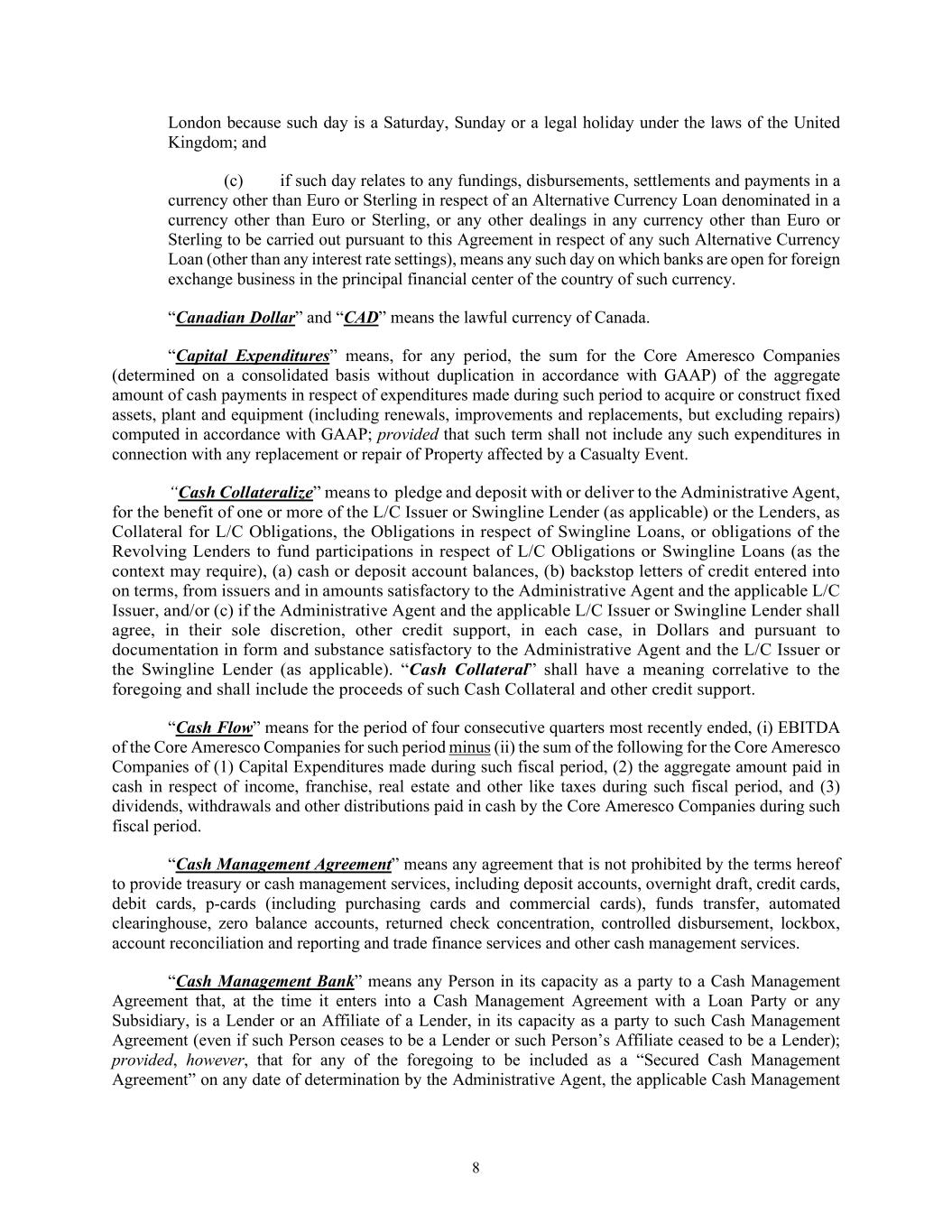 8 London because such day is a Saturday, Sunday or a legal holiday under the laws of the United Kingdom; and (c) if such day relates to any fundings, disbursements, settlements and payments in a currency other than Euro or Sterling in respect of an Alternative Currency Loan denominated in a currency other than Euro or Sterling, or any other dealings in any currency other than Euro or Sterling to be carried out pursuant to this Agreement in respect of any such Alternative Currency Loan (other than any interest rate settings), means any such day on which banks are open for foreign exchange business in the principal financial center of the country of such currency. “Canadian Dollar” and “CAD” means the lawful currency of Canada. “Capital Expenditures” means, for any period, the sum for the Core Ameresco Companies (determined on a consolidated basis without duplication in accordance with GAAP) of the aggregate amount of cash payments in respect of expenditures made during such period to acquire or construct fixed assets, plant and equipment (including renewals, improvements and replacements, but excluding repairs) computed in accordance with GAAP; provided that such term shall not include any such expenditures in connection with any replacement or repair of Property affected by a Casualty Event. “Cash Collateralize” means to pledge and deposit with or deliver to the Administrative Agent, for the benefit of one or more of the L/C Issuer or Swingline Lender (as applicable) or the Lenders, as Collateral for L/C Obligations, the Obligations in respect of Swingline Loans, or obligations of the Revolving Lenders to fund participations in respect of L/C Obligations or Swingline Loans (as the context may require), (a) cash or deposit account balances, (b) backstop letters of credit entered into on terms, from issuers and in amounts satisfactory to the Administrative Agent and the applicable L/C Issuer, and/or (c) if the Administrative Agent and the applicable L/C Issuer or Swingline Lender shall agree, in their sole discretion, other credit support, in each case, in Dollars and pursuant to documentation in form and substance satisfactory to the Administrative Agent and the L/C Issuer or the Swingline Lender (as applicable). “Cash Collateral” shall have a meaning correlative to the foregoing and shall include the proceeds of such Cash Collateral and other credit support. “Cash Flow” means for the period of four consecutive quarters most recently ended, (i) EBITDA of the Core Ameresco Companies for such period minus (ii) the sum of the following for the Core Ameresco Companies of (1) Capital Expenditures made during such fiscal period, (2) the aggregate amount paid in cash in respect of income, franchise, real estate and other like taxes during such fiscal period, and (3) dividends, withdrawals and other distributions paid in cash by the Core Ameresco Companies during such fiscal period. “Cash Management Agreement” means any agreement that is not prohibited by the terms hereof to provide treasury or cash management services, including deposit accounts, overnight draft, credit cards, debit cards, p-cards (including purchasing cards and commercial cards), funds transfer, automated clearinghouse, zero balance accounts, returned check concentration, controlled disbursement, lockbox, account reconciliation and reporting and trade finance services and other cash management services. “Cash Management Bank” means any Person in its capacity as a party to a Cash Management Agreement that, at the time it enters into a Cash Management Agreement with a Loan Party or any Subsidiary, is a Lender or an Affiliate of a Lender, in its capacity as a party to such Cash Management Agreement (even if such Person ceases to be a Lender or such Person’s Affiliate ceased to be a Lender); provided, however, that for any of the foregoing to be included as a “Secured Cash Management Agreement” on any date of determination by the Administrative Agent, the applicable Cash Management