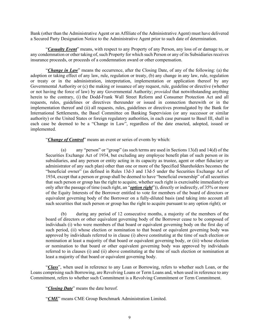 9 Bank (other than the Administrative Agent or an Affiliate of the Administrative Agent) must have delivered a Secured Party Designation Notice to the Administrative Agent prior to such date of determination. “Casualty Event” means, with respect to any Property of any Person, any loss of or damage to, or any condemnation or other taking of, such Property for which such Person or any of its Subsidiaries receives insurance proceeds, or proceeds of a condemnation award or other compensation. “Change in Law” means the occurrence, after the Closing Date, of any of the following: (a) the adoption or taking effect of any law, rule, regulation or treaty, (b) any change in any law, rule, regulation or treaty or in the administration, interpretation, implementation or application thereof by any Governmental Authority or (c) the making or issuance of any request, rule, guideline or directive (whether or not having the force of law) by any Governmental Authority; provided that notwithstanding anything herein to the contrary, (i) the Dodd-Frank Wall Street Reform and Consumer Protection Act and all requests, rules, guidelines or directives thereunder or issued in connection therewith or in the implementation thereof and (ii) all requests, rules, guidelines or directives promulgated by the Bank for International Settlements, the Basel Committee on Banking Supervision (or any successor or similar authority) or the United States or foreign regulatory authorities, in each case pursuant to Basel III, shall in each case be deemed to be a “Change in Law”, regardless of the date enacted, adopted, issued or implemented. “Change of Control” means an event or series of events by which: (a) any “person” or “group” (as such terms are used in Sections 13(d) and 14(d) of the Securities Exchange Act of 1934, but excluding any employee benefit plan of such person or its subsidiaries, and any person or entity acting in its capacity as trustee, agent or other fiduciary or administrator of any such plan) other than one or more of the Specified Shareholders becomes the “beneficial owner” (as defined in Rules 13d-3 and 13d-5 under the Securities Exchange Act of 1934, except that a person or group shall be deemed to have “beneficial ownership” of all securities that such person or group has the right to acquire, whether such right is exercisable immediately or only after the passage of time (such right, an “option right”)), directly or indirectly, of 35% or more of the Equity Interests of the Borrower entitled to vote for members of the board of directors or equivalent governing body of the Borrower on a fully-diluted basis (and taking into account all such securities that such person or group has the right to acquire pursuant to any option right); or (b) during any period of 12 consecutive months, a majority of the members of the board of directors or other equivalent governing body of the Borrower cease to be composed of individuals (i) who were members of that board or equivalent governing body on the first day of such period, (ii) whose election or nomination to that board or equivalent governing body was approved by individuals referred to in clause (i) above constituting at the time of such election or nomination at least a majority of that board or equivalent governing body, or (iii) whose election or nomination to that board or other equivalent governing body was approved by individuals referred to in clauses (i) and (ii) above constituting at the time of such election or nomination at least a majority of that board or equivalent governing body. “Class”, when used in reference to any Loan or Borrowing, refers to whether such Loan, or the Loans comprising such Borrowing, are Revolving Loans or Term Loans and, when used in reference to any Commitment, refers to whether such Commitment is a Revolving Commitment or Term Commitment. “Closing Date” means the date hereof. “CME” means CME Group Benchmark Administration Limited.