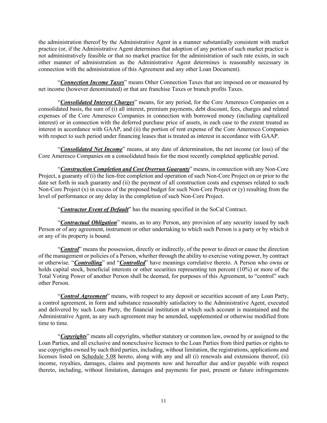 11 the administration thereof by the Administrative Agent in a manner substantially consistent with market practice (or, if the Administrative Agent determines that adoption of any portion of such market practice is not administratively feasible or that no market practice for the administration of such rate exists, in such other manner of administration as the Administrative Agent determines is reasonably necessary in connection with the administration of this Agreement and any other Loan Document). “Connection Income Taxes” means Other Connection Taxes that are imposed on or measured by net income (however denominated) or that are franchise Taxes or branch profits Taxes. “Consolidated Interest Charges” means, for any period, for the Core Ameresco Companies on a consolidated basis, the sum of (i) all interest, premium payments, debt discount, fees, charges and related expenses of the Core Ameresco Companies in connection with borrowed money (including capitalized interest) or in connection with the deferred purchase price of assets, in each case to the extent treated as interest in accordance with GAAP, and (ii) the portion of rent expense of the Core Ameresco Companies with respect to such period under financing leases that is treated as interest in accordance with GAAP. “Consolidated Net Income” means, at any date of determination, the net income (or loss) of the Core Ameresco Companies on a consolidated basis for the most recently completed applicable period. “Construction Completion and Cost Overrun Guaranty” means, in connection with any Non-Core Project, a guaranty of (i) the lien-free completion and operation of such Non-Core Project on or prior to the date set forth in such guaranty and (ii) the payment of all construction costs and expenses related to such Non-Core Project (x) in excess of the proposed budget for such Non-Core Project or (y) resulting from the level of performance or any delay in the completion of such Non-Core Project. “Contractor Event of Default” has the meaning specified in the SoCal Contract. “Contractual Obligation” means, as to any Person, any provision of any security issued by such Person or of any agreement, instrument or other undertaking to which such Person is a party or by which it or any of its property is bound. “Control” means the possession, directly or indirectly, of the power to direct or cause the direction of the management or policies of a Person, whether through the ability to exercise voting power, by contract or otherwise. “Controlling” and “Controlled” have meanings correlative thereto. A Person who owns or holds capital stock, beneficial interests or other securities representing ten percent (10%) or more of the Total Voting Power of another Person shall be deemed, for purposes of this Agreement, to “control” such other Person. “Control Agreement” means, with respect to any deposit or securities account of any Loan Party, a control agreement, in form and substance reasonably satisfactory to the Administrative Agent, executed and delivered by such Loan Party, the financial institution at which such account is maintained and the Administrative Agent, as any such agreement may be amended, supplemented or otherwise modified from time to time. “Copyrights” means all copyrights, whether statutory or common law, owned by or assigned to the Loan Parties, and all exclusive and nonexclusive licenses to the Loan Parties from third parties or rights to use copyrights owned by such third parties, including, without limitation, the registrations, applications and licenses listed on Schedule 5.08 hereto, along with any and all (i) renewals and extensions thereof, (ii) income, royalties, damages, claims and payments now and hereafter due and/or payable with respect thereto, including, without limitation, damages and payments for past, present or future infringements