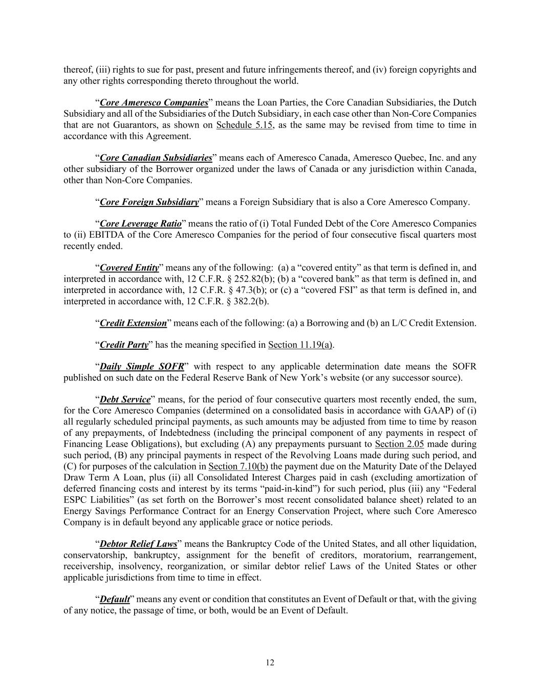 12 thereof, (iii) rights to sue for past, present and future infringements thereof, and (iv) foreign copyrights and any other rights corresponding thereto throughout the world. “Core Ameresco Companies” means the Loan Parties, the Core Canadian Subsidiaries, the Dutch Subsidiary and all of the Subsidiaries of the Dutch Subsidiary, in each case other than Non-Core Companies that are not Guarantors, as shown on Schedule 5.15, as the same may be revised from time to time in accordance with this Agreement. “Core Canadian Subsidiaries” means each of Ameresco Canada, Ameresco Quebec, Inc. and any other subsidiary of the Borrower organized under the laws of Canada or any jurisdiction within Canada, other than Non-Core Companies. “Core Foreign Subsidiary” means a Foreign Subsidiary that is also a Core Ameresco Company. “Core Leverage Ratio” means the ratio of (i) Total Funded Debt of the Core Ameresco Companies to (ii) EBITDA of the Core Ameresco Companies for the period of four consecutive fiscal quarters most recently ended. “Covered Entity” means any of the following: (a) a “covered entity” as that term is defined in, and interpreted in accordance with, 12 C.F.R. § 252.82(b); (b) a “covered bank” as that term is defined in, and interpreted in accordance with, 12 C.F.R. § 47.3(b); or (c) a “covered FSI” as that term is defined in, and interpreted in accordance with, 12 C.F.R. § 382.2(b). “Credit Extension” means each of the following: (a) a Borrowing and (b) an L/C Credit Extension. “Credit Party” has the meaning specified in Section 11.19(a). “Daily Simple SOFR” with respect to any applicable determination date means the SOFR published on such date on the Federal Reserve Bank of New York’s website (or any successor source). “Debt Service” means, for the period of four consecutive quarters most recently ended, the sum, for the Core Ameresco Companies (determined on a consolidated basis in accordance with GAAP) of (i) all regularly scheduled principal payments, as such amounts may be adjusted from time to time by reason of any prepayments, of Indebtedness (including the principal component of any payments in respect of Financing Lease Obligations), but excluding (A) any prepayments pursuant to Section 2.05 made during such period, (B) any principal payments in respect of the Revolving Loans made during such period, and (C) for purposes of the calculation in Section 7.10(b) the payment due on the Maturity Date of the Delayed Draw Term A Loan, plus (ii) all Consolidated Interest Charges paid in cash (excluding amortization of deferred financing costs and interest by its terms “paid-in-kind”) for such period, plus (iii) any “Federal ESPC Liabilities” (as set forth on the Borrower’s most recent consolidated balance sheet) related to an Energy Savings Performance Contract for an Energy Conservation Project, where such Core Ameresco Company is in default beyond any applicable grace or notice periods. “Debtor Relief Laws” means the Bankruptcy Code of the United States, and all other liquidation, conservatorship, bankruptcy, assignment for the benefit of creditors, moratorium, rearrangement, receivership, insolvency, reorganization, or similar debtor relief Laws of the United States or other applicable jurisdictions from time to time in effect. “Default” means any event or condition that constitutes an Event of Default or that, with the giving of any notice, the passage of time, or both, would be an Event of Default.