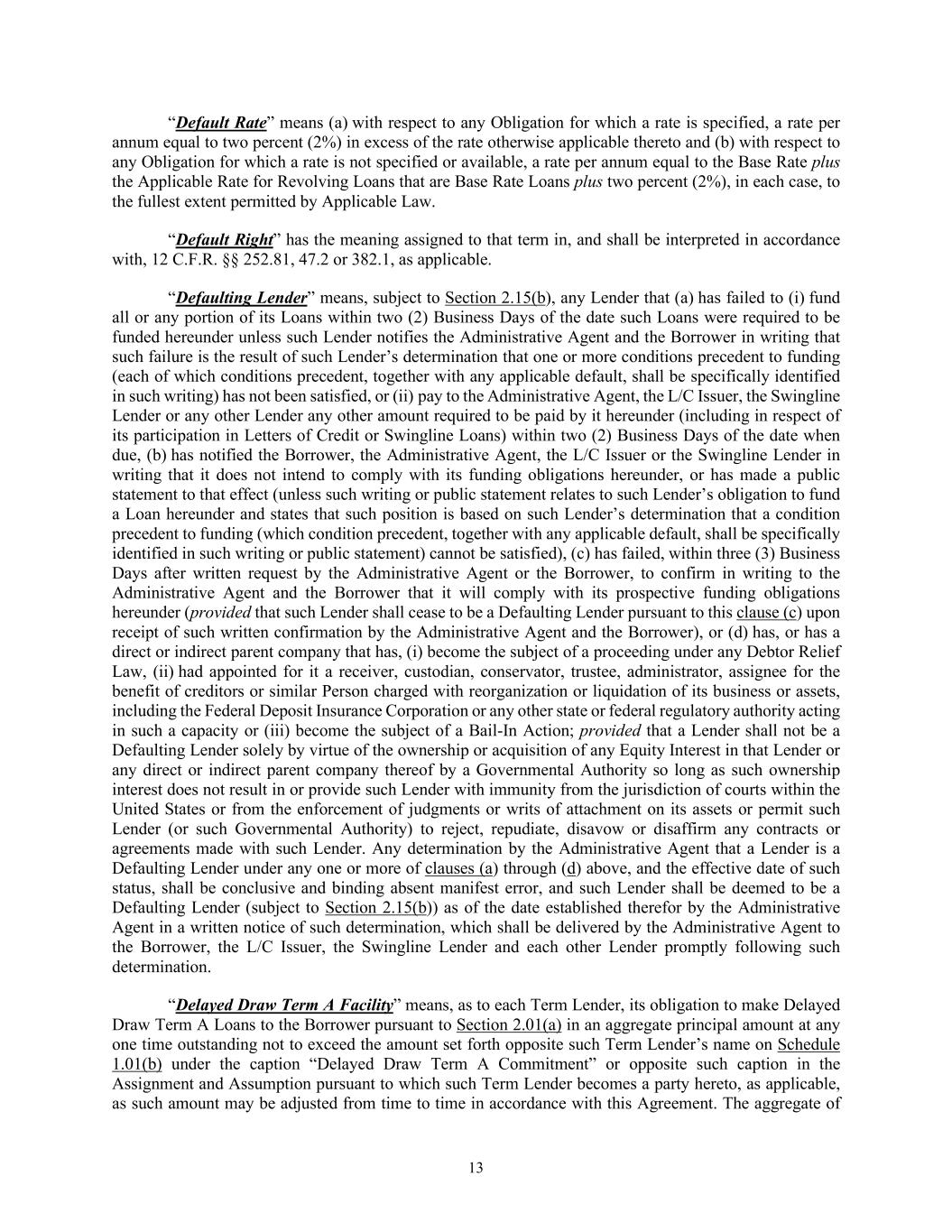 13 “Default Rate” means (a) with respect to any Obligation for which a rate is specified, a rate per annum equal to two percent (2%) in excess of the rate otherwise applicable thereto and (b) with respect to any Obligation for which a rate is not specified or available, a rate per annum equal to the Base Rate plus the Applicable Rate for Revolving Loans that are Base Rate Loans plus two percent (2%), in each case, to the fullest extent permitted by Applicable Law. “Default Right” has the meaning assigned to that term in, and shall be interpreted in accordance with, 12 C.F.R. §§ 252.81, 47.2 or 382.1, as applicable. “Defaulting Lender” means, subject to Section 2.15(b), any Lender that (a) has failed to (i) fund all or any portion of its Loans within two (2) Business Days of the date such Loans were required to be funded hereunder unless such Lender notifies the Administrative Agent and the Borrower in writing that such failure is the result of such Lender’s determination that one or more conditions precedent to funding (each of which conditions precedent, together with any applicable default, shall be specifically identified in such writing) has not been satisfied, or (ii) pay to the Administrative Agent, the L/C Issuer, the Swingline Lender or any other Lender any other amount required to be paid by it hereunder (including in respect of its participation in Letters of Credit or Swingline Loans) within two (2) Business Days of the date when due, (b) has notified the Borrower, the Administrative Agent, the L/C Issuer or the Swingline Lender in writing that it does not intend to comply with its funding obligations hereunder, or has made a public statement to that effect (unless such writing or public statement relates to such Lender’s obligation to fund a Loan hereunder and states that such position is based on such Lender’s determination that a condition precedent to funding (which condition precedent, together with any applicable default, shall be specifically identified in such writing or public statement) cannot be satisfied), (c) has failed, within three (3) Business Days after written request by the Administrative Agent or the Borrower, to confirm in writing to the Administrative Agent and the Borrower that it will comply with its prospective funding obligations hereunder (provided that such Lender shall cease to be a Defaulting Lender pursuant to this clause (c) upon receipt of such written confirmation by the Administrative Agent and the Borrower), or (d) has, or has a direct or indirect parent company that has, (i) become the subject of a proceeding under any Debtor Relief Law, (ii) had appointed for it a receiver, custodian, conservator, trustee, administrator, assignee for the benefit of creditors or similar Person charged with reorganization or liquidation of its business or assets, including the Federal Deposit Insurance Corporation or any other state or federal regulatory authority acting in such a capacity or (iii) become the subject of a Bail-In Action; provided that a Lender shall not be a Defaulting Lender solely by virtue of the ownership or acquisition of any Equity Interest in that Lender or any direct or indirect parent company thereof by a Governmental Authority so long as such ownership interest does not result in or provide such Lender with immunity from the jurisdiction of courts within the United States or from the enforcement of judgments or writs of attachment on its assets or permit such Lender (or such Governmental Authority) to reject, repudiate, disavow or disaffirm any contracts or agreements made with such Lender. Any determination by the Administrative Agent that a Lender is a Defaulting Lender under any one or more of clauses (a) through (d) above, and the effective date of such status, shall be conclusive and binding absent manifest error, and such Lender shall be deemed to be a Defaulting Lender (subject to Section 2.15(b)) as of the date established therefor by the Administrative Agent in a written notice of such determination, which shall be delivered by the Administrative Agent to the Borrower, the L/C Issuer, the Swingline Lender and each other Lender promptly following such determination. “Delayed Draw Term A Facility” means, as to each Term Lender, its obligation to make Delayed Draw Term A Loans to the Borrower pursuant to Section 2.01(a) in an aggregate principal amount at any one time outstanding not to exceed the amount set forth opposite such Term Lender’s name on Schedule 1.01(b) under the caption “Delayed Draw Term A Commitment” or opposite such caption in the Assignment and Assumption pursuant to which such Term Lender becomes a party hereto, as applicable, as such amount may be adjusted from time to time in accordance with this Agreement. The aggregate of