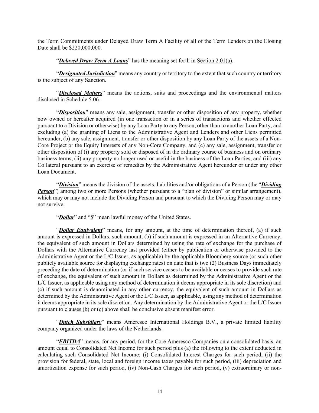 14 the Term Commitments under Delayed Draw Term A Facility of all of the Term Lenders on the Closing Date shall be $220,000,000. “Delayed Draw Term A Loans” has the meaning set forth in Section 2.01(a). “Designated Jurisdiction” means any country or territory to the extent that such country or territory is the subject of any Sanction. “Disclosed Matters” means the actions, suits and proceedings and the environmental matters disclosed in Schedule 5.06. “Disposition” means any sale, assignment, transfer or other disposition of any property, whether now owned or hereafter acquired (in one transaction or in a series of transactions and whether effected pursuant to a Division or otherwise) by any Loan Party to any Person, other than to another Loan Party, and excluding (a) the granting of Liens to the Administrative Agent and Lenders and other Liens permitted hereunder, (b) any sale, assignment, transfer or other disposition by any Loan Party of the assets of a Non- Core Project or the Equity Interests of any Non-Core Company, and (c) any sale, assignment, transfer or other disposition of (i) any property sold or disposed of in the ordinary course of business and on ordinary business terms, (ii) any property no longer used or useful in the business of the Loan Parties, and (iii) any Collateral pursuant to an exercise of remedies by the Administrative Agent hereunder or under any other Loan Document. “Division” means the division of the assets, liabilities and/or obligations of a Person (the “Dividing Person”) among two or more Persons (whether pursuant to a “plan of division” or similar arrangement), which may or may not include the Dividing Person and pursuant to which the Dividing Person may or may not survive. “Dollar” and “$” mean lawful money of the United States. “Dollar Equivalent” means, for any amount, at the time of determination thereof, (a) if such amount is expressed in Dollars, such amount, (b) if such amount is expressed in an Alternative Currency, the equivalent of such amount in Dollars determined by using the rate of exchange for the purchase of Dollars with the Alternative Currency last provided (either by publication or otherwise provided to the Administrative Agent or the L/C Issuer, as applicable) by the applicable Bloomberg source (or such other publicly available source for displaying exchange rates) on date that is two (2) Business Days immediately preceding the date of determination (or if such service ceases to be available or ceases to provide such rate of exchange, the equivalent of such amount in Dollars as determined by the Administrative Agent or the L/C Issuer, as applicable using any method of determination it deems appropriate in its sole discretion) and (c) if such amount is denominated in any other currency, the equivalent of such amount in Dollars as determined by the Administrative Agent or the L/C Issuer, as applicable, using any method of determination it deems appropriate in its sole discretion. Any determination by the Administrative Agent or the L/C Issuer pursuant to clauses (b) or (c) above shall be conclusive absent manifest error. “Dutch Subsidiary” means Ameresco International Holdings B.V., a private limited liability company organized under the laws of the Netherlands. “EBITDA” means, for any period, for the Core Ameresco Companies on a consolidated basis, an amount equal to Consolidated Net Income for such period plus (a) the following to the extent deducted in calculating such Consolidated Net Income: (i) Consolidated Interest Charges for such period, (ii) the provision for federal, state, local and foreign income taxes payable for such period, (iii) depreciation and amortization expense for such period, (iv) Non-Cash Charges for such period, (v) extraordinary or non-