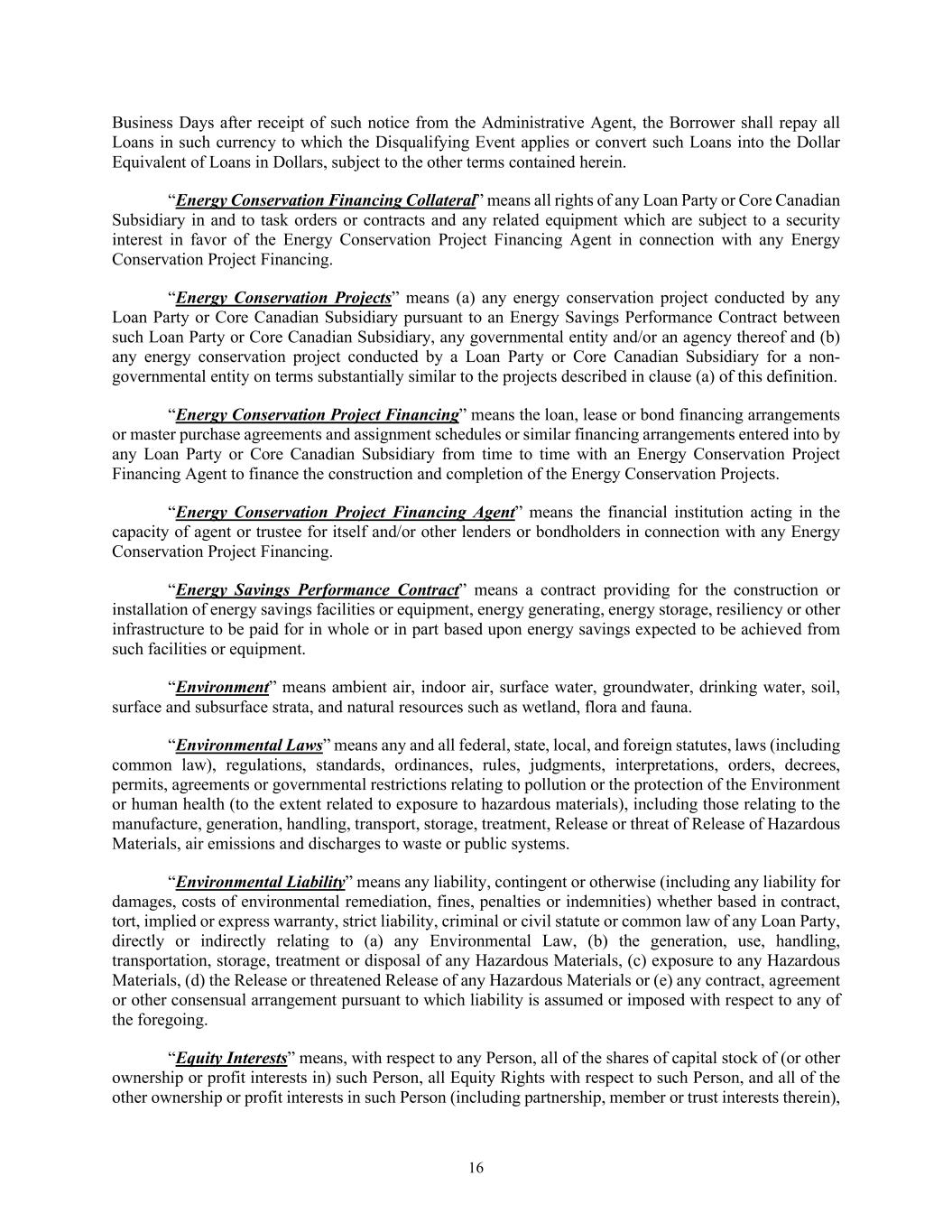 16 Business Days after receipt of such notice from the Administrative Agent, the Borrower shall repay all Loans in such currency to which the Disqualifying Event applies or convert such Loans into the Dollar Equivalent of Loans in Dollars, subject to the other terms contained herein. “Energy Conservation Financing Collateral” means all rights of any Loan Party or Core Canadian Subsidiary in and to task orders or contracts and any related equipment which are subject to a security interest in favor of the Energy Conservation Project Financing Agent in connection with any Energy Conservation Project Financing. “Energy Conservation Projects” means (a) any energy conservation project conducted by any Loan Party or Core Canadian Subsidiary pursuant to an Energy Savings Performance Contract between such Loan Party or Core Canadian Subsidiary, any governmental entity and/or an agency thereof and (b) any energy conservation project conducted by a Loan Party or Core Canadian Subsidiary for a non- governmental entity on terms substantially similar to the projects described in clause (a) of this definition. “Energy Conservation Project Financing” means the loan, lease or bond financing arrangements or master purchase agreements and assignment schedules or similar financing arrangements entered into by any Loan Party or Core Canadian Subsidiary from time to time with an Energy Conservation Project Financing Agent to finance the construction and completion of the Energy Conservation Projects. “Energy Conservation Project Financing Agent” means the financial institution acting in the capacity of agent or trustee for itself and/or other lenders or bondholders in connection with any Energy Conservation Project Financing. “Energy Savings Performance Contract” means a contract providing for the construction or installation of energy savings facilities or equipment, energy generating, energy storage, resiliency or other infrastructure to be paid for in whole or in part based upon energy savings expected to be achieved from such facilities or equipment. “Environment” means ambient air, indoor air, surface water, groundwater, drinking water, soil, surface and subsurface strata, and natural resources such as wetland, flora and fauna. “Environmental Laws” means any and all federal, state, local, and foreign statutes, laws (including common law), regulations, standards, ordinances, rules, judgments, interpretations, orders, decrees, permits, agreements or governmental restrictions relating to pollution or the protection of the Environment or human health (to the extent related to exposure to hazardous materials), including those relating to the manufacture, generation, handling, transport, storage, treatment, Release or threat of Release of Hazardous Materials, air emissions and discharges to waste or public systems. “Environmental Liability” means any liability, contingent or otherwise (including any liability for damages, costs of environmental remediation, fines, penalties or indemnities) whether based in contract, tort, implied or express warranty, strict liability, criminal or civil statute or common law of any Loan Party, directly or indirectly relating to (a) any Environmental Law, (b) the generation, use, handling, transportation, storage, treatment or disposal of any Hazardous Materials, (c) exposure to any Hazardous Materials, (d) the Release or threatened Release of any Hazardous Materials or (e) any contract, agreement or other consensual arrangement pursuant to which liability is assumed or imposed with respect to any of the foregoing. “Equity Interests” means, with respect to any Person, all of the shares of capital stock of (or other ownership or profit interests in) such Person, all Equity Rights with respect to such Person, and all of the other ownership or profit interests in such Person (including partnership, member or trust interests therein),