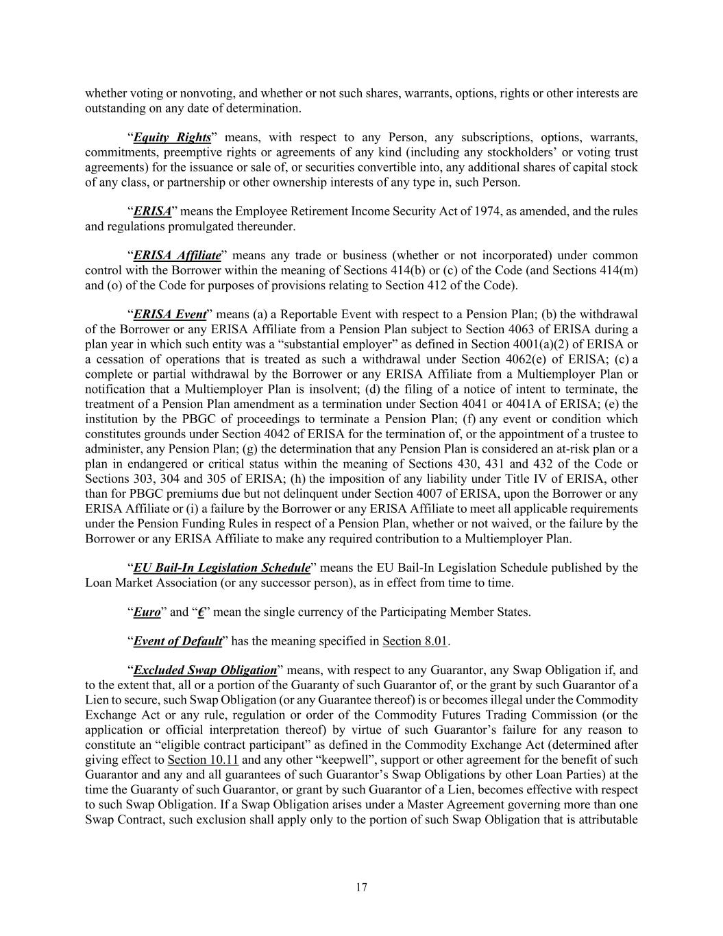 17 whether voting or nonvoting, and whether or not such shares, warrants, options, rights or other interests are outstanding on any date of determination. “Equity Rights” means, with respect to any Person, any subscriptions, options, warrants, commitments, preemptive rights or agreements of any kind (including any stockholders’ or voting trust agreements) for the issuance or sale of, or securities convertible into, any additional shares of capital stock of any class, or partnership or other ownership interests of any type in, such Person. “ERISA” means the Employee Retirement Income Security Act of 1974, as amended, and the rules and regulations promulgated thereunder. “ERISA Affiliate” means any trade or business (whether or not incorporated) under common control with the Borrower within the meaning of Sections 414(b) or (c) of the Code (and Sections 414(m) and (o) of the Code for purposes of provisions relating to Section 412 of the Code). “ERISA Event” means (a) a Reportable Event with respect to a Pension Plan; (b) the withdrawal of the Borrower or any ERISA Affiliate from a Pension Plan subject to Section 4063 of ERISA during a plan year in which such entity was a “substantial employer” as defined in Section 4001(a)(2) of ERISA or a cessation of operations that is treated as such a withdrawal under Section 4062(e) of ERISA; (c) a complete or partial withdrawal by the Borrower or any ERISA Affiliate from a Multiemployer Plan or notification that a Multiemployer Plan is insolvent; (d) the filing of a notice of intent to terminate, the treatment of a Pension Plan amendment as a termination under Section 4041 or 4041A of ERISA; (e) the institution by the PBGC of proceedings to terminate a Pension Plan; (f) any event or condition which constitutes grounds under Section 4042 of ERISA for the termination of, or the appointment of a trustee to administer, any Pension Plan; (g) the determination that any Pension Plan is considered an at-risk plan or a plan in endangered or critical status within the meaning of Sections 430, 431 and 432 of the Code or Sections 303, 304 and 305 of ERISA; (h) the imposition of any liability under Title IV of ERISA, other than for PBGC premiums due but not delinquent under Section 4007 of ERISA, upon the Borrower or any ERISA Affiliate or (i) a failure by the Borrower or any ERISA Affiliate to meet all applicable requirements under the Pension Funding Rules in respect of a Pension Plan, whether or not waived, or the failure by the Borrower or any ERISA Affiliate to make any required contribution to a Multiemployer Plan. “EU Bail-In Legislation Schedule” means the EU Bail-In Legislation Schedule published by the Loan Market Association (or any successor person), as in effect from time to time. “Euro” and “€” mean the single currency of the Participating Member States. “Event of Default” has the meaning specified in Section 8.01. “Excluded Swap Obligation” means, with respect to any Guarantor, any Swap Obligation if, and to the extent that, all or a portion of the Guaranty of such Guarantor of, or the grant by such Guarantor of a Lien to secure, such Swap Obligation (or any Guarantee thereof) is or becomes illegal under the Commodity Exchange Act or any rule, regulation or order of the Commodity Futures Trading Commission (or the application or official interpretation thereof) by virtue of such Guarantor’s failure for any reason to constitute an “eligible contract participant” as defined in the Commodity Exchange Act (determined after giving effect to Section 10.11 and any other “keepwell”, support or other agreement for the benefit of such Guarantor and any and all guarantees of such Guarantor’s Swap Obligations by other Loan Parties) at the time the Guaranty of such Guarantor, or grant by such Guarantor of a Lien, becomes effective with respect to such Swap Obligation. If a Swap Obligation arises under a Master Agreement governing more than one Swap Contract, such exclusion shall apply only to the portion of such Swap Obligation that is attributable