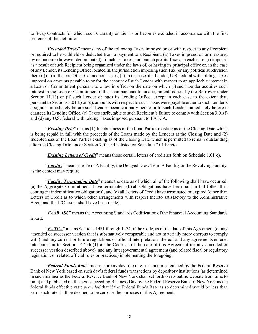 18 to Swap Contracts for which such Guaranty or Lien is or becomes excluded in accordance with the first sentence of this definition. “Excluded Taxes” means any of the following Taxes imposed on or with respect to any Recipient or required to be withheld or deducted from a payment to a Recipient, (a) Taxes imposed on or measured by net income (however denominated), franchise Taxes, and branch profits Taxes, in each case, (i) imposed as a result of such Recipient being organized under the laws of, or having its principal office or, in the case of any Lender, its Lending Office located in, the jurisdiction imposing such Tax (or any political subdivision thereof) or (ii) that are Other Connection Taxes, (b) in the case of a Lender, U.S. federal withholding Taxes imposed on amounts payable to or for the account of such Lender with respect to an applicable interest in a Loan or Commitment pursuant to a law in effect on the date on which (i) such Lender acquires such interest in the Loan or Commitment (other than pursuant to an assignment request by the Borrower under Section 11.13) or (ii) such Lender changes its Lending Office, except in each case to the extent that, pursuant to Sections 3.01(b) or (d), amounts with respect to such Taxes were payable either to such Lender’s assignor immediately before such Lender became a party hereto or to such Lender immediately before it changed its Lending Office, (c) Taxes attributable to such Recipient’s failure to comply with Section 3.01(f) and (d) any U.S. federal withholding Taxes imposed pursuant to FATCA. “Existing Debt” means (1) Indebtedness of the Loan Parties existing as of the Closing Date which is being repaid in full with the proceeds of the Loans made by the Lenders at the Closing Date and (2) Indebtedness of the Loan Parties existing as of the Closing Date which is permitted to remain outstanding after the Closing Date under Section 7.01 and is listed on Schedule 7.01 hereto. “Existing Letters of Credit” means those certain letters of credit set forth on Schedule 1.01(c). “Facility” means the Term A Facility, the Delayed Draw Term A Facility or the Revolving Facility, as the context may require. “Facility Termination Date” means the date as of which all of the following shall have occurred: (a) the Aggregate Commitments have terminated, (b) all Obligations have been paid in full (other than contingent indemnification obligations), and (c) all Letters of Credit have terminated or expired (other than Letters of Credit as to which other arrangements with respect thereto satisfactory to the Administrative Agent and the L/C Issuer shall have been made). “FASB ASC” means the Accounting Standards Codification of the Financial Accounting Standards Board. “FATCA” means Sections 1471 through 1474 of the Code, as of the date of this Agreement (or any amended or successor version that is substantively comparable and not materially more onerous to comply with) and any current or future regulations or official interpretations thereof and any agreements entered into pursuant to Section 1471(b)(1) of the Code, as of the date of this Agreement (or any amended or successor version described above) and any intergovernmental agreement (and related fiscal or regulatory legislation, or related official rules or practices) implementing the foregoing. “Federal Funds Rate” means, for any day, the rate per annum calculated by the Federal Reserve Bank of New York based on such day’s federal funds transactions by depository institutions (as determined in such manner as the Federal Reserve Bank of New York shall set forth on its public website from time to time) and published on the next succeeding Business Day by the Federal Reserve Bank of New York as the federal funds effective rate; provided that if the Federal Funds Rate as so determined would be less than zero, such rate shall be deemed to be zero for the purposes of this Agreement.