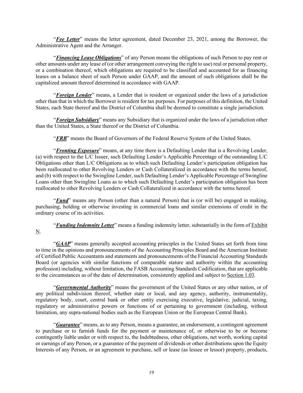 19 “Fee Letter” means the letter agreement, dated December 23, 2021, among the Borrower, the Administrative Agent and the Arranger. “Financing Lease Obligations” of any Person means the obligations of such Person to pay rent or other amounts under any lease of (or other arrangement conveying the right to use) real or personal property, or a combination thereof, which obligations are required to be classified and accounted for as financing leases on a balance sheet of such Person under GAAP, and the amount of such obligations shall be the capitalized amount thereof determined in accordance with GAAP. “Foreign Lender” means, a Lender that is resident or organized under the laws of a jurisdiction other than that in which the Borrower is resident for tax purposes. For purposes of this definition, the United States, each State thereof and the District of Columbia shall be deemed to constitute a single jurisdiction. “Foreign Subsidiary” means any Subsidiary that is organized under the laws of a jurisdiction other than the United States, a State thereof or the District of Columbia. “FRB” means the Board of Governors of the Federal Reserve System of the United States. “Fronting Exposure” means, at any time there is a Defaulting Lender that is a Revolving Lender, (a) with respect to the L/C Issuer, such Defaulting Lender’s Applicable Percentage of the outstanding L/C Obligations other than L/C Obligations as to which such Defaulting Lender’s participation obligation has been reallocated to other Revolving Lenders or Cash Collateralized in accordance with the terms hereof, and (b) with respect to the Swingline Lender, such Defaulting Lender’s Applicable Percentage of Swingline Loans other than Swingline Loans as to which such Defaulting Lender’s participation obligation has been reallocated to other Revolving Lenders or Cash Collateralized in accordance with the terms hereof. “Fund” means any Person (other than a natural Person) that is (or will be) engaged in making, purchasing, holding or otherwise investing in commercial loans and similar extensions of credit in the ordinary course of its activities. “Funding Indemnity Letter” means a funding indemnity letter, substantially in the form of Exhibit N. “GAAP” means generally accepted accounting principles in the United States set forth from time to time in the opinions and pronouncements of the Accounting Principles Board and the American Institute of Certified Public Accountants and statements and pronouncements of the Financial Accounting Standards Board (or agencies with similar functions of comparable stature and authority within the accounting profession) including, without limitation, the FASB Accounting Standards Codification, that are applicable to the circumstances as of the date of determination, consistently applied and subject to Section 1.03. “Governmental Authority” means the government of the United States or any other nation, or of any political subdivision thereof, whether state or local, and any agency, authority, instrumentality, regulatory body, court, central bank or other entity exercising executive, legislative, judicial, taxing, regulatory or administrative powers or functions of or pertaining to government (including, without limitation, any supra-national bodies such as the European Union or the European Central Bank). “Guarantee” means, as to any Person, means a guarantee, an endorsement, a contingent agreement to purchase or to furnish funds for the payment or maintenance of, or otherwise to be or become contingently liable under or with respect to, the Indebtedness, other obligations, net worth, working capital or earnings of any Person, or a guarantee of the payment of dividends or other distributions upon the Equity Interests of any Person, or an agreement to purchase, sell or lease (as lessee or lessor) property, products,