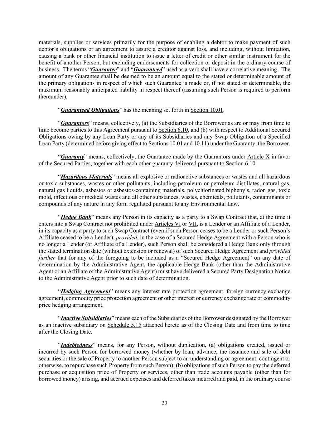 20 materials, supplies or services primarily for the purpose of enabling a debtor to make payment of such debtor’s obligations or an agreement to assure a creditor against loss, and including, without limitation, causing a bank or other financial institution to issue a letter of credit or other similar instrument for the benefit of another Person, but excluding endorsements for collection or deposit in the ordinary course of business. The terms “Guarantee” and “Guaranteed” used as a verb shall have a correlative meaning. The amount of any Guarantee shall be deemed to be an amount equal to the stated or determinable amount of the primary obligations in respect of which such Guarantee is made or, if not stated or determinable, the maximum reasonably anticipated liability in respect thereof (assuming such Person is required to perform thereunder). “Guaranteed Obligations” has the meaning set forth in Section 10.01. “Guarantors” means, collectively, (a) the Subsidiaries of the Borrower as are or may from time to time become parties to this Agreement pursuant to Section 6.10, and (b) with respect to Additional Secured Obligations owing by any Loan Party or any of its Subsidiaries and any Swap Obligation of a Specified Loan Party (determined before giving effect to Sections 10.01 and 10.11) under the Guaranty, the Borrower. “Guaranty” means, collectively, the Guarantee made by the Guarantors under Article X in favor of the Secured Parties, together with each other guaranty delivered pursuant to Section 6.10. “Hazardous Materials” means all explosive or radioactive substances or wastes and all hazardous or toxic substances, wastes or other pollutants, including petroleum or petroleum distillates, natural gas, natural gas liquids, asbestos or asbestos-containing materials, polychlorinated biphenyls, radon gas, toxic mold, infectious or medical wastes and all other substances, wastes, chemicals, pollutants, contaminants or compounds of any nature in any form regulated pursuant to any Environmental Law. “Hedge Bank” means any Person in its capacity as a party to a Swap Contract that, at the time it enters into a Swap Contract not prohibited under Articles VI or VII, is a Lender or an Affiliate of a Lender, in its capacity as a party to such Swap Contract (even if such Person ceases to be a Lender or such Person’s Affiliate ceased to be a Lender); provided, in the case of a Secured Hedge Agreement with a Person who is no longer a Lender (or Affiliate of a Lender), such Person shall be considered a Hedge Bank only through the stated termination date (without extension or renewal) of such Secured Hedge Agreement and provided further that for any of the foregoing to be included as a “Secured Hedge Agreement” on any date of determination by the Administrative Agent, the applicable Hedge Bank (other than the Administrative Agent or an Affiliate of the Administrative Agent) must have delivered a Secured Party Designation Notice to the Administrative Agent prior to such date of determination. “Hedging Agreement” means any interest rate protection agreement, foreign currency exchange agreement, commodity price protection agreement or other interest or currency exchange rate or commodity price hedging arrangement. “Inactive Subsidiaries” means each of the Subsidiaries of the Borrower designated by the Borrower as an inactive subsidiary on Schedule 5.15 attached hereto as of the Closing Date and from time to time after the Closing Date. “Indebtedness” means, for any Person, without duplication, (a) obligations created, issued or incurred by such Person for borrowed money (whether by loan, advance, the issuance and sale of debt securities or the sale of Property to another Person subject to an understanding or agreement, contingent or otherwise, to repurchase such Property from such Person); (b) obligations of such Person to pay the deferred purchase or acquisition price of Property or services, other than trade accounts payable (other than for borrowed money) arising, and accrued expenses and deferred taxes incurred and paid, in the ordinary course