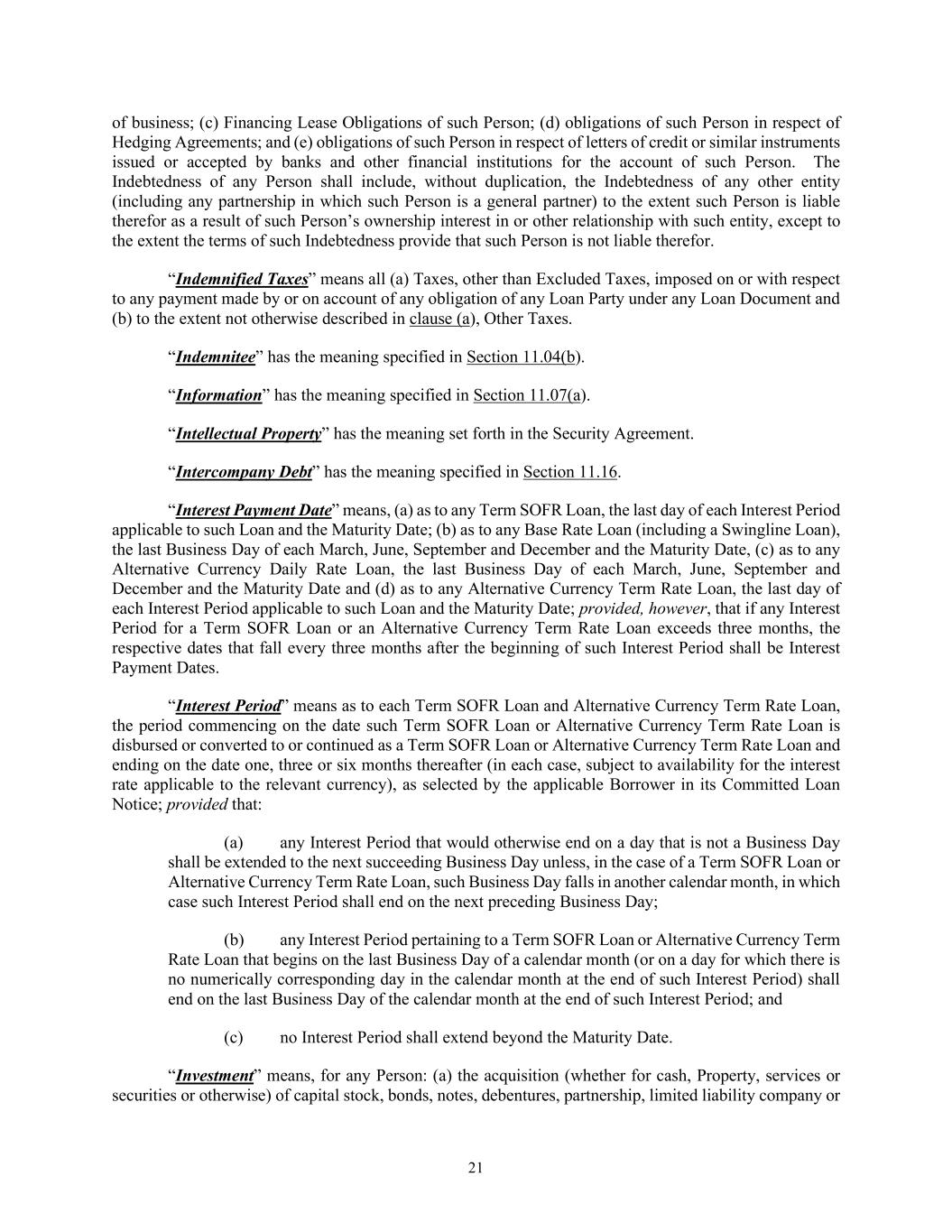 21 of business; (c) Financing Lease Obligations of such Person; (d) obligations of such Person in respect of Hedging Agreements; and (e) obligations of such Person in respect of letters of credit or similar instruments issued or accepted by banks and other financial institutions for the account of such Person. The Indebtedness of any Person shall include, without duplication, the Indebtedness of any other entity (including any partnership in which such Person is a general partner) to the extent such Person is liable therefor as a result of such Person’s ownership interest in or other relationship with such entity, except to the extent the terms of such Indebtedness provide that such Person is not liable therefor. “Indemnified Taxes” means all (a) Taxes, other than Excluded Taxes, imposed on or with respect to any payment made by or on account of any obligation of any Loan Party under any Loan Document and (b) to the extent not otherwise described in clause (a), Other Taxes. “Indemnitee” has the meaning specified in Section 11.04(b). “Information” has the meaning specified in Section 11.07(a). “Intellectual Property” has the meaning set forth in the Security Agreement. “Intercompany Debt” has the meaning specified in Section 11.16. “Interest Payment Date” means, (a) as to any Term SOFR Loan, the last day of each Interest Period applicable to such Loan and the Maturity Date; (b) as to any Base Rate Loan (including a Swingline Loan), the last Business Day of each March, June, September and December and the Maturity Date, (c) as to any Alternative Currency Daily Rate Loan, the last Business Day of each March, June, September and December and the Maturity Date and (d) as to any Alternative Currency Term Rate Loan, the last day of each Interest Period applicable to such Loan and the Maturity Date; provided, however, that if any Interest Period for a Term SOFR Loan or an Alternative Currency Term Rate Loan exceeds three months, the respective dates that fall every three months after the beginning of such Interest Period shall be Interest Payment Dates. “Interest Period” means as to each Term SOFR Loan and Alternative Currency Term Rate Loan, the period commencing on the date such Term SOFR Loan or Alternative Currency Term Rate Loan is disbursed or converted to or continued as a Term SOFR Loan or Alternative Currency Term Rate Loan and ending on the date one, three or six months thereafter (in each case, subject to availability for the interest rate applicable to the relevant currency), as selected by the applicable Borrower in its Committed Loan Notice; provided that: (a) any Interest Period that would otherwise end on a day that is not a Business Day shall be extended to the next succeeding Business Day unless, in the case of a Term SOFR Loan or Alternative Currency Term Rate Loan, such Business Day falls in another calendar month, in which case such Interest Period shall end on the next preceding Business Day; (b) any Interest Period pertaining to a Term SOFR Loan or Alternative Currency Term Rate Loan that begins on the last Business Day of a calendar month (or on a day for which there is no numerically corresponding day in the calendar month at the end of such Interest Period) shall end on the last Business Day of the calendar month at the end of such Interest Period; and (c) no Interest Period shall extend beyond the Maturity Date. “Investment” means, for any Person: (a) the acquisition (whether for cash, Property, services or securities or otherwise) of capital stock, bonds, notes, debentures, partnership, limited liability company or