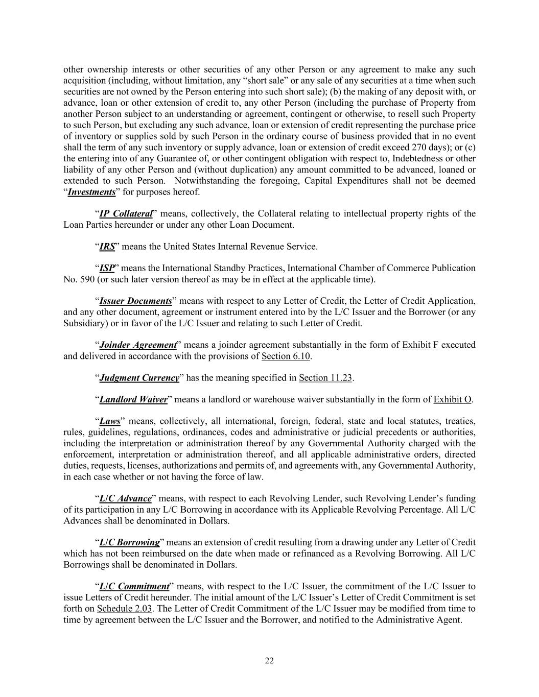 22 other ownership interests or other securities of any other Person or any agreement to make any such acquisition (including, without limitation, any “short sale” or any sale of any securities at a time when such securities are not owned by the Person entering into such short sale); (b) the making of any deposit with, or advance, loan or other extension of credit to, any other Person (including the purchase of Property from another Person subject to an understanding or agreement, contingent or otherwise, to resell such Property to such Person, but excluding any such advance, loan or extension of credit representing the purchase price of inventory or supplies sold by such Person in the ordinary course of business provided that in no event shall the term of any such inventory or supply advance, loan or extension of credit exceed 270 days); or (c) the entering into of any Guarantee of, or other contingent obligation with respect to, Indebtedness or other liability of any other Person and (without duplication) any amount committed to be advanced, loaned or extended to such Person. Notwithstanding the foregoing, Capital Expenditures shall not be deemed “Investments” for purposes hereof. “IP Collateral” means, collectively, the Collateral relating to intellectual property rights of the Loan Parties hereunder or under any other Loan Document. “IRS” means the United States Internal Revenue Service. “ISP” means the International Standby Practices, International Chamber of Commerce Publication No. 590 (or such later version thereof as may be in effect at the applicable time). “Issuer Documents” means with respect to any Letter of Credit, the Letter of Credit Application, and any other document, agreement or instrument entered into by the L/C Issuer and the Borrower (or any Subsidiary) or in favor of the L/C Issuer and relating to such Letter of Credit. “Joinder Agreement” means a joinder agreement substantially in the form of Exhibit F executed and delivered in accordance with the provisions of Section 6.10. “Judgment Currency” has the meaning specified in Section 11.23. “Landlord Waiver” means a landlord or warehouse waiver substantially in the form of Exhibit O. “Laws” means, collectively, all international, foreign, federal, state and local statutes, treaties, rules, guidelines, regulations, ordinances, codes and administrative or judicial precedents or authorities, including the interpretation or administration thereof by any Governmental Authority charged with the enforcement, interpretation or administration thereof, and all applicable administrative orders, directed duties, requests, licenses, authorizations and permits of, and agreements with, any Governmental Authority, in each case whether or not having the force of law. “L/C Advance” means, with respect to each Revolving Lender, such Revolving Lender’s funding of its participation in any L/C Borrowing in accordance with its Applicable Revolving Percentage. All L/C Advances shall be denominated in Dollars. “L/C Borrowing” means an extension of credit resulting from a drawing under any Letter of Credit which has not been reimbursed on the date when made or refinanced as a Revolving Borrowing. All L/C Borrowings shall be denominated in Dollars. “L/C Commitment” means, with respect to the L/C Issuer, the commitment of the L/C Issuer to issue Letters of Credit hereunder. The initial amount of the L/C Issuer’s Letter of Credit Commitment is set forth on Schedule 2.03. The Letter of Credit Commitment of the L/C Issuer may be modified from time to time by agreement between the L/C Issuer and the Borrower, and notified to the Administrative Agent.