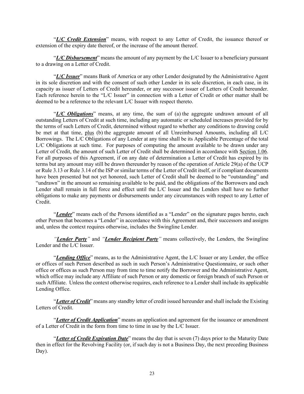 23 “L/C Credit Extension” means, with respect to any Letter of Credit, the issuance thereof or extension of the expiry date thereof, or the increase of the amount thereof. “L/C Disbursement” means the amount of any payment by the L/C Issuer to a beneficiary pursuant to a drawing on a Letter of Credit. “L/C Issuer” means Bank of America or any other Lender designated by the Administrative Agent in its sole discretion and with the consent of such other Lender in its sole discretion, in each case, in its capacity as issuer of Letters of Credit hereunder, or any successor issuer of Letters of Credit hereunder. Each reference herein to the “L/C Issuer” in connection with a Letter of Credit or other matter shall be deemed to be a reference to the relevant L/C Issuer with respect thereto. “L/C Obligations” means, at any time, the sum of (a) the aggregate undrawn amount of all outstanding Letters of Credit at such time, including any automatic or scheduled increases provided for by the terms of such Letters of Credit, determined without regard to whether any conditions to drawing could be met at that time, plus (b) the aggregate amount of all Unreimbursed Amounts, including all L/C Borrowings. The L/C Obligations of any Lender at any time shall be its Applicable Percentage of the total L/C Obligations at such time. For purposes of computing the amount available to be drawn under any Letter of Credit, the amount of such Letter of Credit shall be determined in accordance with Section 1.06. For all purposes of this Agreement, if on any date of determination a Letter of Credit has expired by its terms but any amount may still be drawn thereunder by reason of the operation of Article 29(a) of the UCP or Rule 3.13 or Rule 3.14 of the ISP or similar terms of the Letter of Credit itself, or if compliant documents have been presented but not yet honored, such Letter of Credit shall be deemed to be “outstanding” and “undrawn” in the amount so remaining available to be paid, and the obligations of the Borrowers and each Lender shall remain in full force and effect until the L/C Issuer and the Lenders shall have no further obligations to make any payments or disbursements under any circumstances with respect to any Letter of Credit. “Lender” means each of the Persons identified as a “Lender” on the signature pages hereto, each other Person that becomes a “Lender” in accordance with this Agreement and, their successors and assigns and, unless the context requires otherwise, includes the Swingline Lender. “Lender Party” and “Lender Recipient Party” means collectively, the Lenders, the Swingline Lender and the L/C Issuer. “Lending Office” means, as to the Administrative Agent, the L/C Issuer or any Lender, the office or offices of such Person described as such in such Person’s Administrative Questionnaire, or such other office or offices as such Person may from time to time notify the Borrower and the Administrative Agent, which office may include any Affiliate of such Person or any domestic or foreign branch of such Person or such Affiliate. Unless the context otherwise requires, each reference to a Lender shall include its applicable Lending Office. “Letter of Credit” means any standby letter of credit issued hereunder and shall include the Existing Letters of Credit. “Letter of Credit Application” means an application and agreement for the issuance or amendment of a Letter of Credit in the form from time to time in use by the L/C Issuer. “Letter of Credit Expiration Date” means the day that is seven (7) days prior to the Maturity Date then in effect for the Revolving Facility (or, if such day is not a Business Day, the next preceding Business Day).