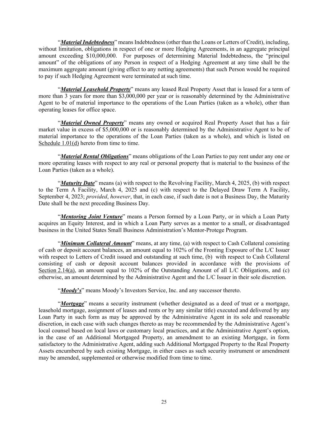 25 “Material Indebtedness” means Indebtedness (other than the Loans or Letters of Credit), including, without limitation, obligations in respect of one or more Hedging Agreements, in an aggregate principal amount exceeding $10,000,000. For purposes of determining Material Indebtedness, the “principal amount” of the obligations of any Person in respect of a Hedging Agreement at any time shall be the maximum aggregate amount (giving effect to any netting agreements) that such Person would be required to pay if such Hedging Agreement were terminated at such time. “Material Leasehold Property” means any leased Real Property Asset that is leased for a term of more than 3 years for more than $3,000,000 per year or is reasonably determined by the Administrative Agent to be of material importance to the operations of the Loan Parties (taken as a whole), other than operating leases for office space. “Material Owned Property” means any owned or acquired Real Property Asset that has a fair market value in excess of $5,000,000 or is reasonably determined by the Administrative Agent to be of material importance to the operations of the Loan Parties (taken as a whole), and which is listed on Schedule 1.01(d) hereto from time to time. “Material Rental Obligations” means obligations of the Loan Parties to pay rent under any one or more operating leases with respect to any real or personal property that is material to the business of the Loan Parties (taken as a whole). “Maturity Date” means (a) with respect to the Revolving Facility, March 4, 2025, (b) with respect to the Term A Facility, March 4, 2025 and (c) with respect to the Delayed Draw Term A Facility, September 4, 2023; provided, however, that, in each case, if such date is not a Business Day, the Maturity Date shall be the next preceding Business Day. “Mentoring Joint Venture” means a Person formed by a Loan Party, or in which a Loan Party acquires an Equity Interest, and in which a Loan Party serves as a mentor to a small, or disadvantaged business in the United States Small Business Administration’s Mentor-Protege Program. “Minimum Collateral Amount” means, at any time, (a) with respect to Cash Collateral consisting of cash or deposit account balances, an amount equal to 102% of the Fronting Exposure of the L/C Issuer with respect to Letters of Credit issued and outstanding at such time, (b) with respect to Cash Collateral consisting of cash or deposit account balances provided in accordance with the provisions of Section 2.14(a), an amount equal to 102% of the Outstanding Amount of all L/C Obligations, and (c) otherwise, an amount determined by the Administrative Agent and the L/C Issuer in their sole discretion. “Moody’s” means Moody’s Investors Service, Inc. and any successor thereto. “Mortgage” means a security instrument (whether designated as a deed of trust or a mortgage, leasehold mortgage, assignment of leases and rents or by any similar title) executed and delivered by any Loan Party in such form as may be approved by the Administrative Agent in its sole and reasonable discretion, in each case with such changes thereto as may be recommended by the Administrative Agent’s local counsel based on local laws or customary local practices, and at the Administrative Agent’s option, in the case of an Additional Mortgaged Property, an amendment to an existing Mortgage, in form satisfactory to the Administrative Agent, adding such Additional Mortgaged Property to the Real Property Assets encumbered by such existing Mortgage, in either cases as such security instrument or amendment may be amended, supplemented or otherwise modified from time to time.