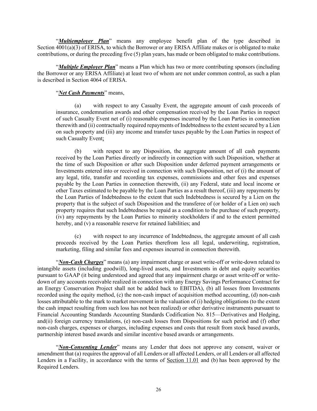 26 “Multiemployer Plan” means any employee benefit plan of the type described in Section 4001(a)(3) of ERISA, to which the Borrower or any ERISA Affiliate makes or is obligated to make contributions, or during the preceding five (5) plan years, has made or been obligated to make contributions. “Multiple Employer Plan” means a Plan which has two or more contributing sponsors (including the Borrower or any ERISA Affiliate) at least two of whom are not under common control, as such a plan is described in Section 4064 of ERISA. “Net Cash Payments” means, (a) with respect to any Casualty Event, the aggregate amount of cash proceeds of insurance, condemnation awards and other compensation received by the Loan Parties in respect of such Casualty Event net of (i) reasonable expenses incurred by the Loan Parties in connection therewith and (ii) contractually required repayments of Indebtedness to the extent secured by a Lien on such property and (iii) any income and transfer taxes payable by the Loan Parties in respect of such Casualty Event; (b) with respect to any Disposition, the aggregate amount of all cash payments received by the Loan Parties directly or indirectly in connection with such Disposition, whether at the time of such Disposition or after such Disposition under deferred payment arrangements or Investments entered into or received in connection with such Disposition, net of (i) the amount of any legal, title, transfer and recording tax expenses, commissions and other fees and expenses payable by the Loan Parties in connection therewith, (ii) any Federal, state and local income or other Taxes estimated to be payable by the Loan Parties as a result thereof, (iii) any repayments by the Loan Parties of Indebtedness to the extent that such Indebtedness is secured by a Lien on the property that is the subject of such Disposition and the transferee of (or holder of a Lien on) such property requires that such Indebtedness be repaid as a condition to the purchase of such property, (iv) any repayments by the Loan Parties to minority stockholders if and to the extent permitted hereby, and (v) a reasonable reserve for retained liabilities; and (c) with respect to any incurrence of Indebtedness, the aggregate amount of all cash proceeds received by the Loan Parties therefrom less all legal, underwriting, registration, marketing, filing and similar fees and expenses incurred in connection therewith. “Non-Cash Charges” means (a) any impairment charge or asset write-off or write-down related to intangible assets (including goodwill), long-lived assets, and Investments in debt and equity securities pursuant to GAAP (it being understood and agreed that any impairment charge or asset write-off or write- down of any accounts receivable realized in connection with any Energy Savings Performance Contract for an Energy Conservation Project shall not be added back to EBITDA), (b) all losses from Investments recorded using the equity method, (c) the non-cash impact of acquisition method accounting, (d) non-cash losses attributable to the mark to market movement in the valuation of (i) hedging obligations (to the extent the cash impact resulting from such loss has not been realized) or other derivative instruments pursuant to Financial Accounting Standards Accounting Standards Codification No. 815—Derivatives and Hedging, and(ii) foreign currency translations, (e) non-cash losses from Dispositions for such period and (f) other non-cash charges, expenses or charges, including expenses and costs that result from stock based awards, partnership interest based awards and similar incentive based awards or arrangements. “Non-Consenting Lender” means any Lender that does not approve any consent, waiver or amendment that (a) requires the approval of all Lenders or all affected Lenders, or all Lenders or all affected Lenders in a Facility, in accordance with the terms of Section 11.01 and (b) has been approved by the Required Lenders.